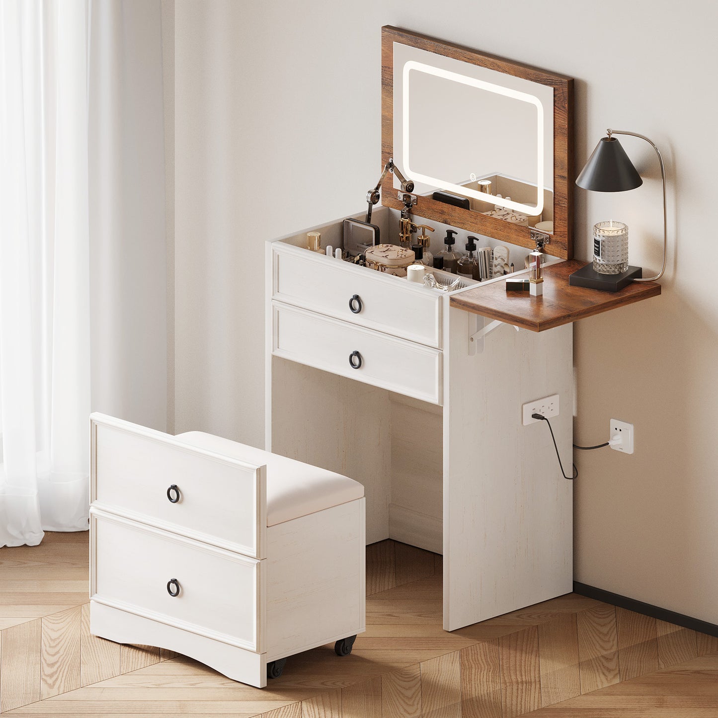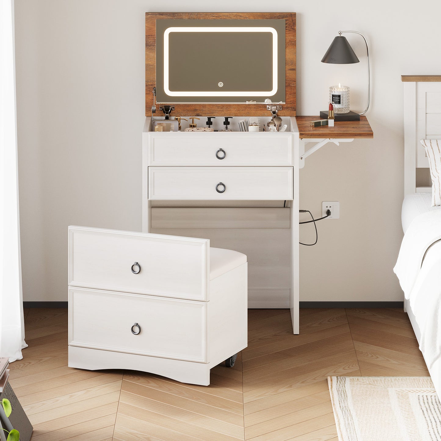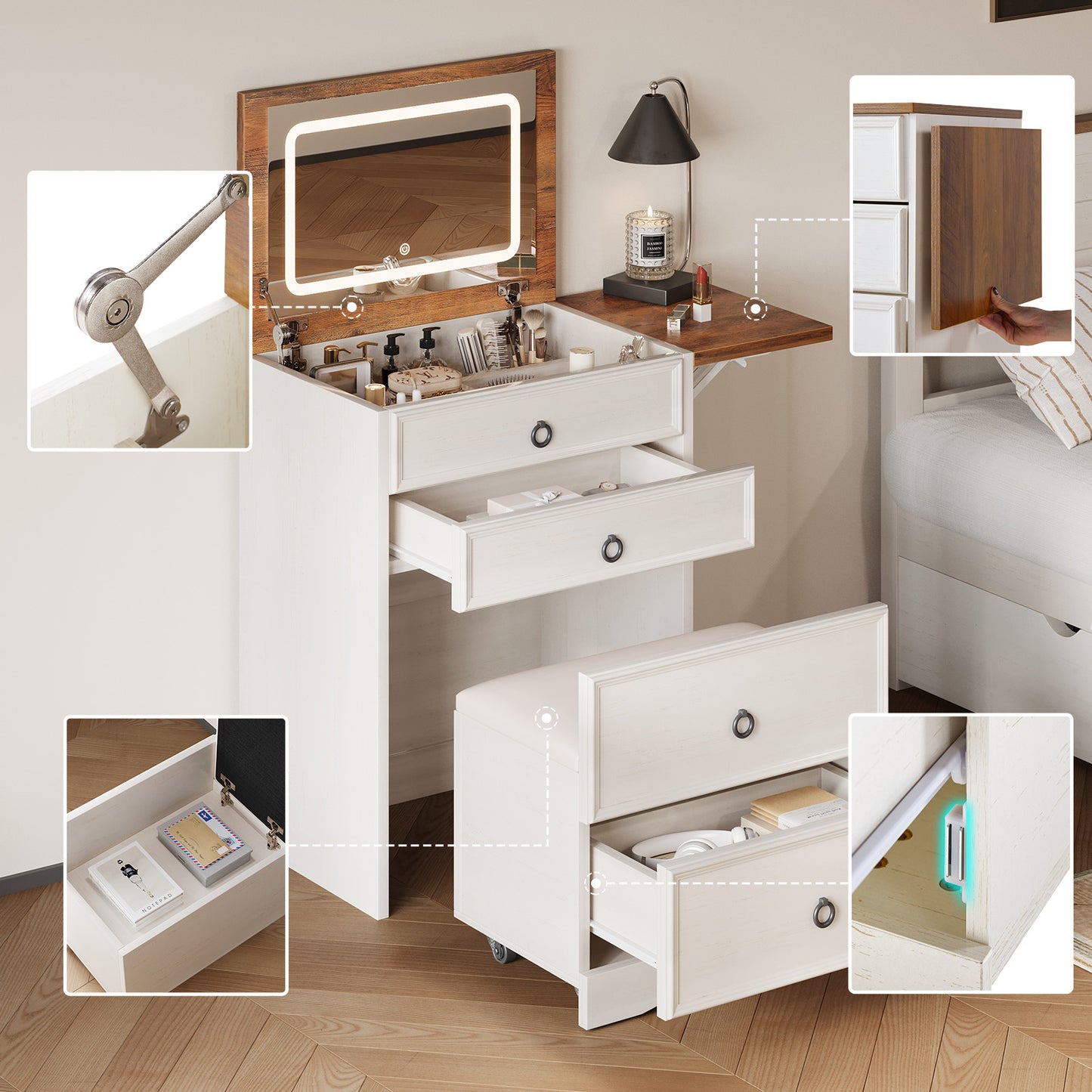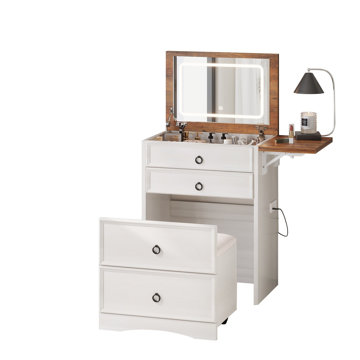 The Eyre 3 in 1 Makeup Vanity redefines versatility, functioning as a makeup vanity, sideboard, and table set to adapt seamlessly to any space. Featuring a sliding HD mirror with adjustable LED lights in cool white, warm white, and natural light, it ensures perfect illumination for your beauty routine. Thoughtfully designed with ample storage, it includes a flip-top jewelry case, a concealed compartment for taller items, a drawer, and a plush bench with an organizer tray to keep your essentials tidy. Built from durable wood with scratch-resistant glass and rust-proof metal, the 1" thick tabletop supports up to 50 lbs. Combining style and practicality, the Eyre vanity is easy to assemble with step-by-step instructions, making it the perfect addition to your home.
