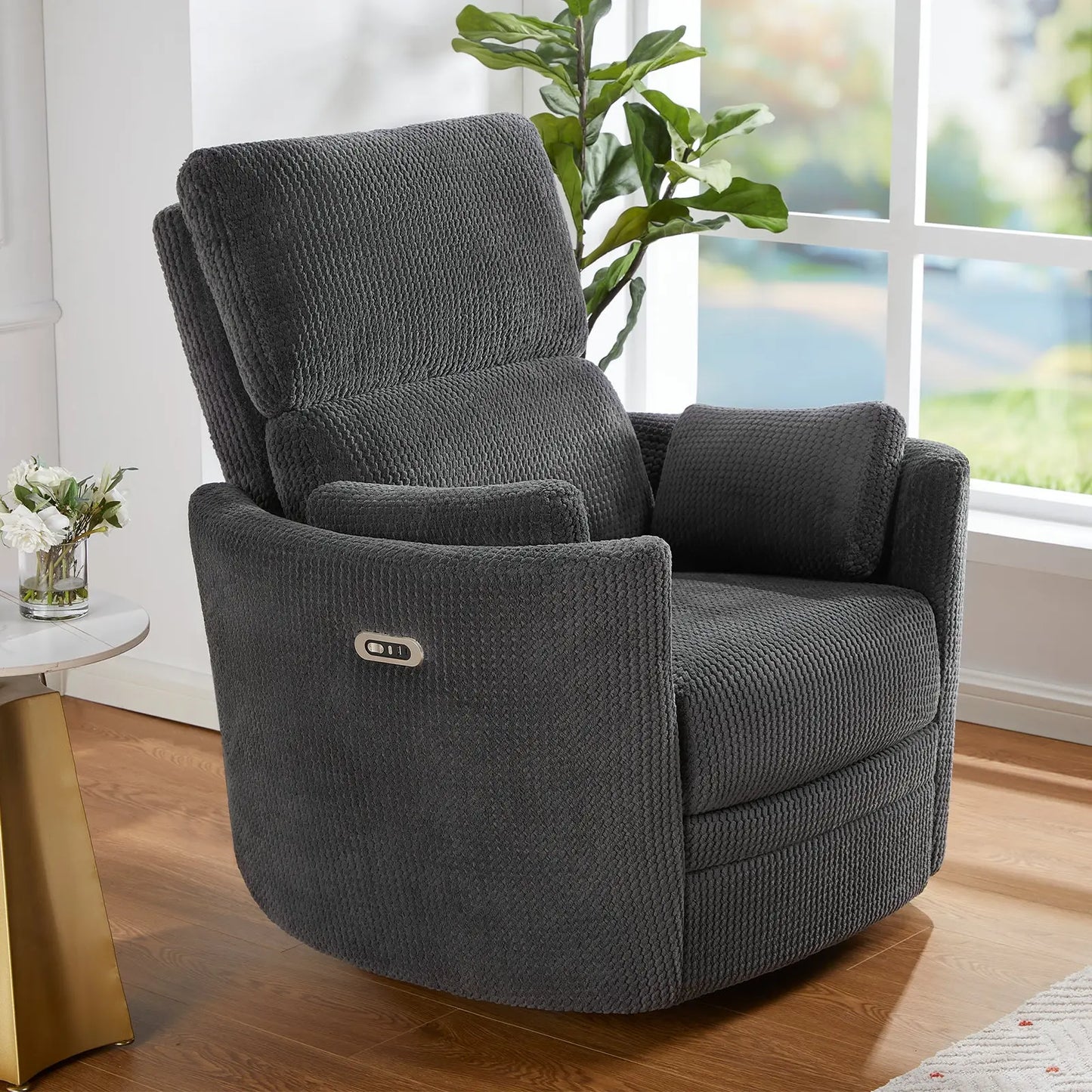 The Foss recliner chair offers a versatile and comfortable seating experience, featuring 270° swivel and 30° rocking capabilities. With a backrest that reclines up to 150° and adjustable footrest, it caters to your preferred position with ease. Designed for adults, seniors, and pregnant women, this chair is perfect for the bedroom, nursery, or office. It boasts high-density foam padding, soft towel fabric, and detachable pillows for unmatched comfort. The chair includes 4 massage points, USB and Type-C ports for device charging, and an extended footrest for full relaxation. Measuring 38.2"W x 37"D x 41"H, the Foss chair supports up to 350 pounds with a durable metal frame. Easy, tool-free assembly ensures you can start enjoying its benefits in just 10 minutes.