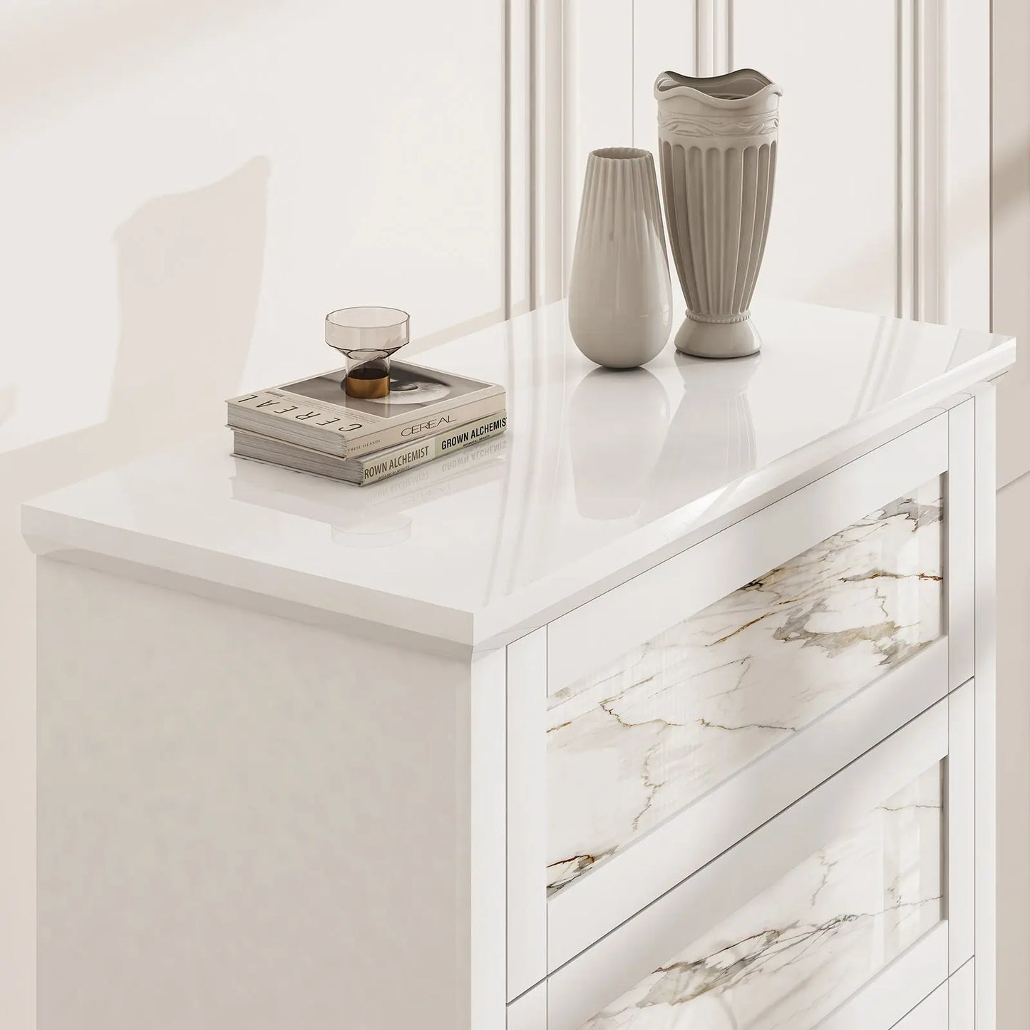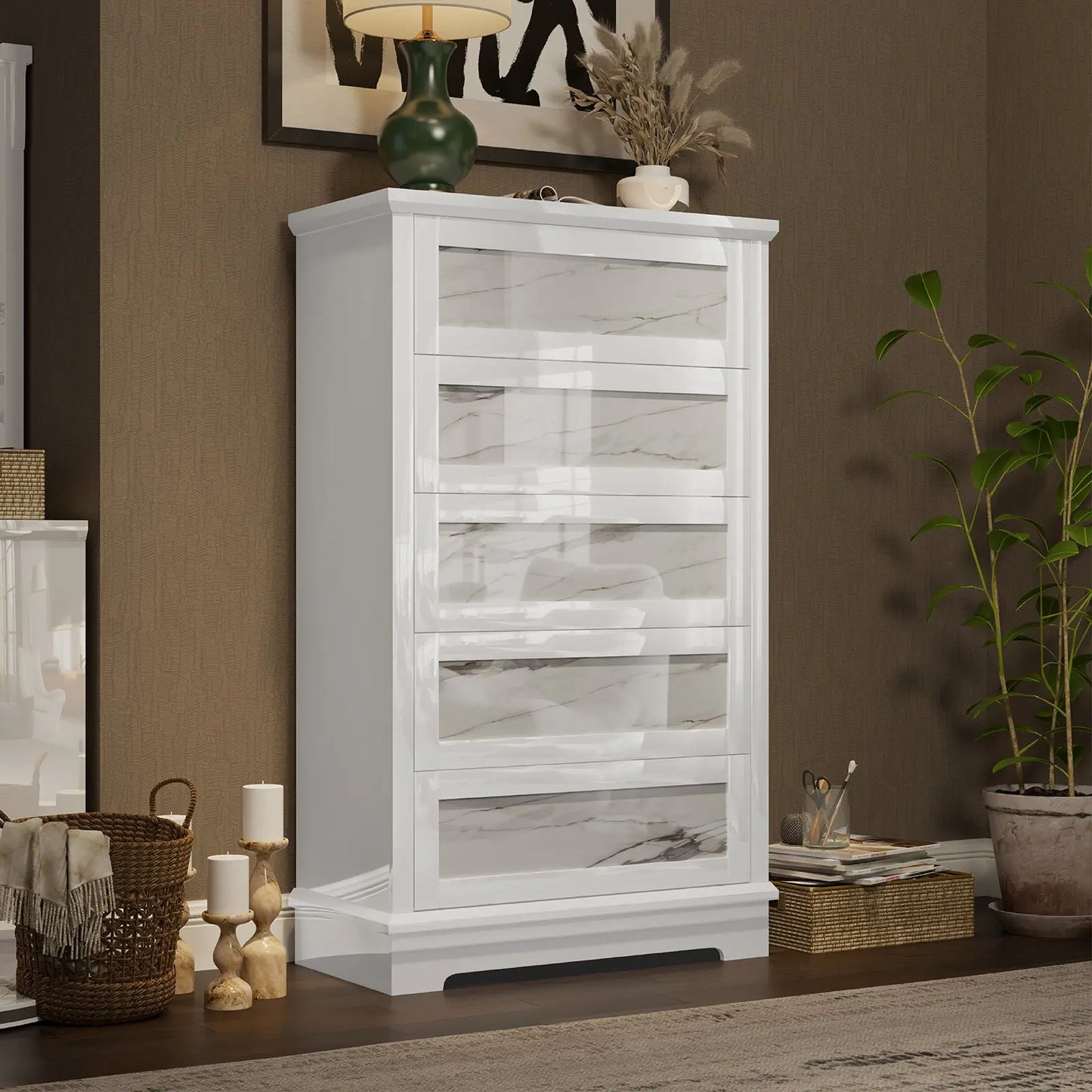 This sleek and modern dresser features a natural marble top and high gloss finish, adding a touch of luxury to any space. With push latch drawers, organizing your belongings has never been easier. Elevate your decor with Galala 5-Drawers Dresser!