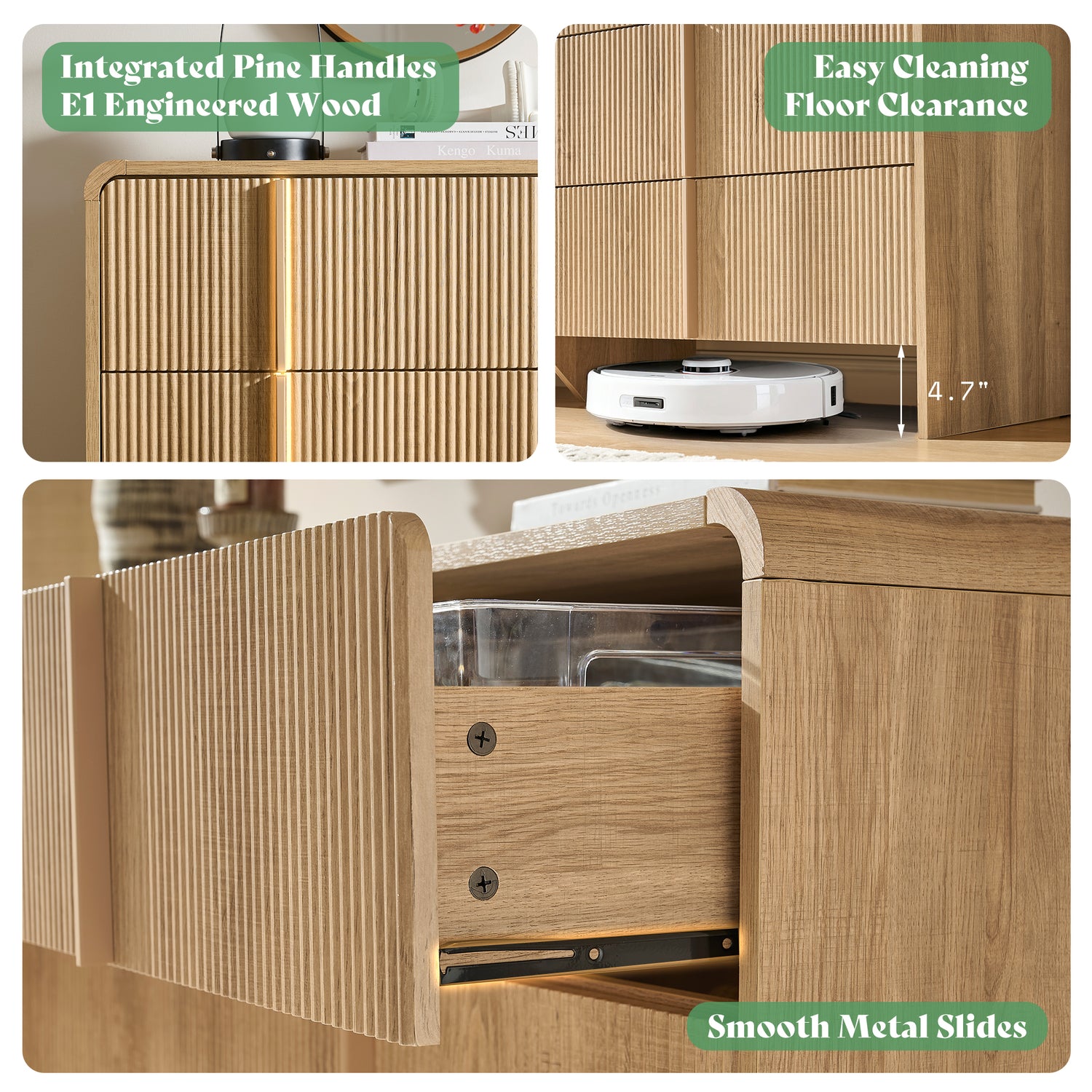 Anti-tip safety features and rounded corners ensure stability and prevent accidents, while the E1-grade engineered wood construction offers long-lasting durability.
