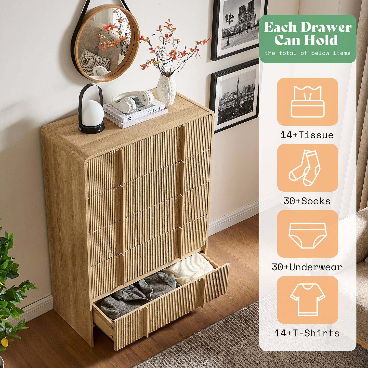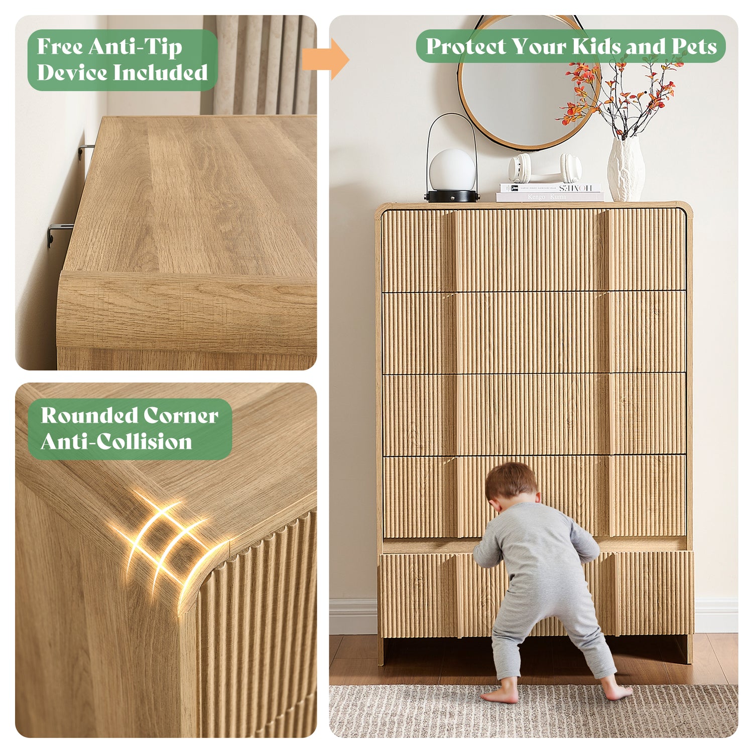 This 48" tall 5-drawer dresser combines modern design with natural elegance. Featuring solid pine handles, fluted fronts, and rounded corners, it provides stylish storage for clothes and accessories. The anti-tip safety system ensures stability, while smooth-glide drawers offer easy access. Crafted with durable engineered wood, this dresser is ideal for bedrooms, living rooms, or nurseries. Easy to assemble in under an hour.