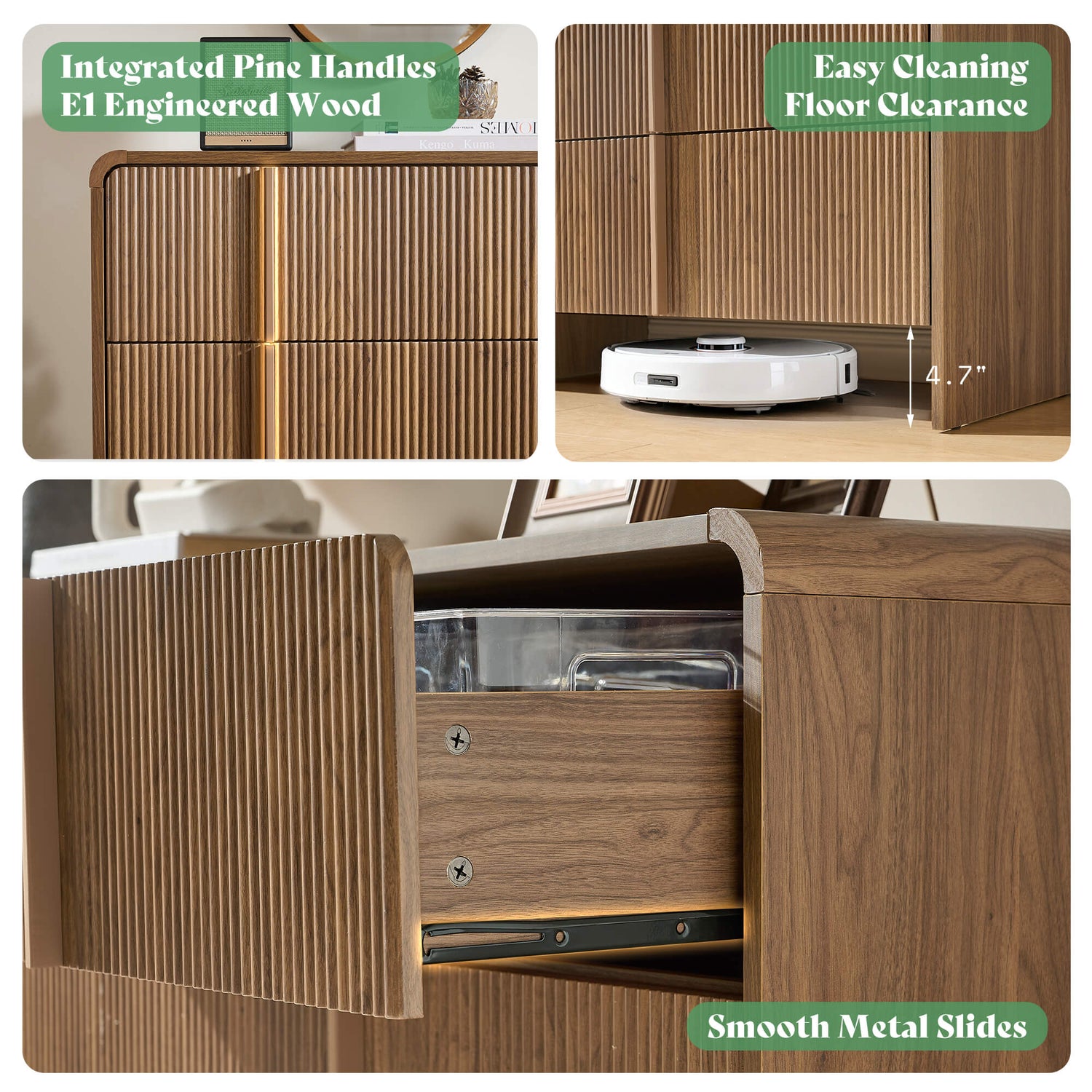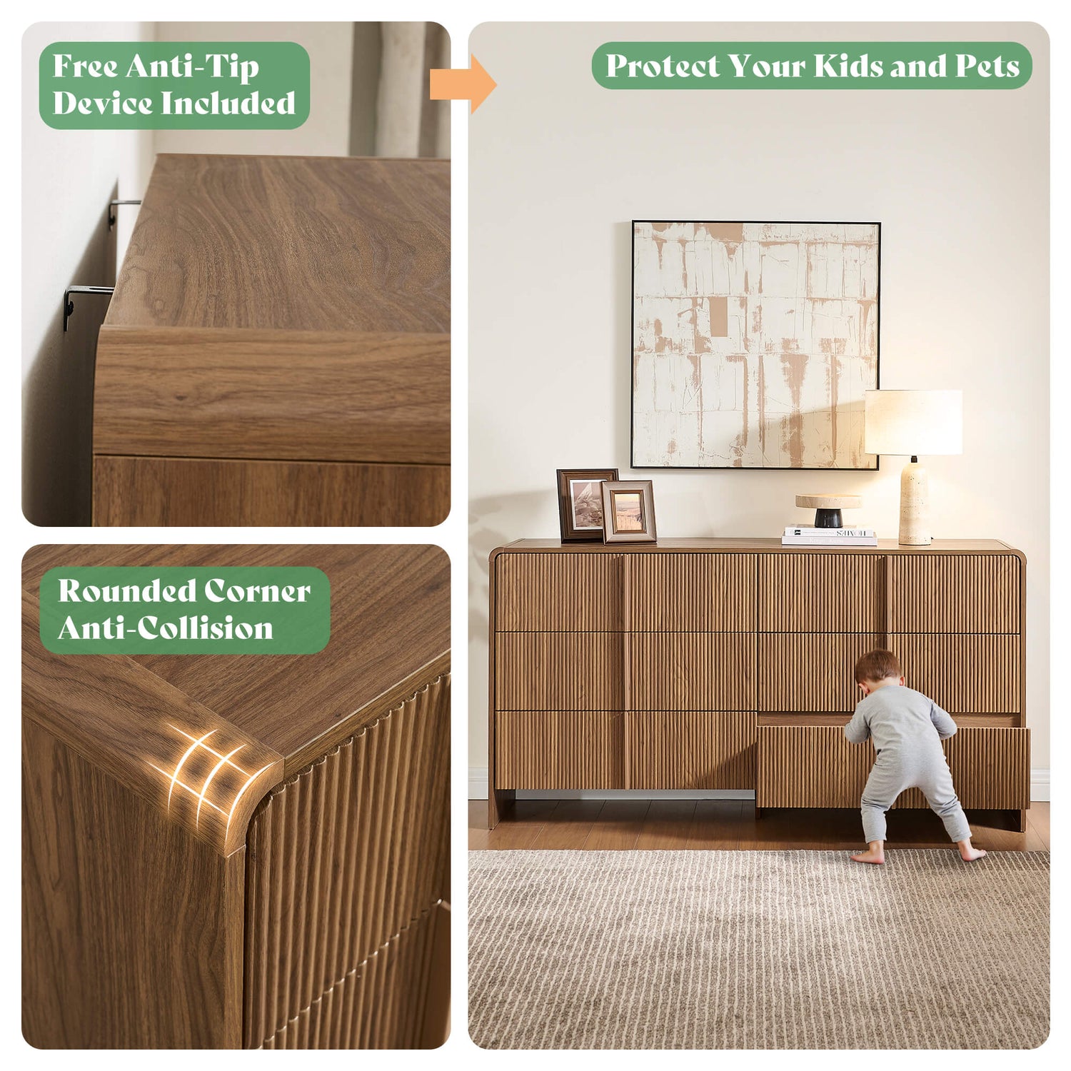 This 63" wide 6-drawer dresser combines modern design with functional storage. Featuring solid pine handles, fluted fronts, and rounded corners, it offers ample space for clothes and accessories while adding sophistication to your space. The wide top is perfect for displaying decor, and the anti-tip system ensures stability, making it safe for families. Made from durable E1-grade engineered wood, this dresser is built to last. Assembly is quick and easy with included instructions.