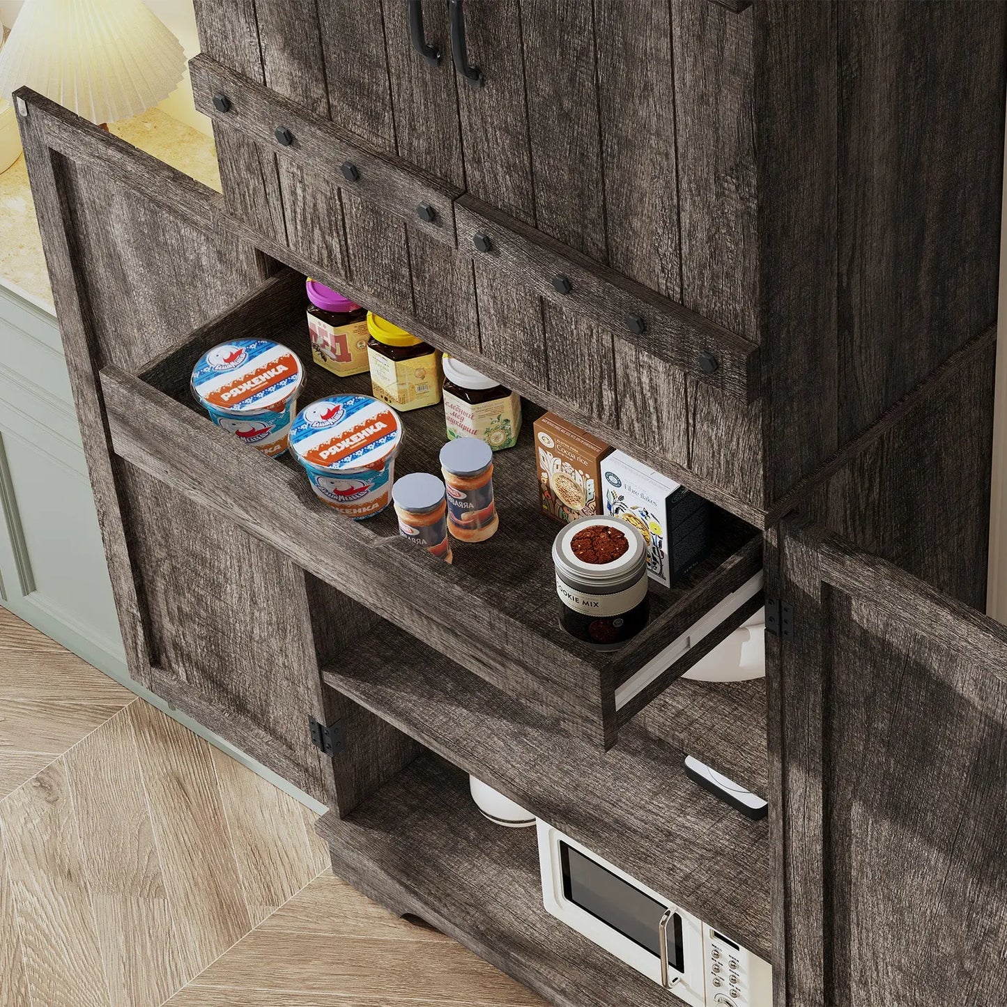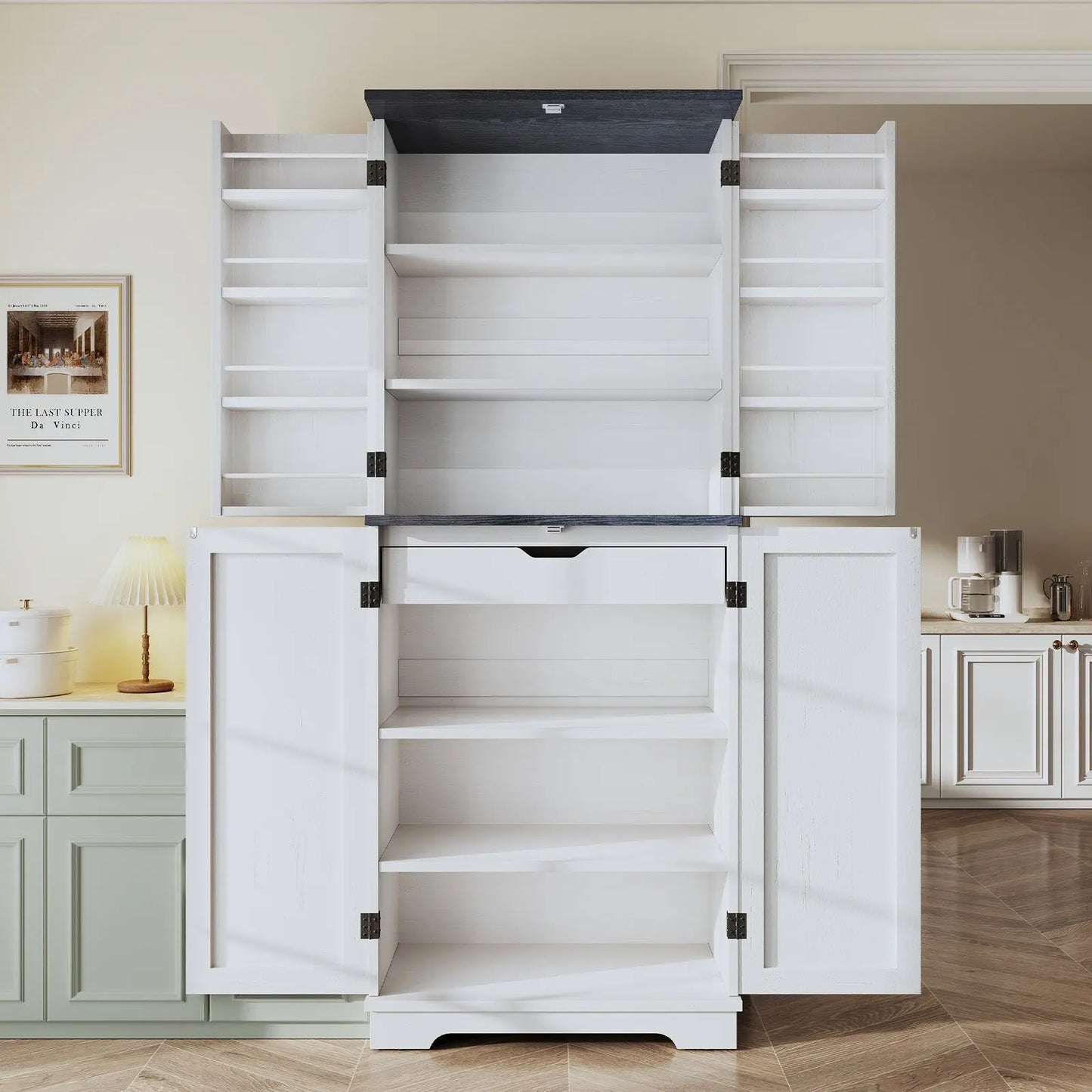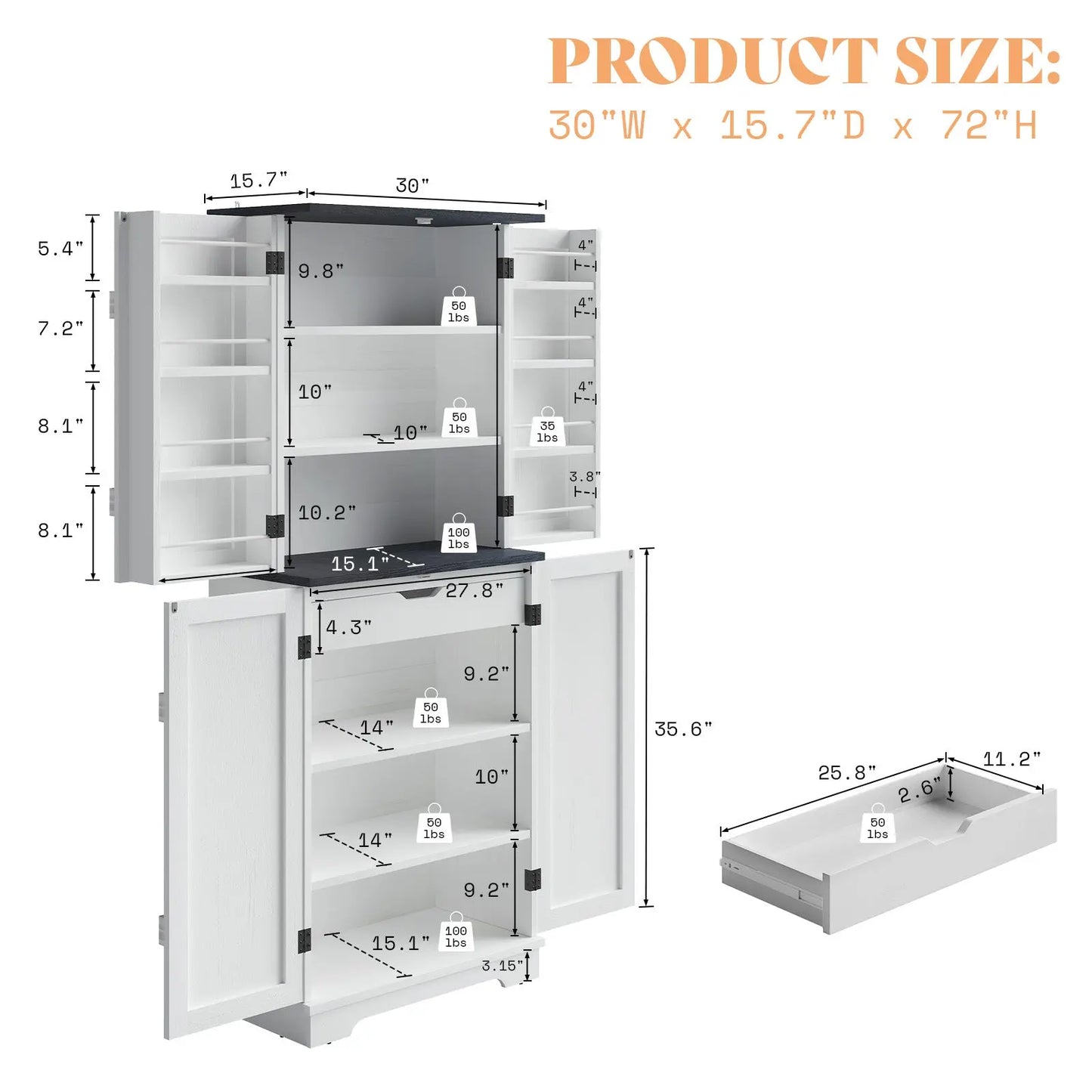 Our kitchen pantry has a double-layer storage cabinet, a large hidden drawer, 8 storage organizers on the pantry doors, and 2 adjustable shelves, which can flexibly store food, Kitchenware, and tableware according to your daily needs.