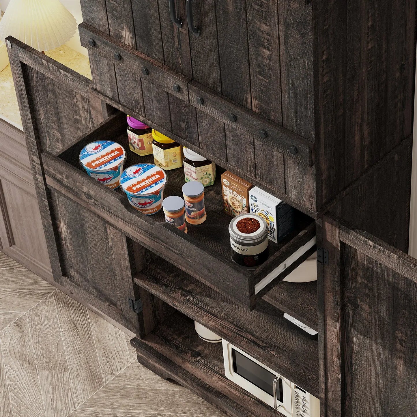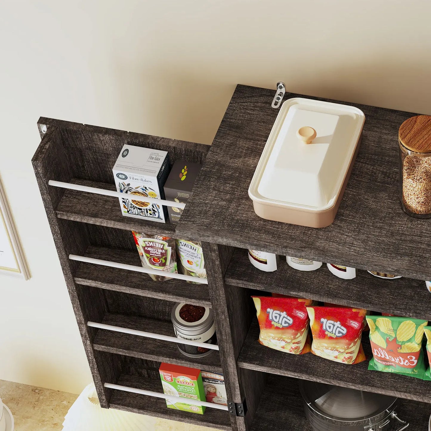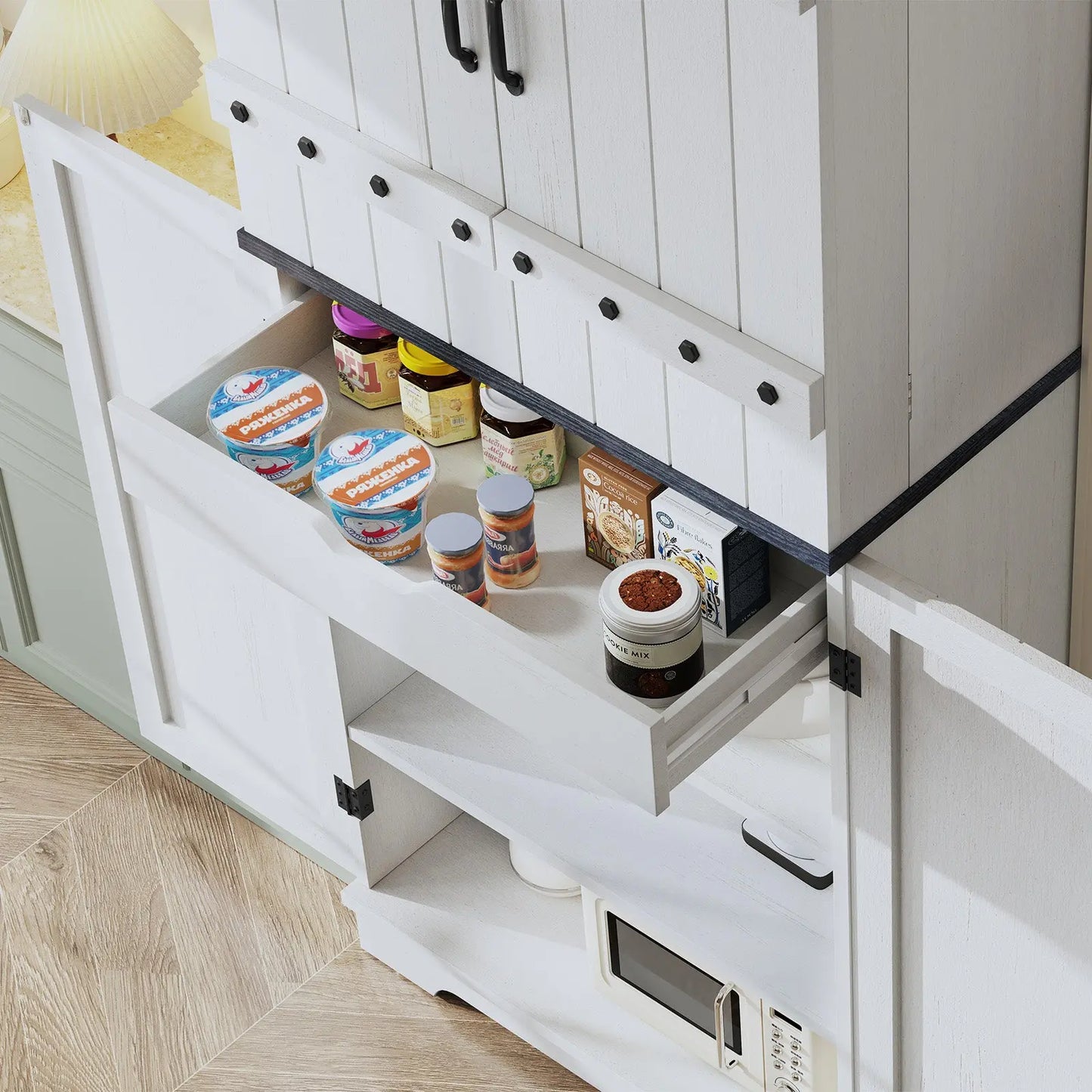 Our kitchen pantry has a double-layer storage cabinet, a large hidden drawer, 8 storage organizers on the pantry doors, and 2 adjustable shelves, which can flexibly store food, Kitchenware, and tableware according to your daily needs.