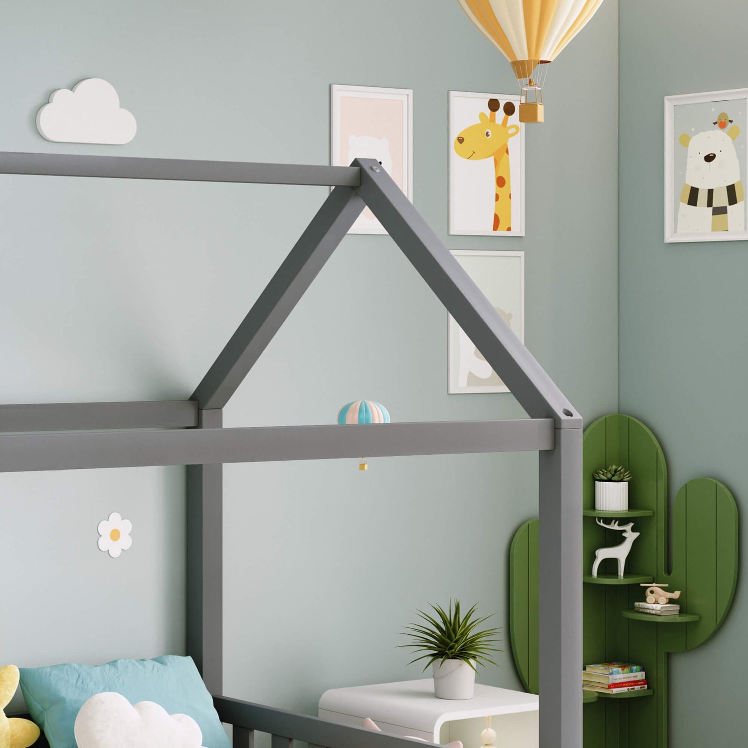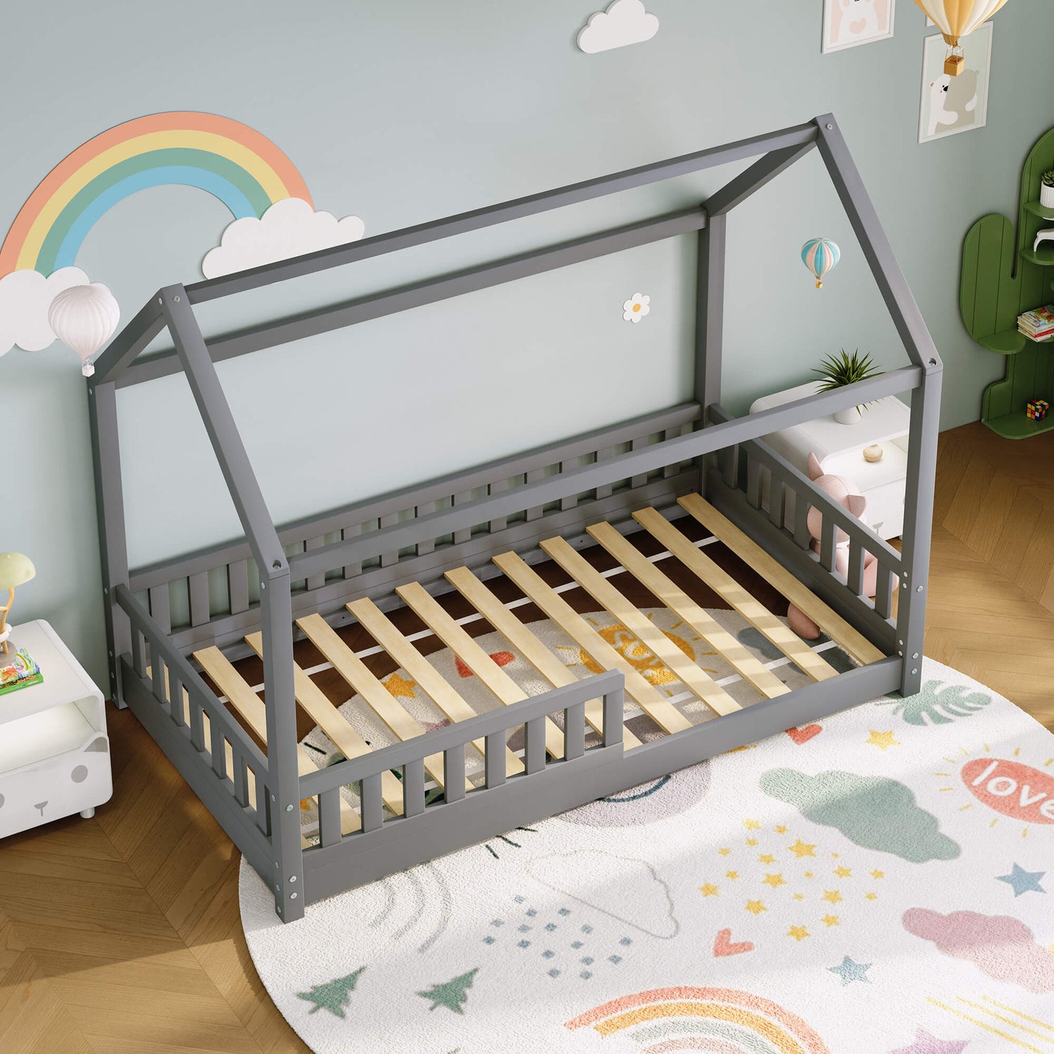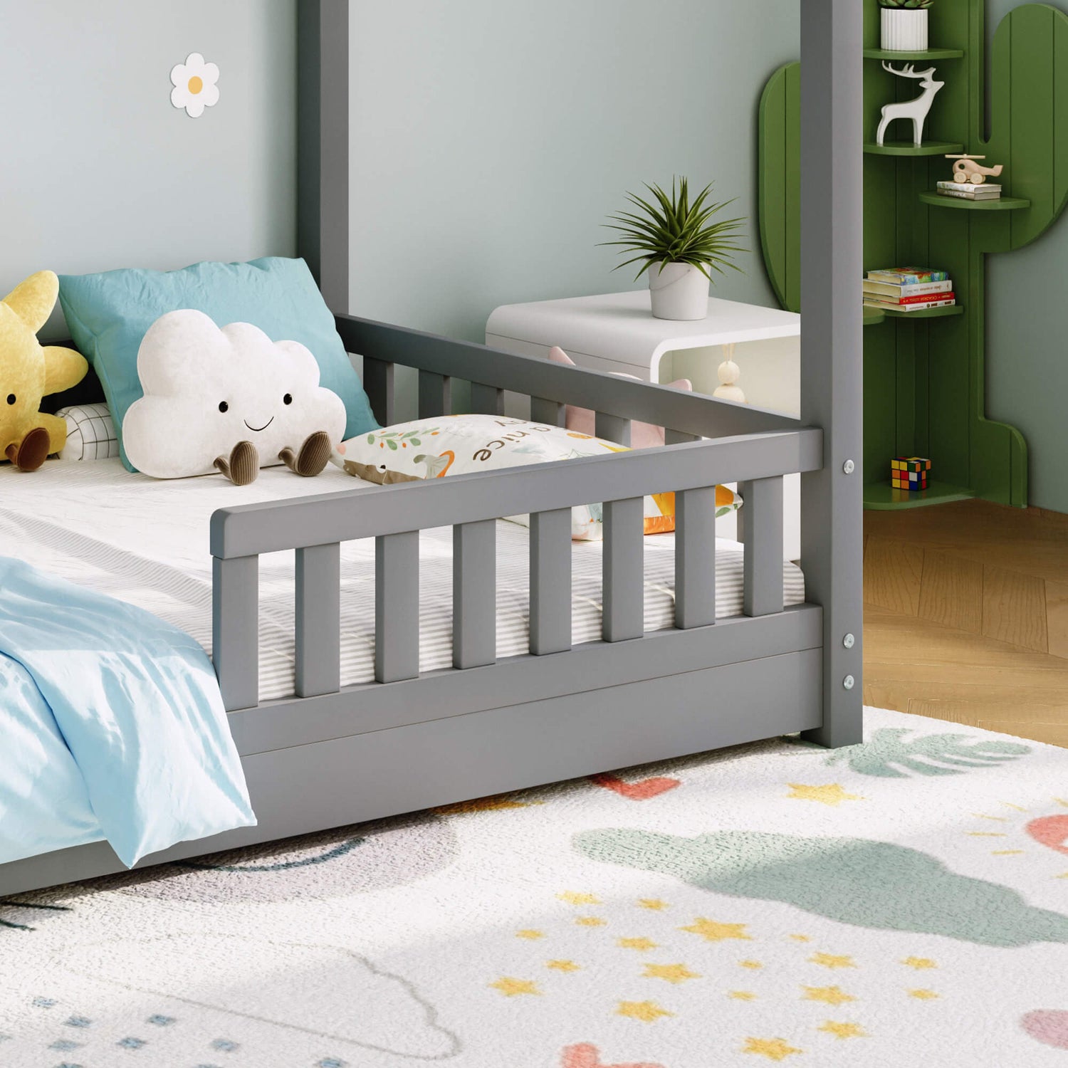 Create a safe and inspiring sleep space with this twin-size Montessori house bed. Designed with full-length guardrails and a low-to-the-floor structure, it supports your child’s independence while keeping them secure. The charming house-shaped roof encourages imaginative play, while the solid wood construction and child-safe finish ensure long-lasting comfort, safety, and everyday fun.