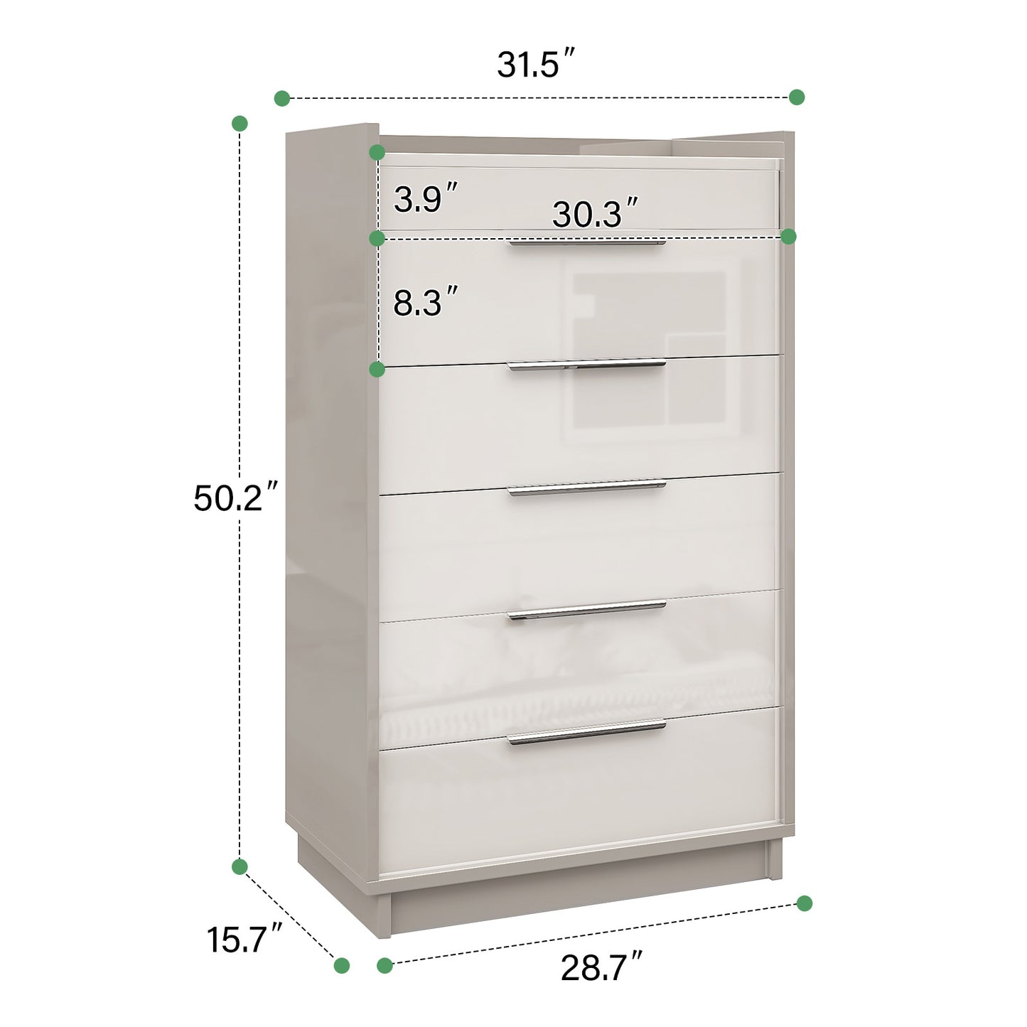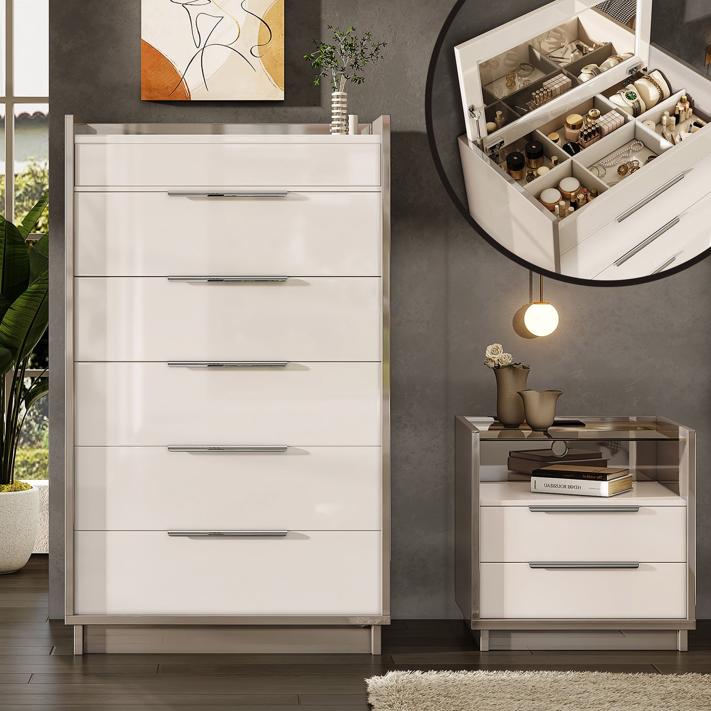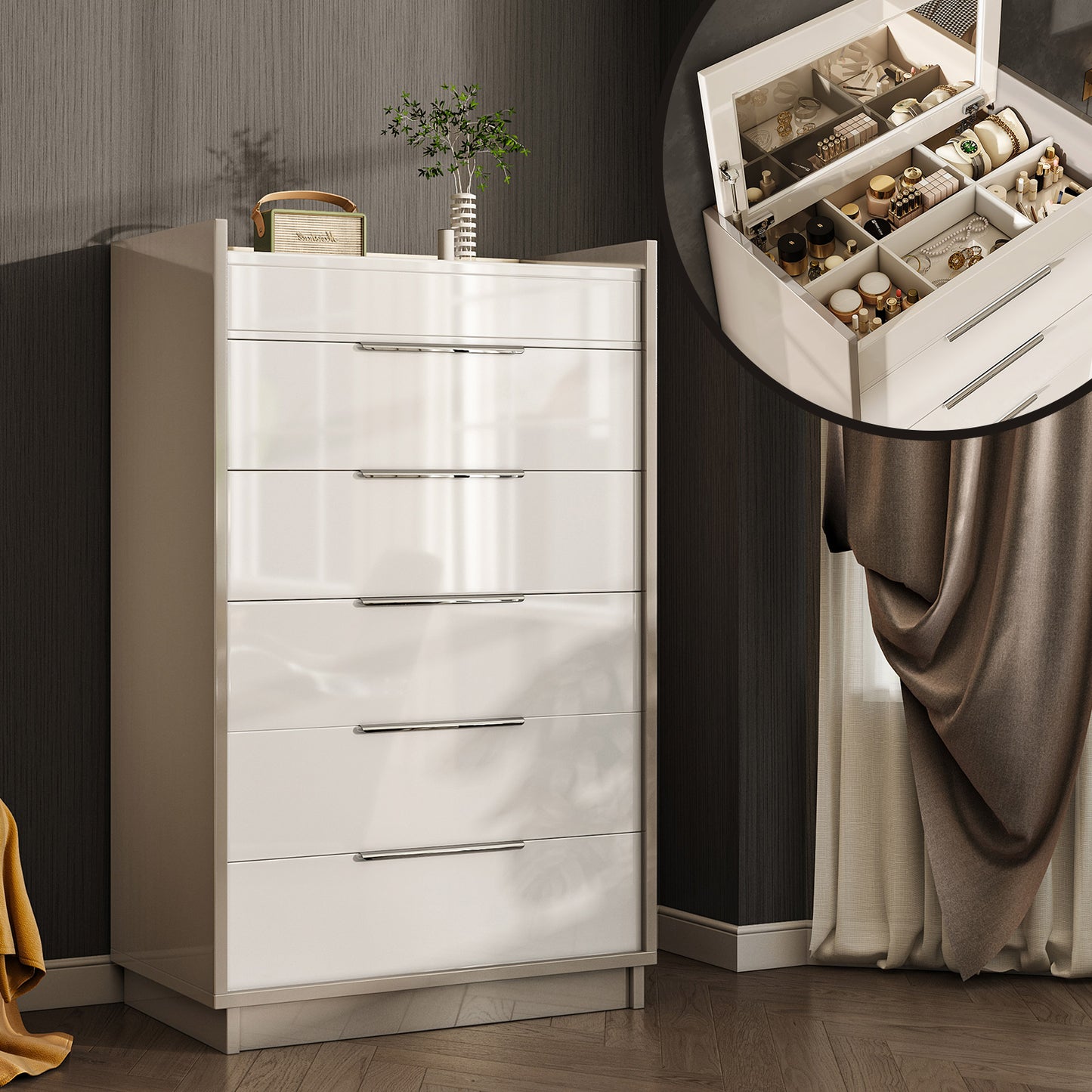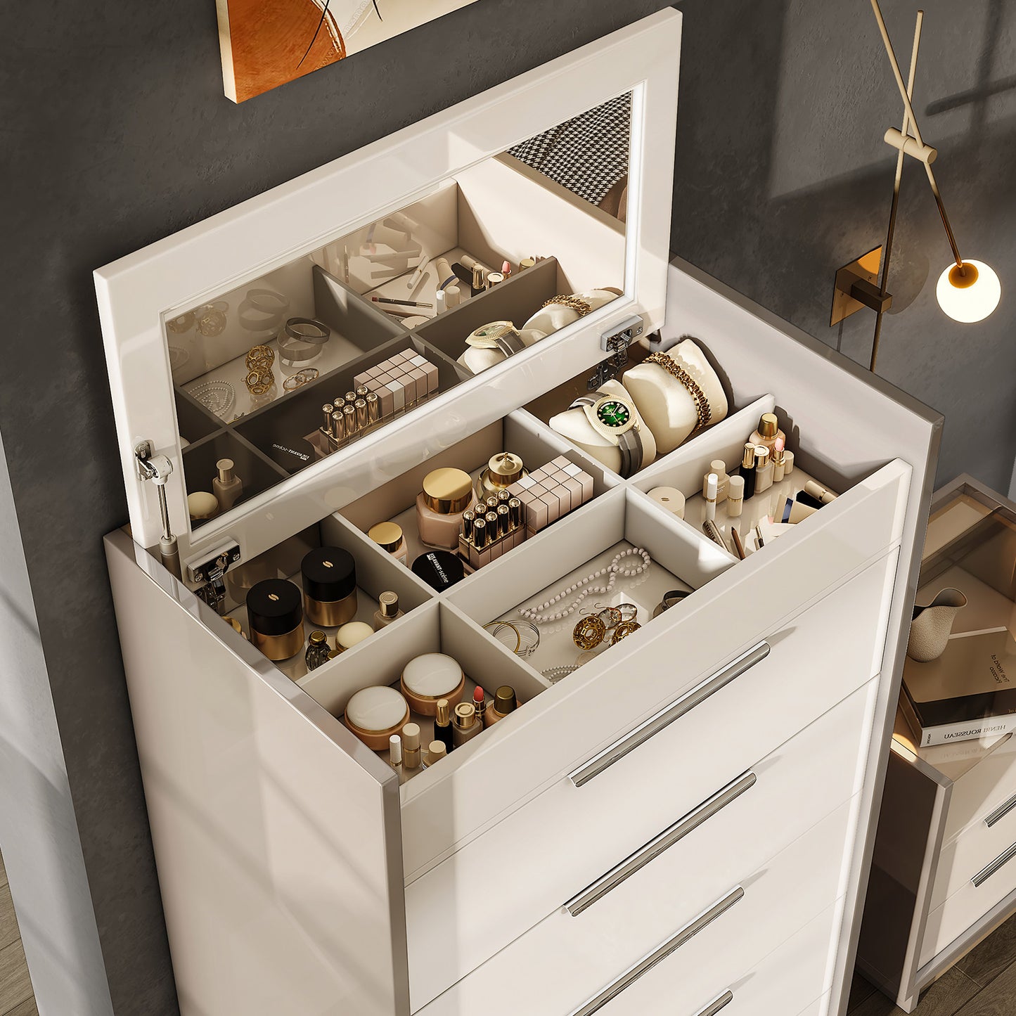 The Kino 5-Drawers Dresser blends modern elegance with practical functionality, making it a perfect addition to any bedroom. Featuring a sleek high-gloss finish with unique contrasting colors, it adds a dynamic and stylish touch to your space. With five spacious drawers and six partitioned storage compartments, it offers ample room to keep your belongings organized. The innovative 2-in-1 flip-top mirror doubles as a dressing mirror when open and a visible glass tabletop when closed, combining style and convenience. Built from durable wood with a stable support base, the Kino Dresser ensures long-lasting use and floor protection.