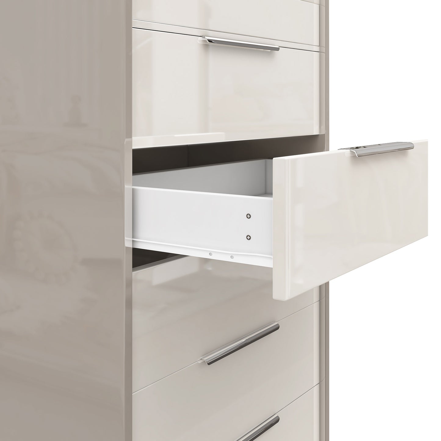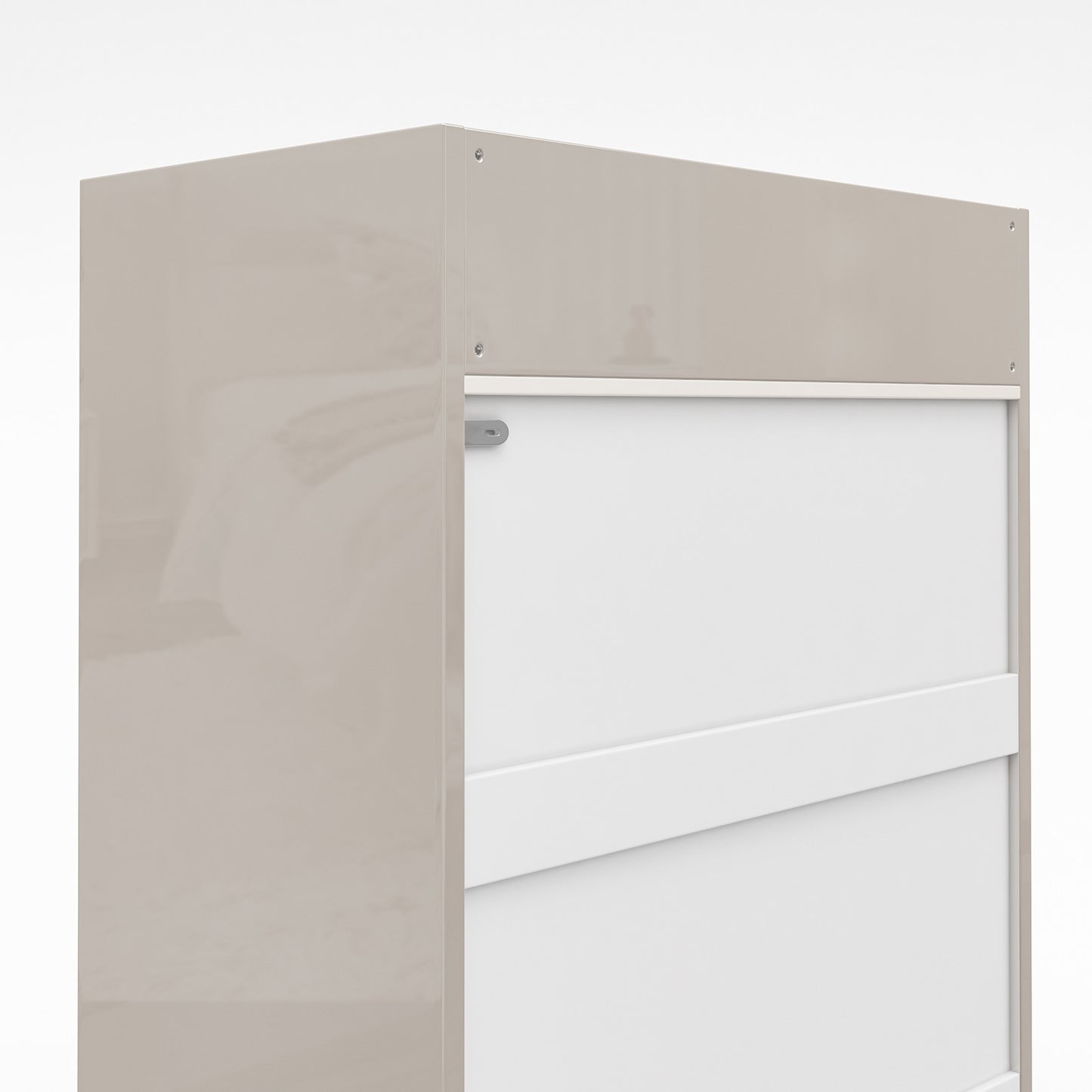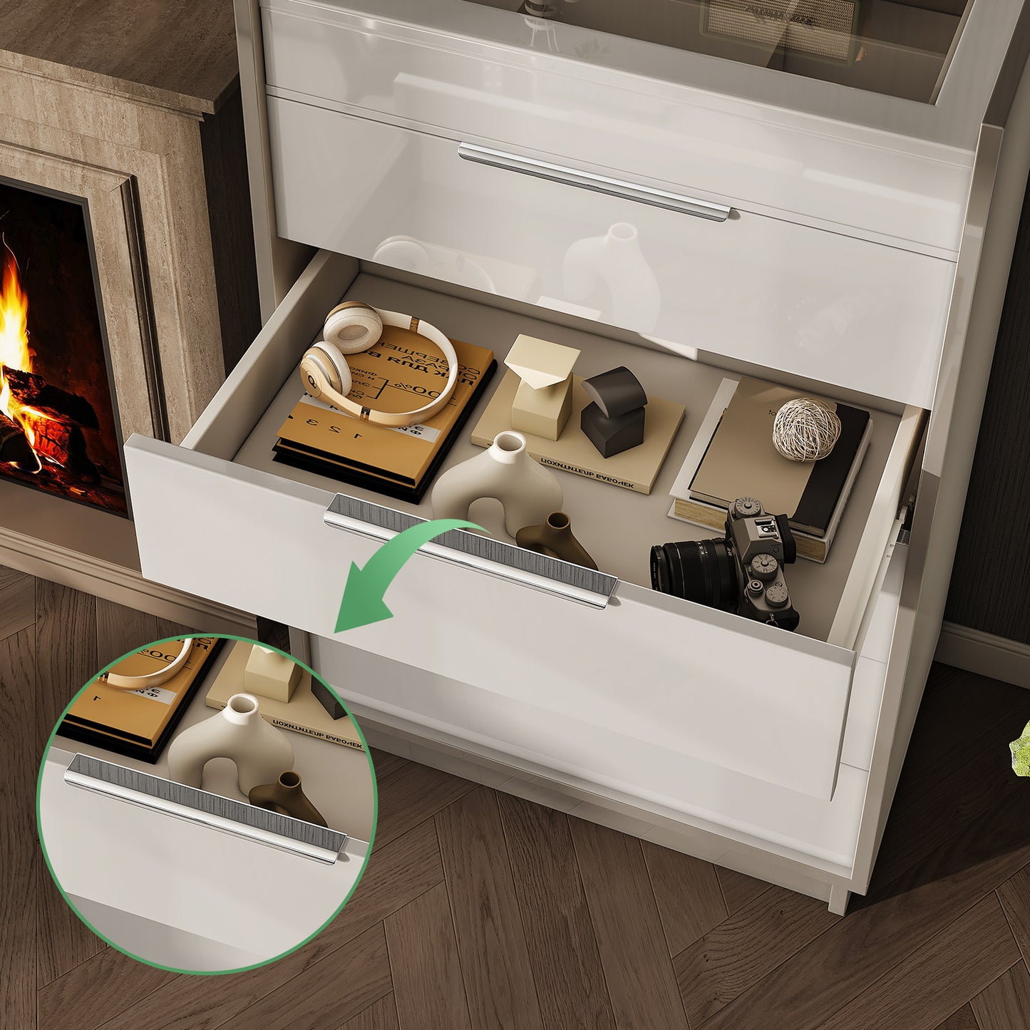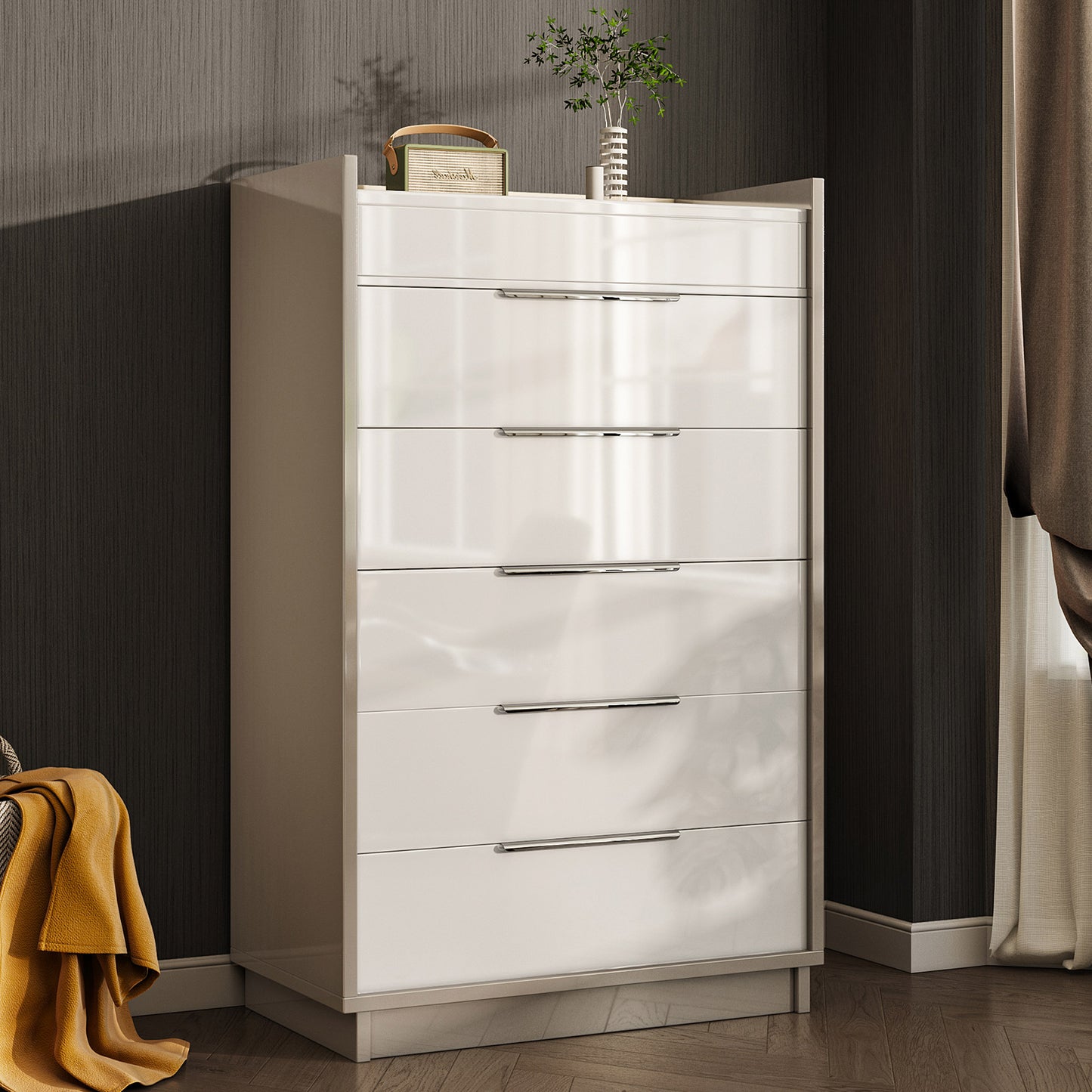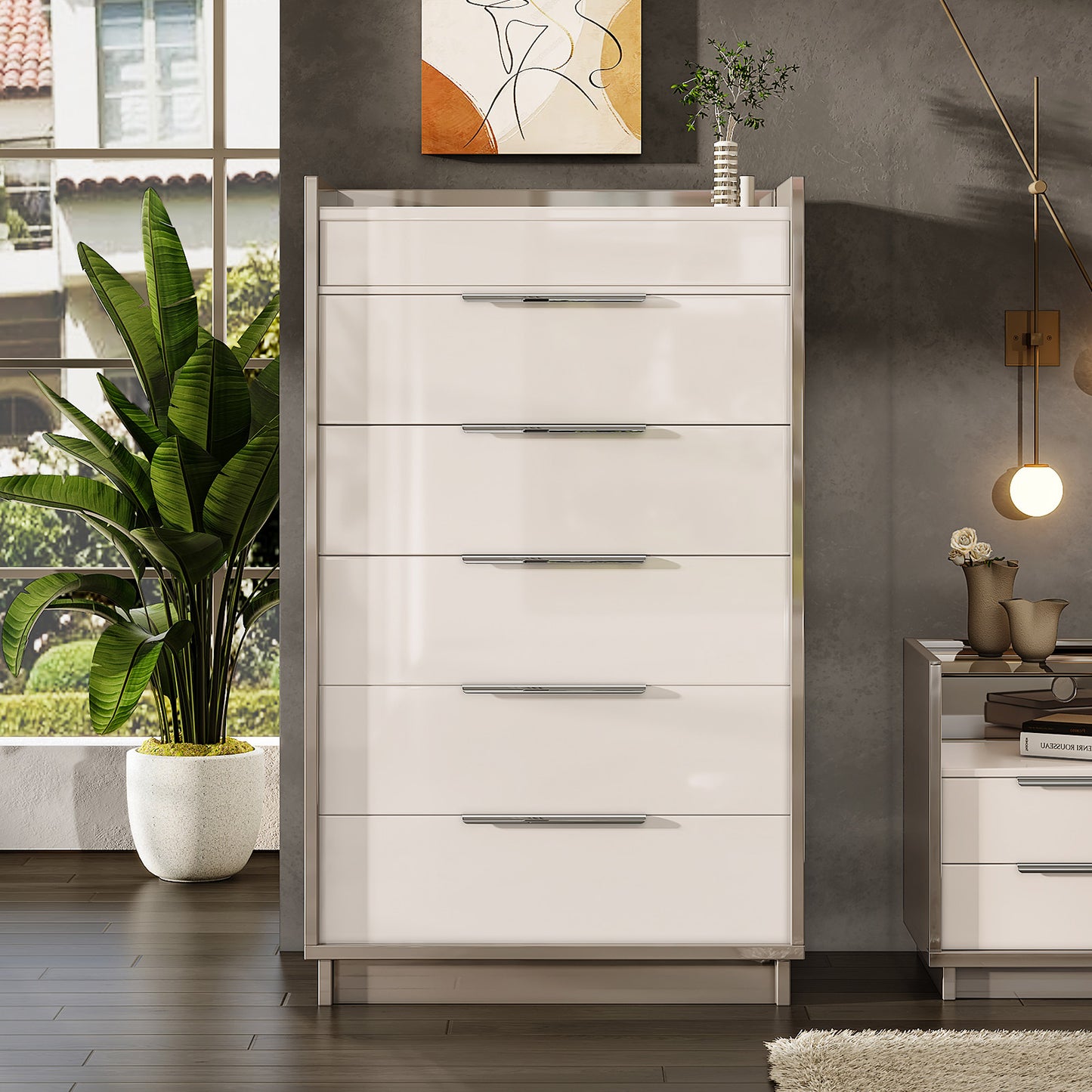 The Kino 5-Drawers Dresser blends modern elegance with practical functionality, making it a perfect addition to any bedroom. Featuring a sleek high-gloss finish with unique contrasting colors, it adds a dynamic and stylish touch to your space. With five spacious drawers and six partitioned storage compartments, it offers ample room to keep your belongings organized. The innovative 2-in-1 flip-top mirror doubles as a dressing mirror when open and a visible glass tabletop when closed, combining style and convenience. Built from durable wood with a stable support base, the Kino Dresser ensures long-lasting use and floor protection.