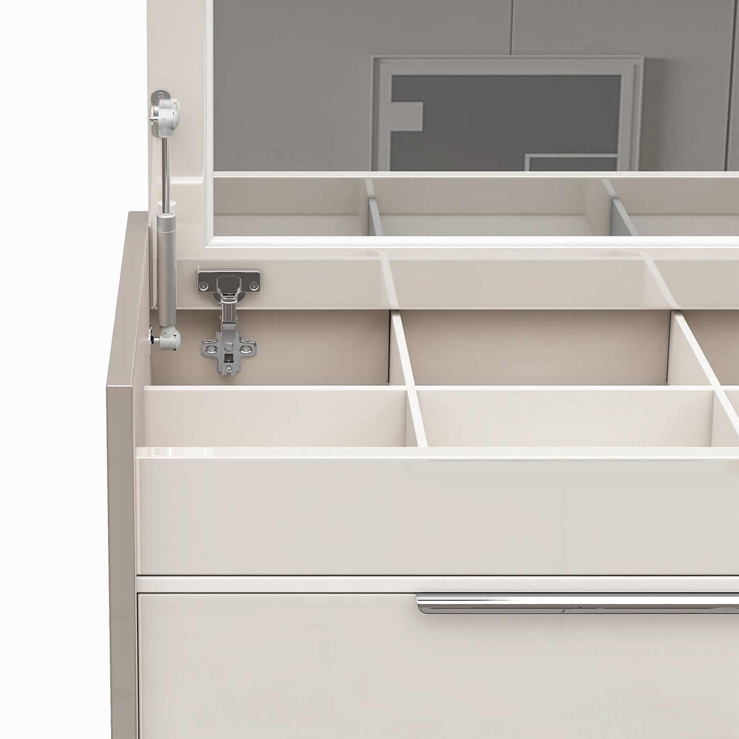 The 2-in-1 mirror adopts a flip-top design. When flipped down, Visible glass tabletop offers a clear view of stored items. When flipped up, it can be used as a dressing mirror for your convenience.