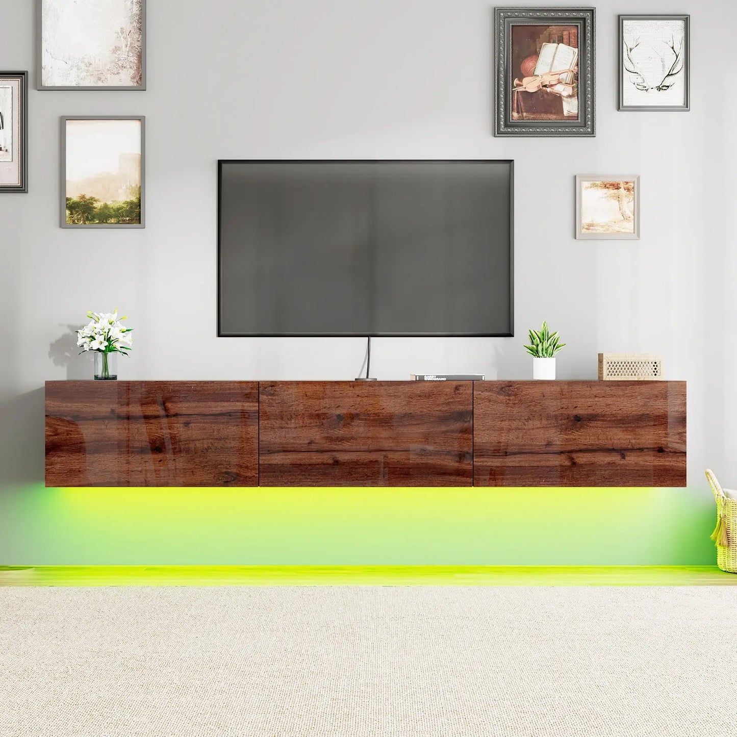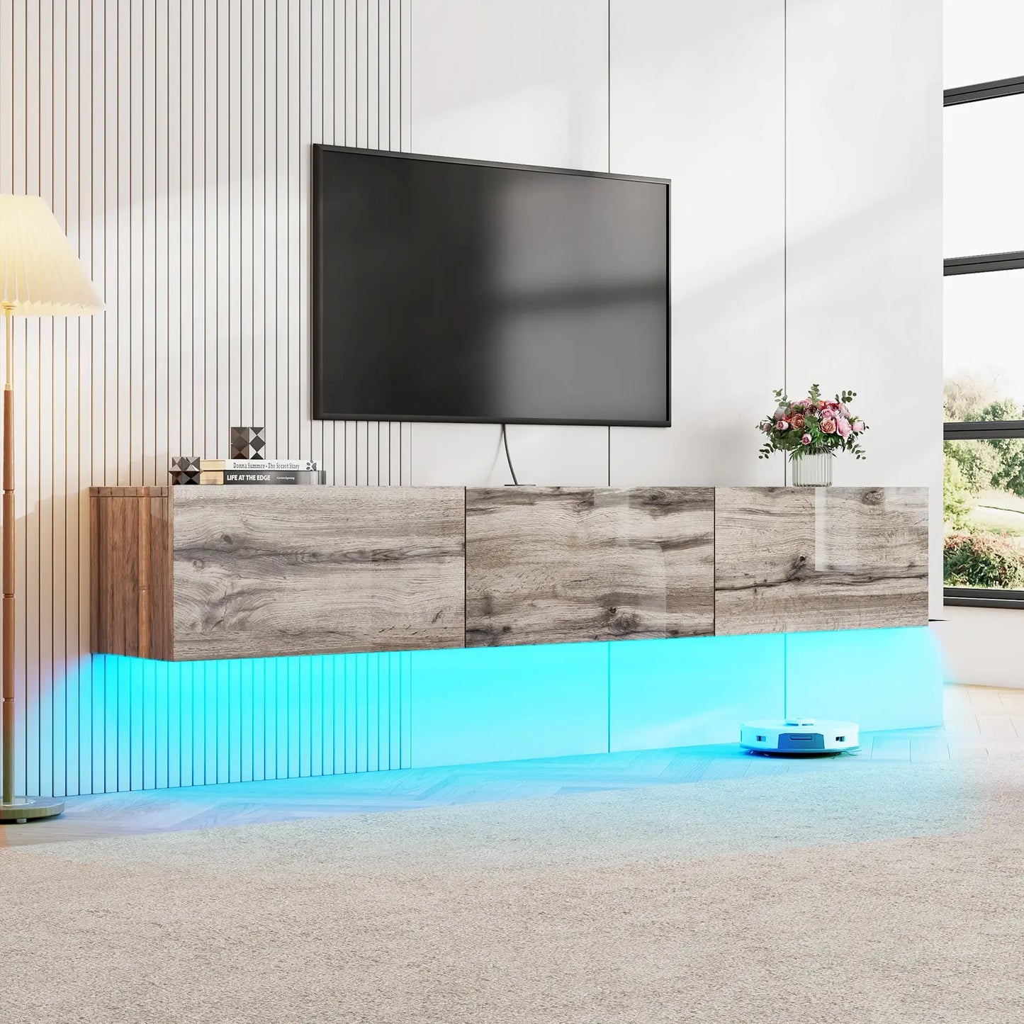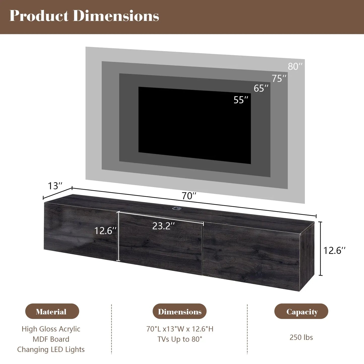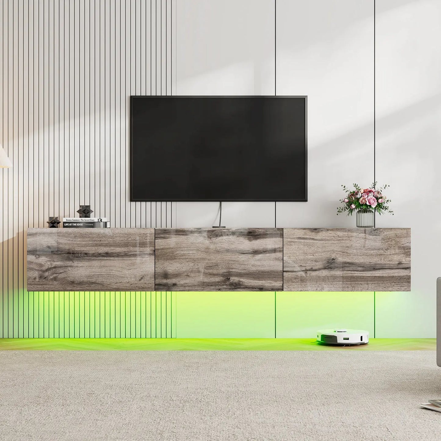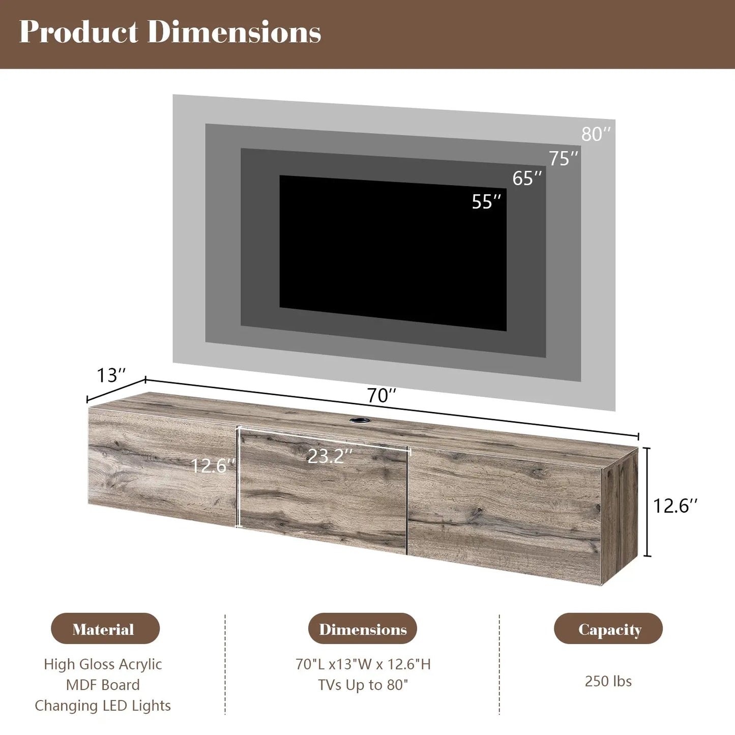 70" Woodgrain High Gloss Floating TV Stand features a stunning wood grain finish and customizable smart LED lights for a vibrant atmosphere. It includes a charging station with outlets and USB ports, plus three storage drawers to keep your space organized. The wall-mounted design saves floor space, making it perfect for any room.