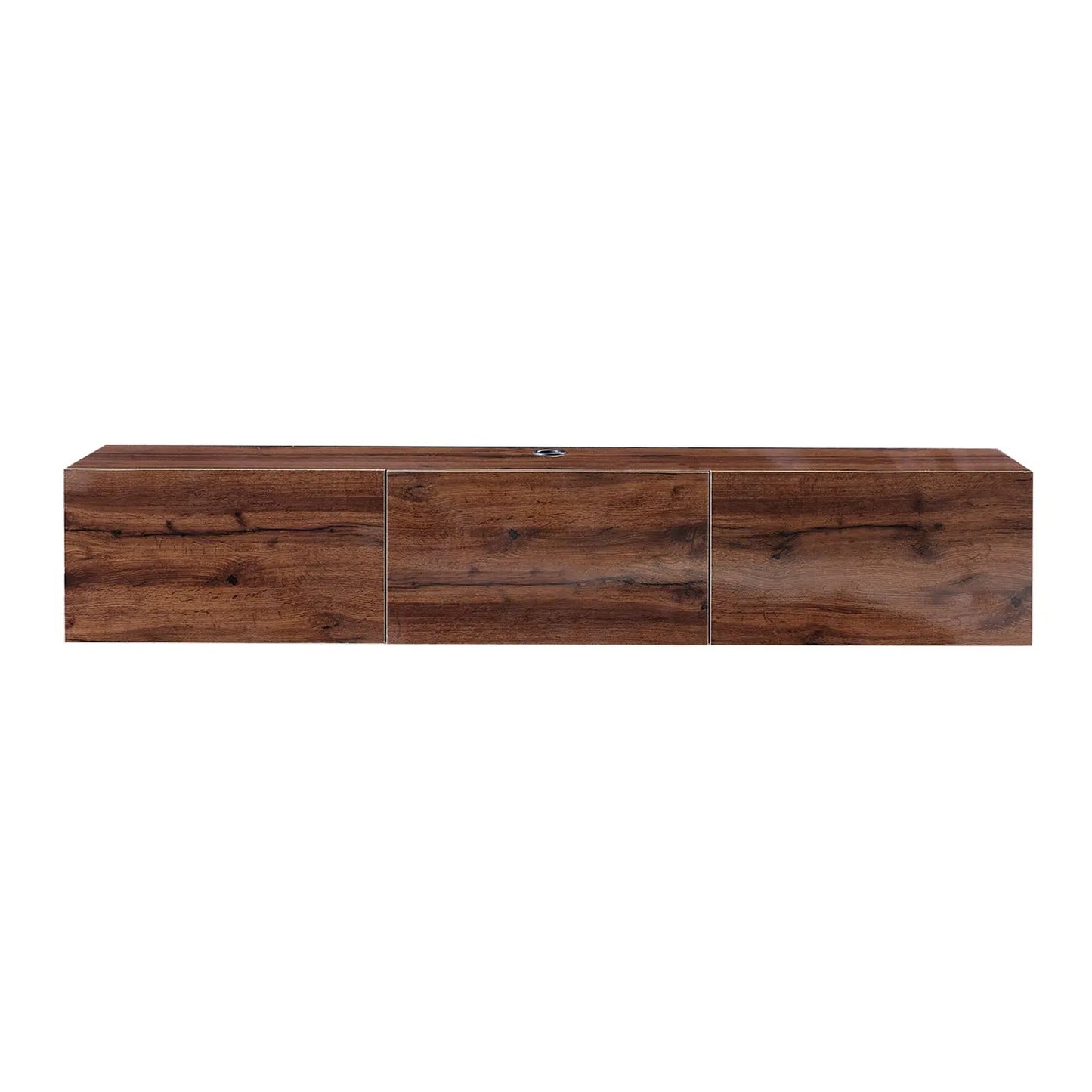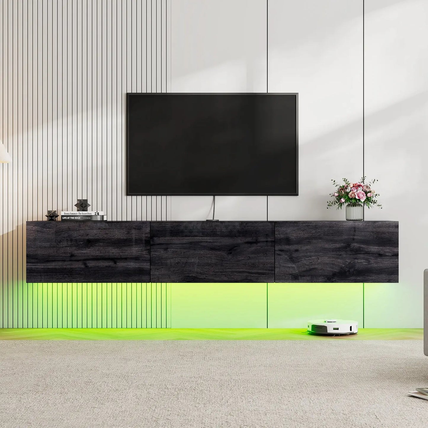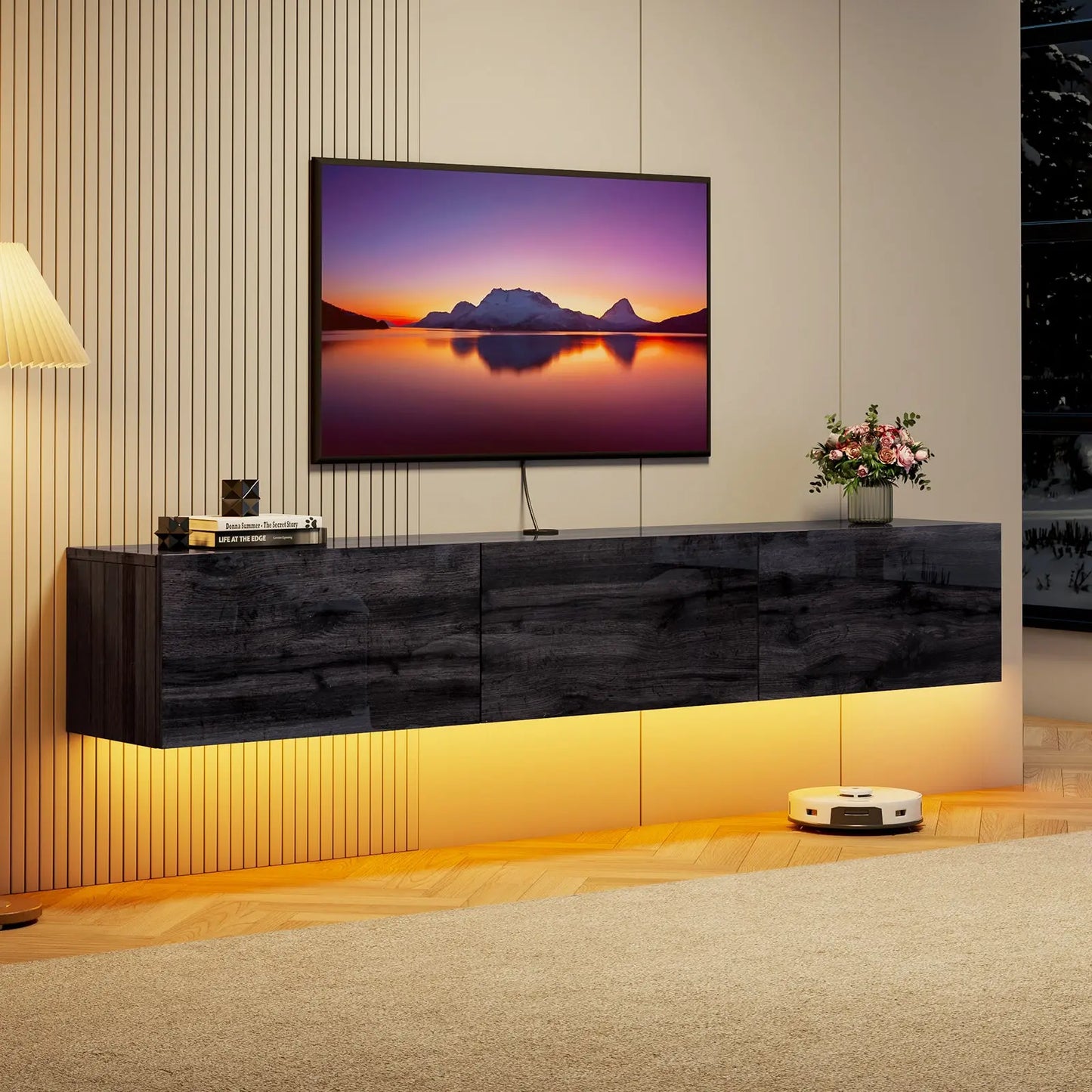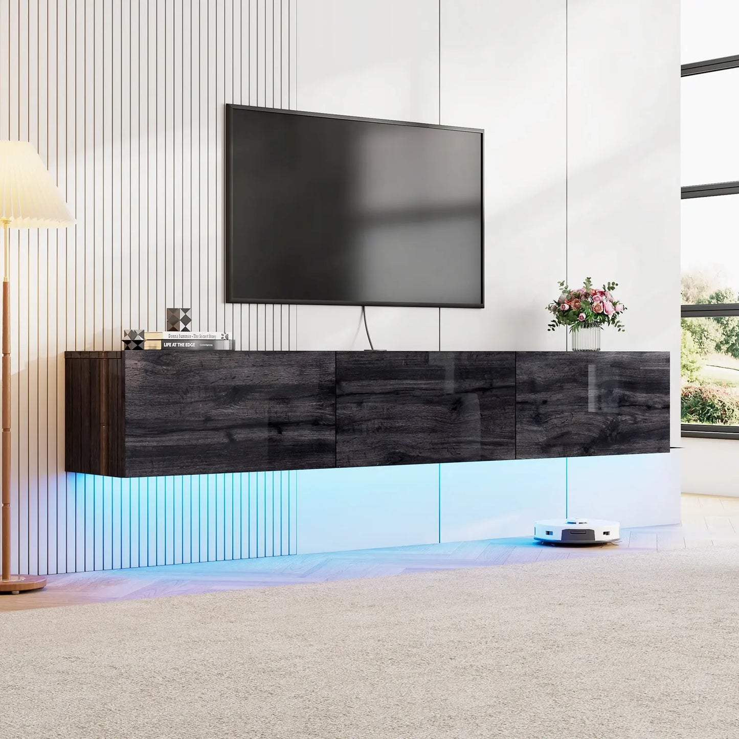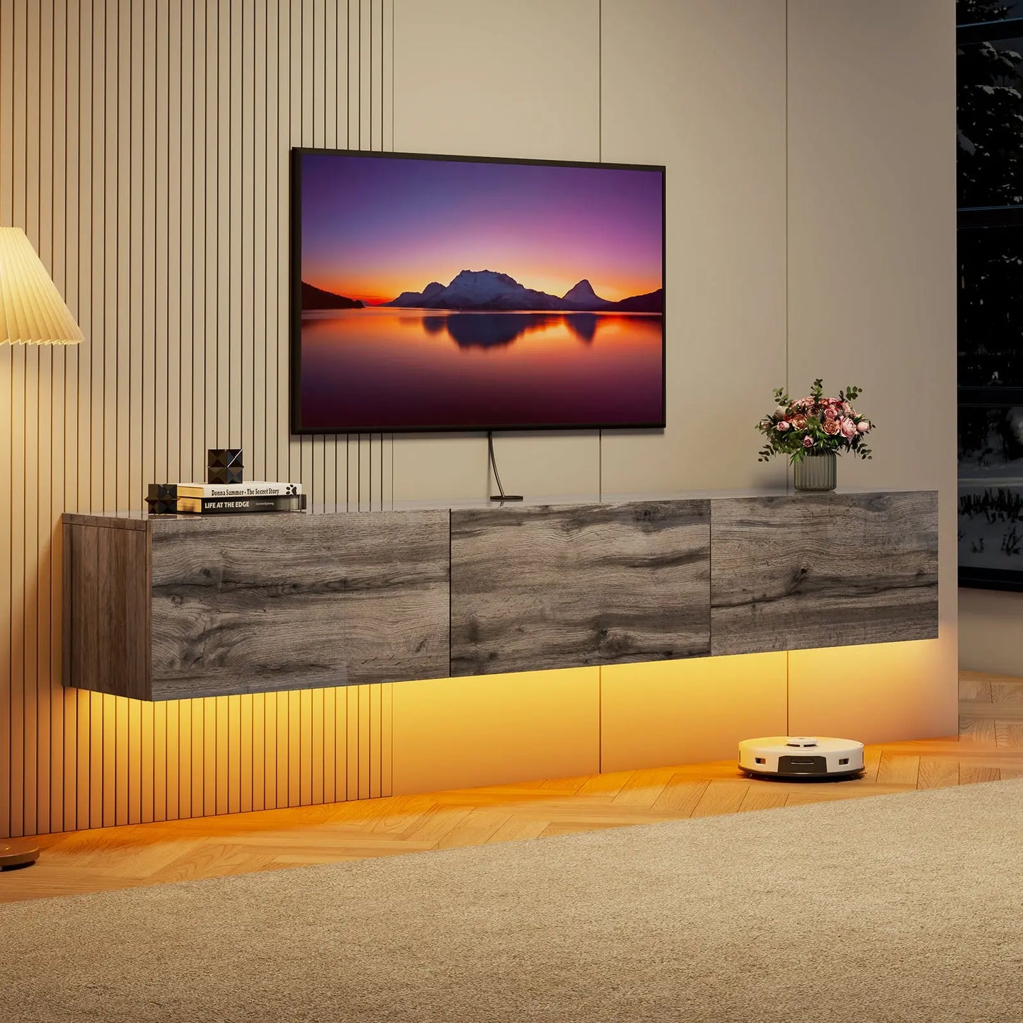 70" Woodgrain High Gloss Floating TV Stand features a stunning wood grain finish and customizable smart LED lights for a vibrant atmosphere. It includes a charging station with outlets and USB ports, plus three storage drawers to keep your space organized. The wall-mounted design saves floor space, making it perfect for any room.