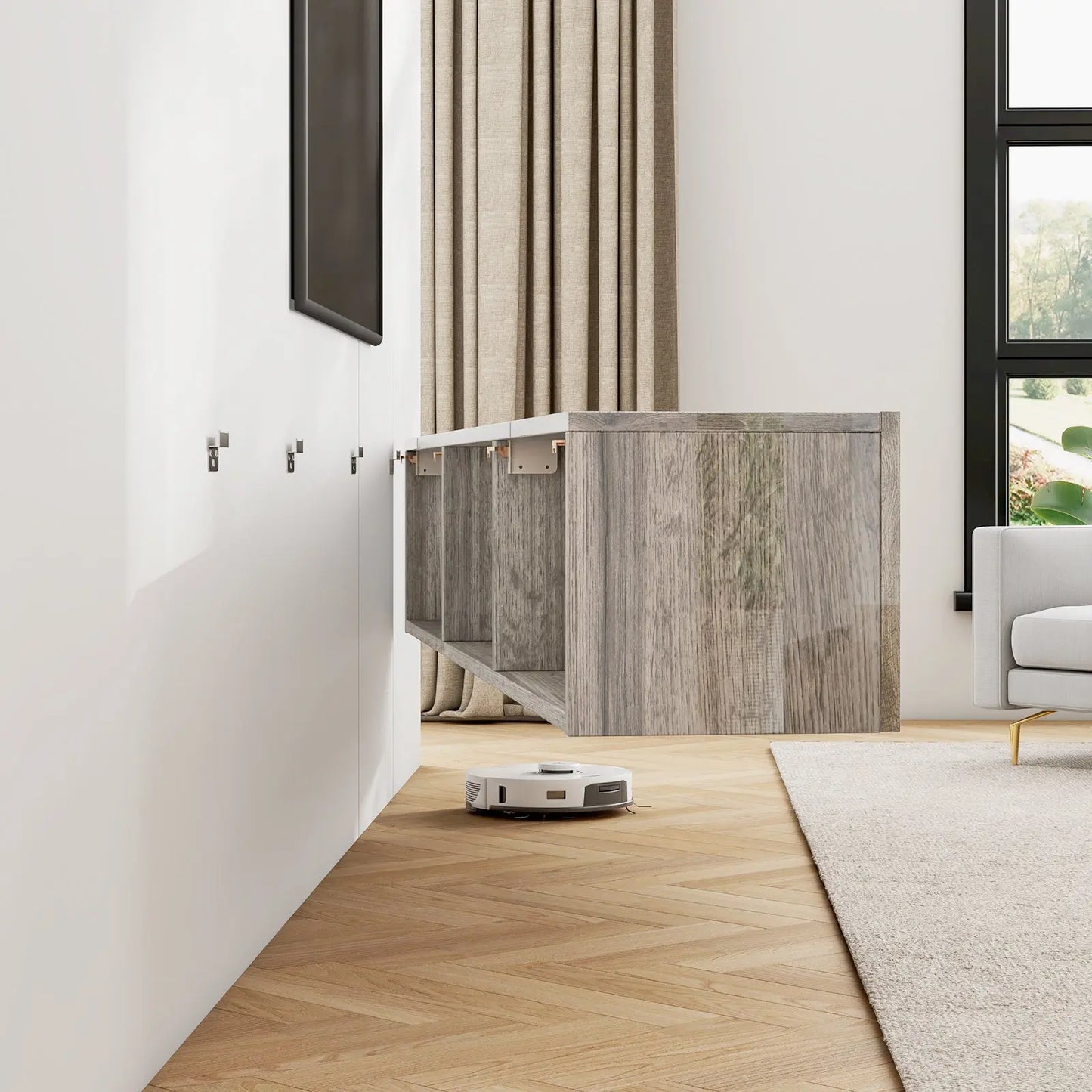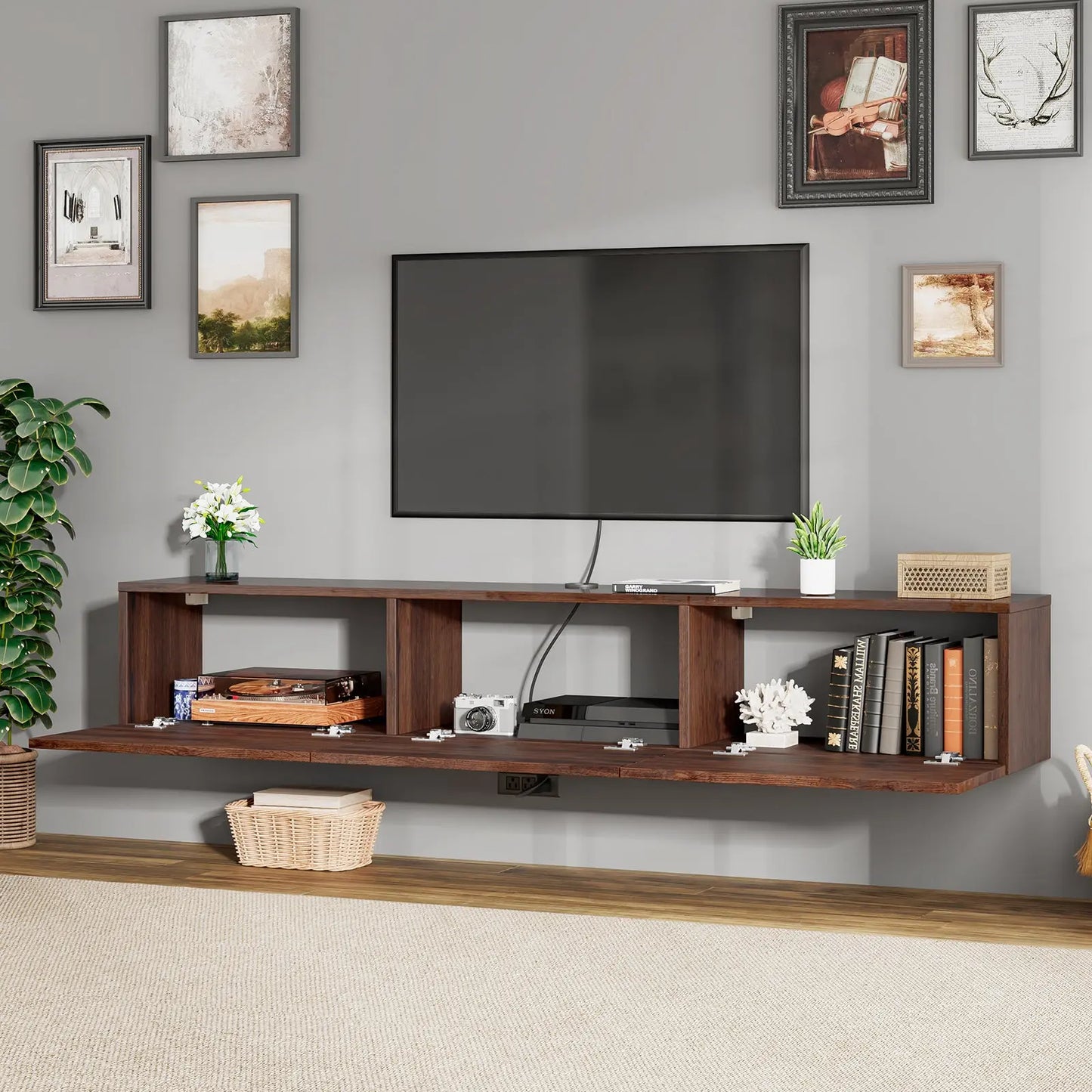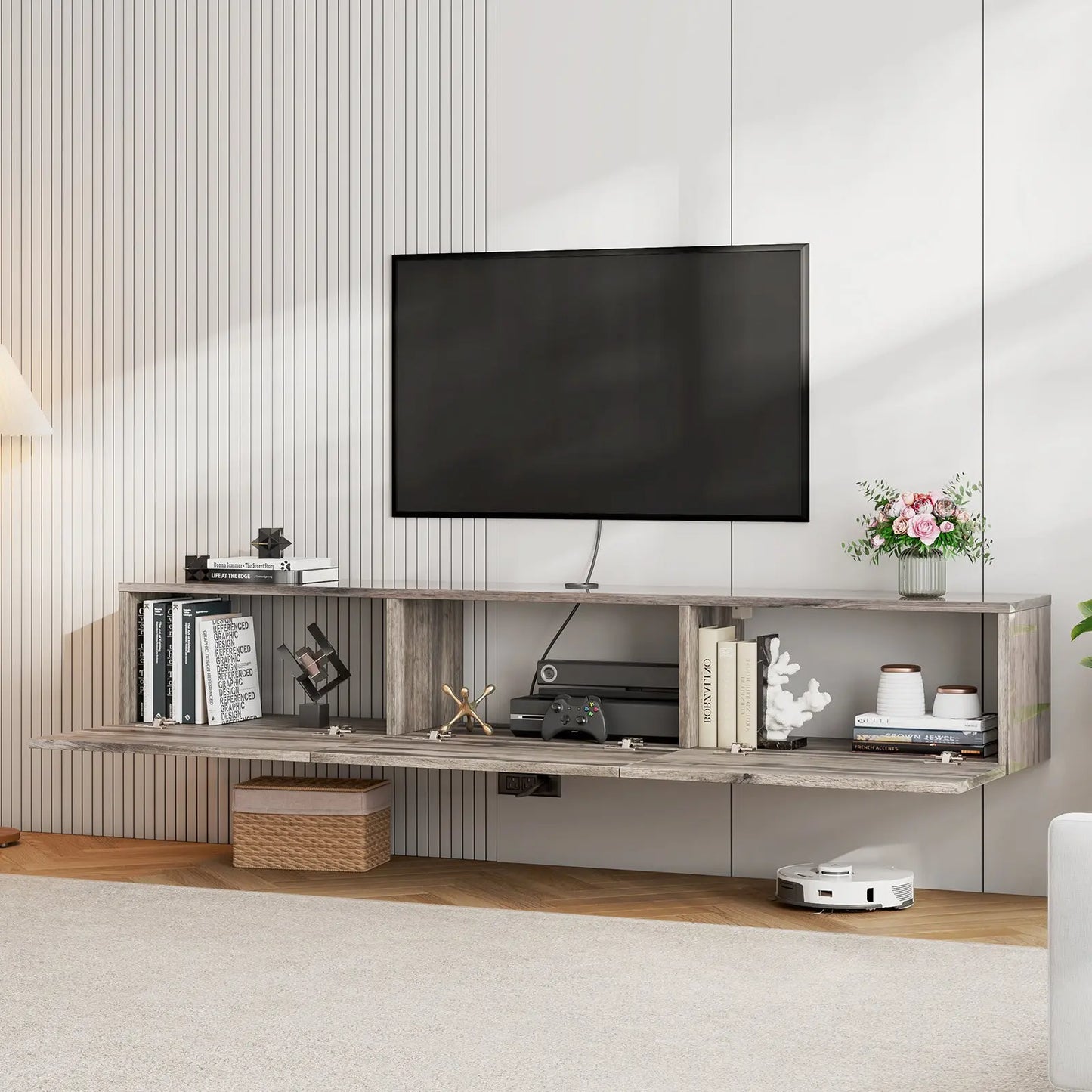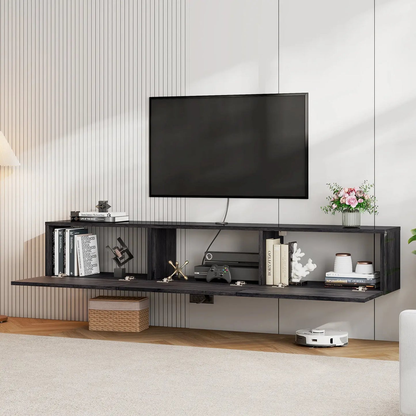Designed for space efficiency, this floating TV stand includes three tip drawers for storing books, decor, and gaming equipment. The wall-mounted design frees up valuable floor space, making it perfect for smaller rooms.