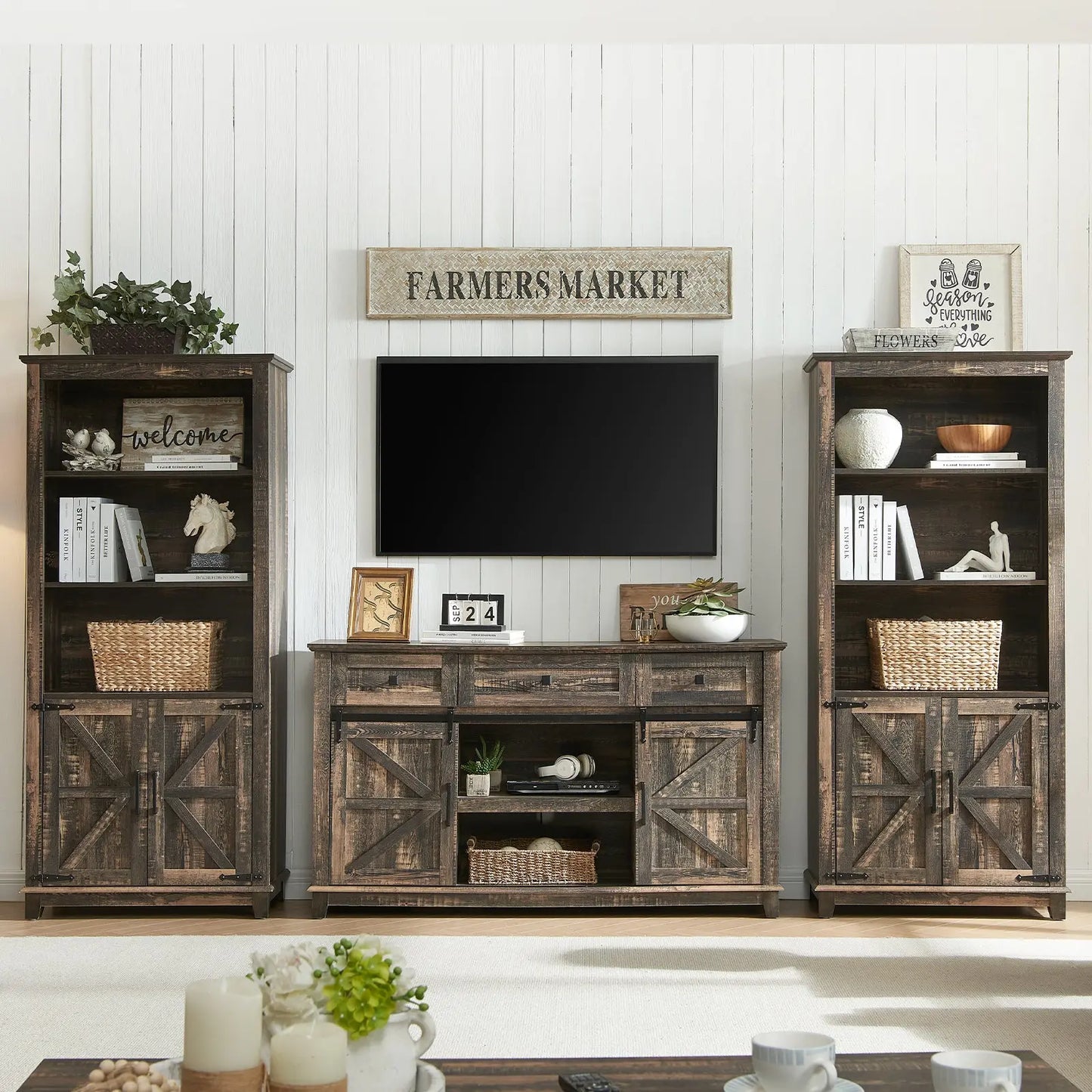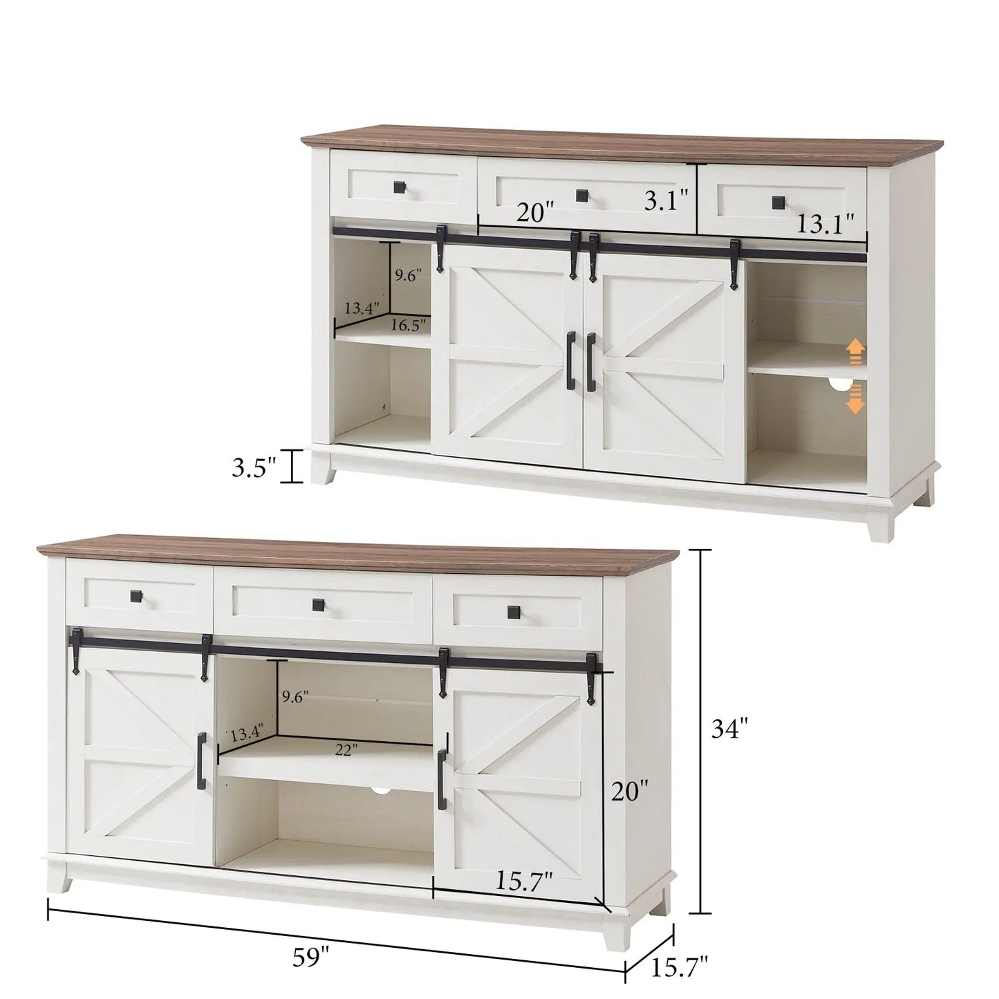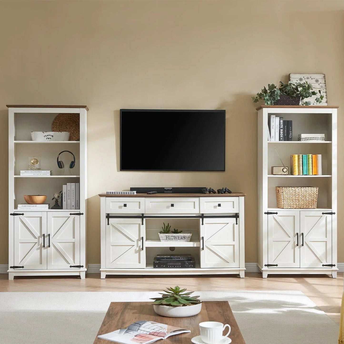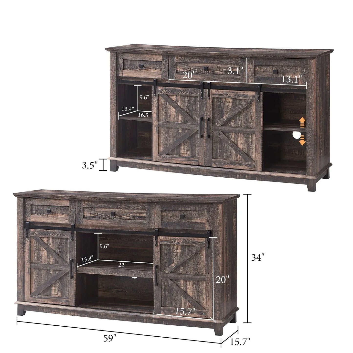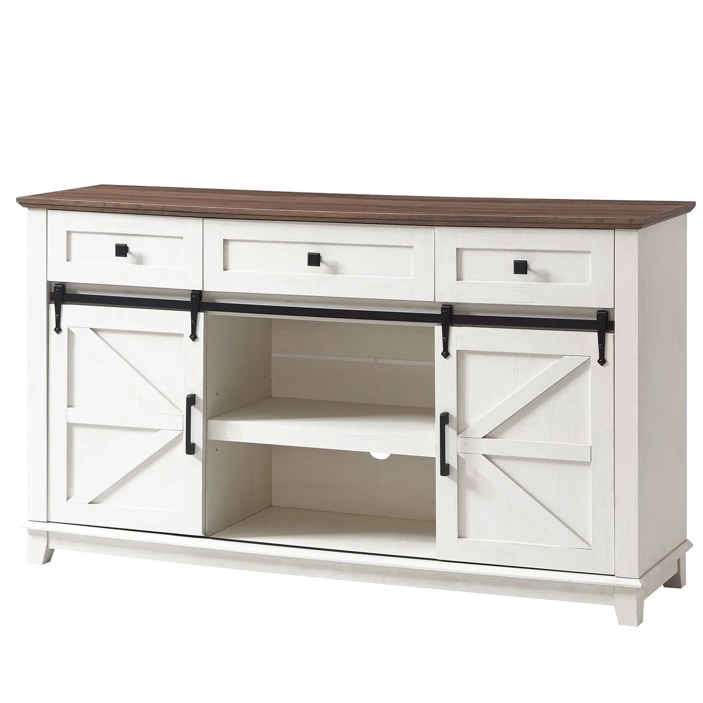 Two movable smooth barn doors on the television stand for convenient access to cabinets, adds a touch of character and functionality to your storage solution.