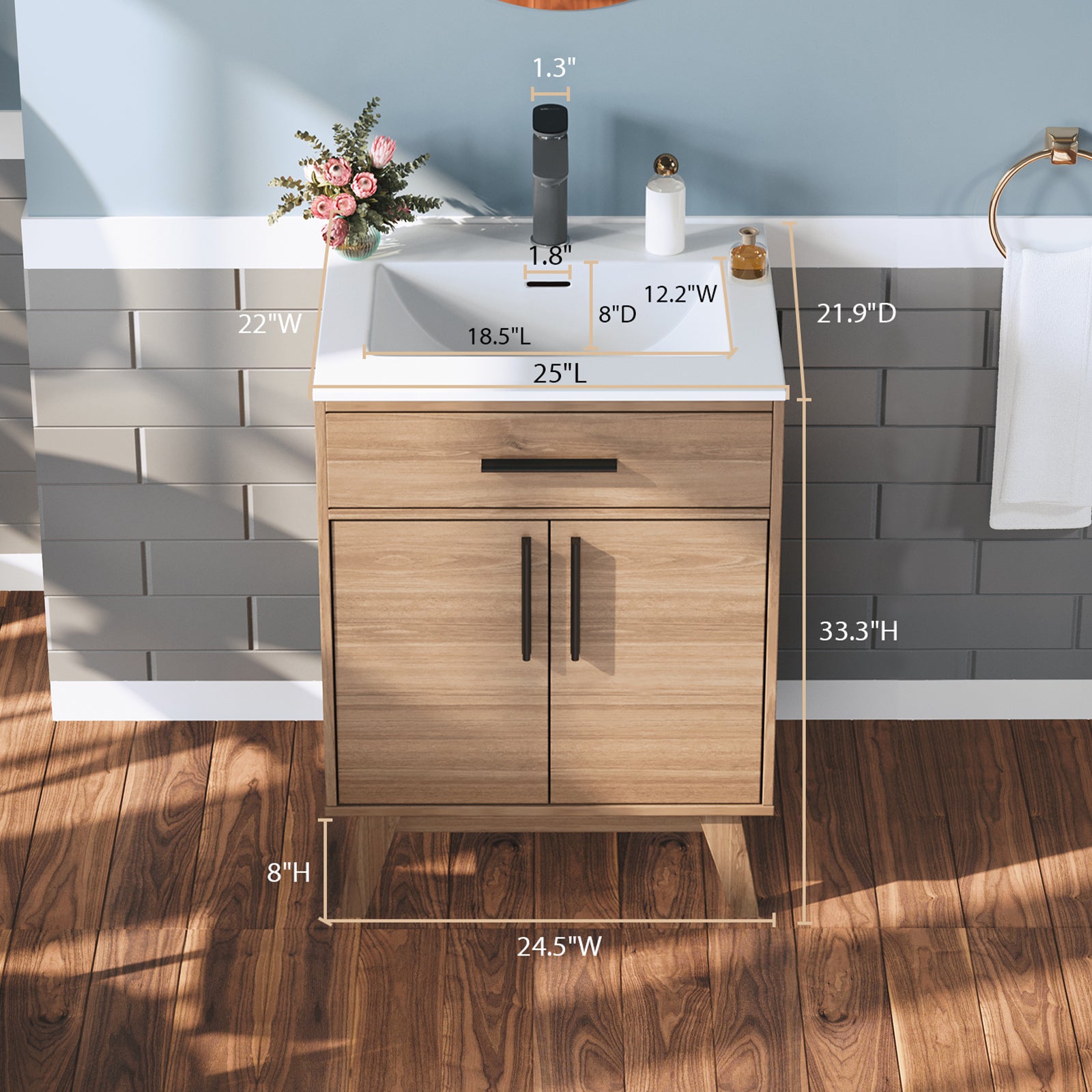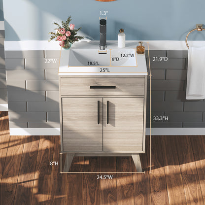 Standard 25"Lx22W" countertop with 1.3" single faucet hole, stylish vanity cabinet with metal handles, perfectly match with other bath furniture, easily control every inch of bathroom space.