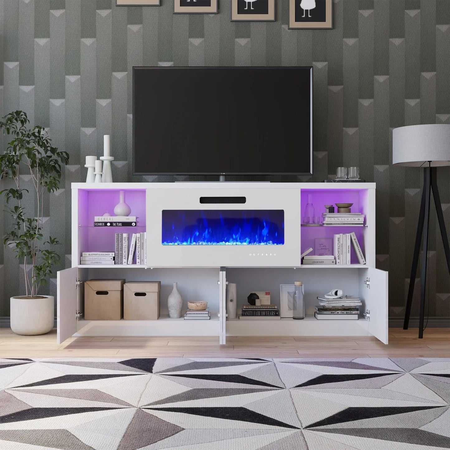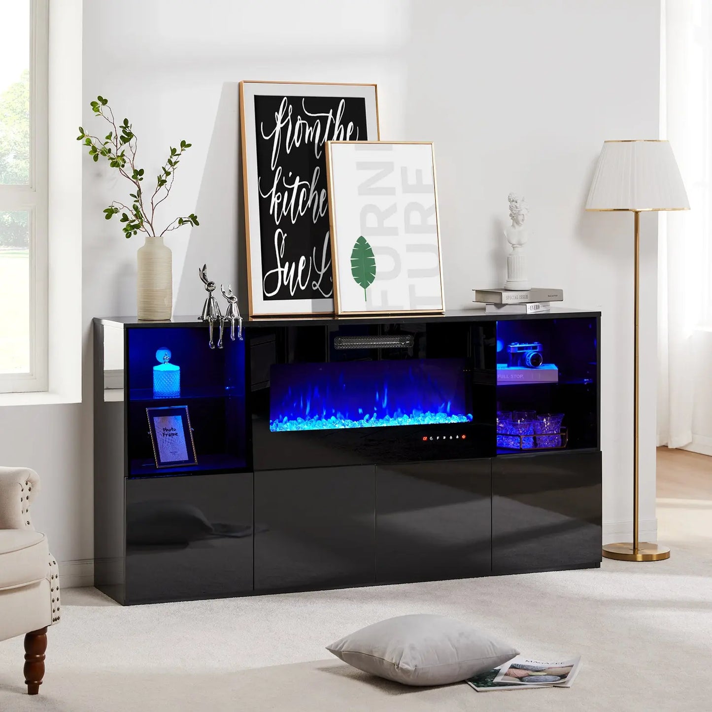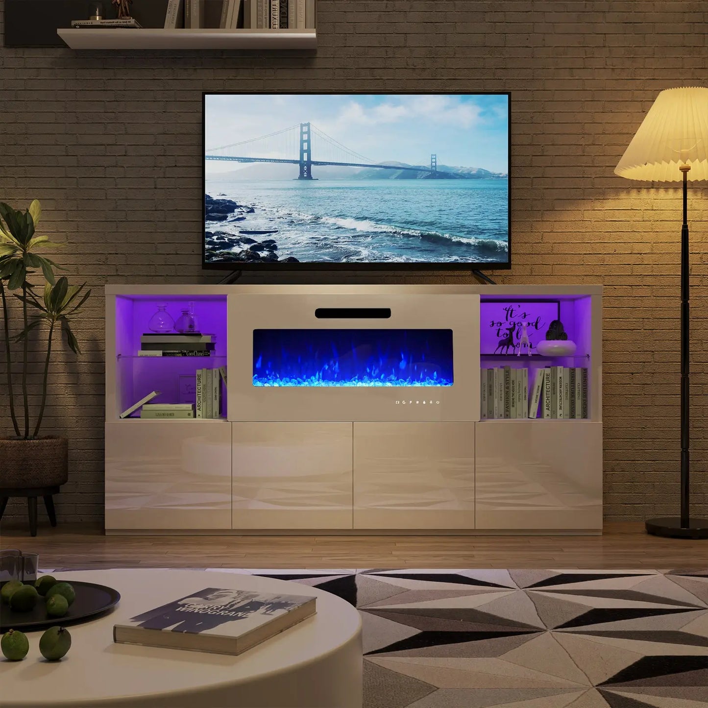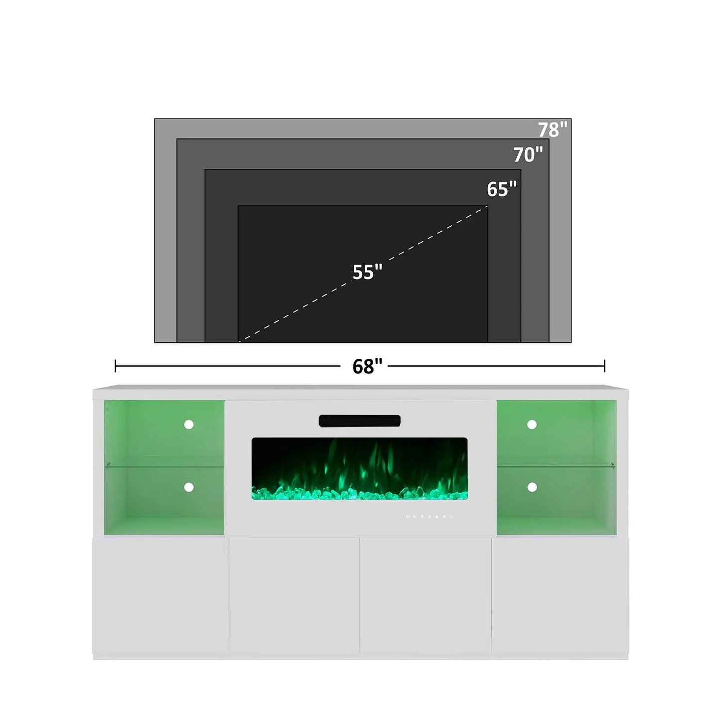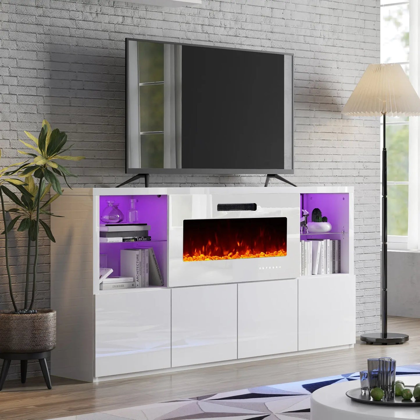 Modernize your home with this durable living room furniture set, blending high gloss fronts with a matte body. The 68" TV console pairs with an electric fireplace showcasing 8 flame colors, coupled with both open and closed storage.
