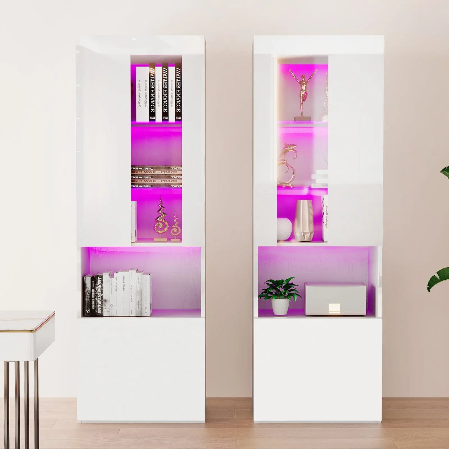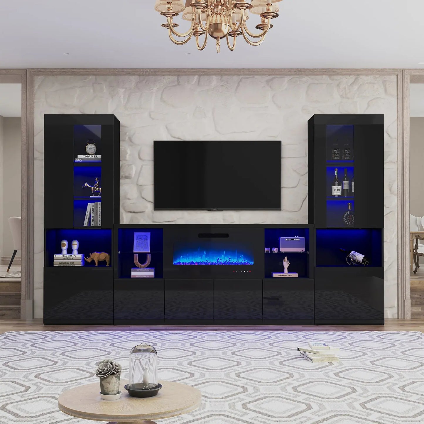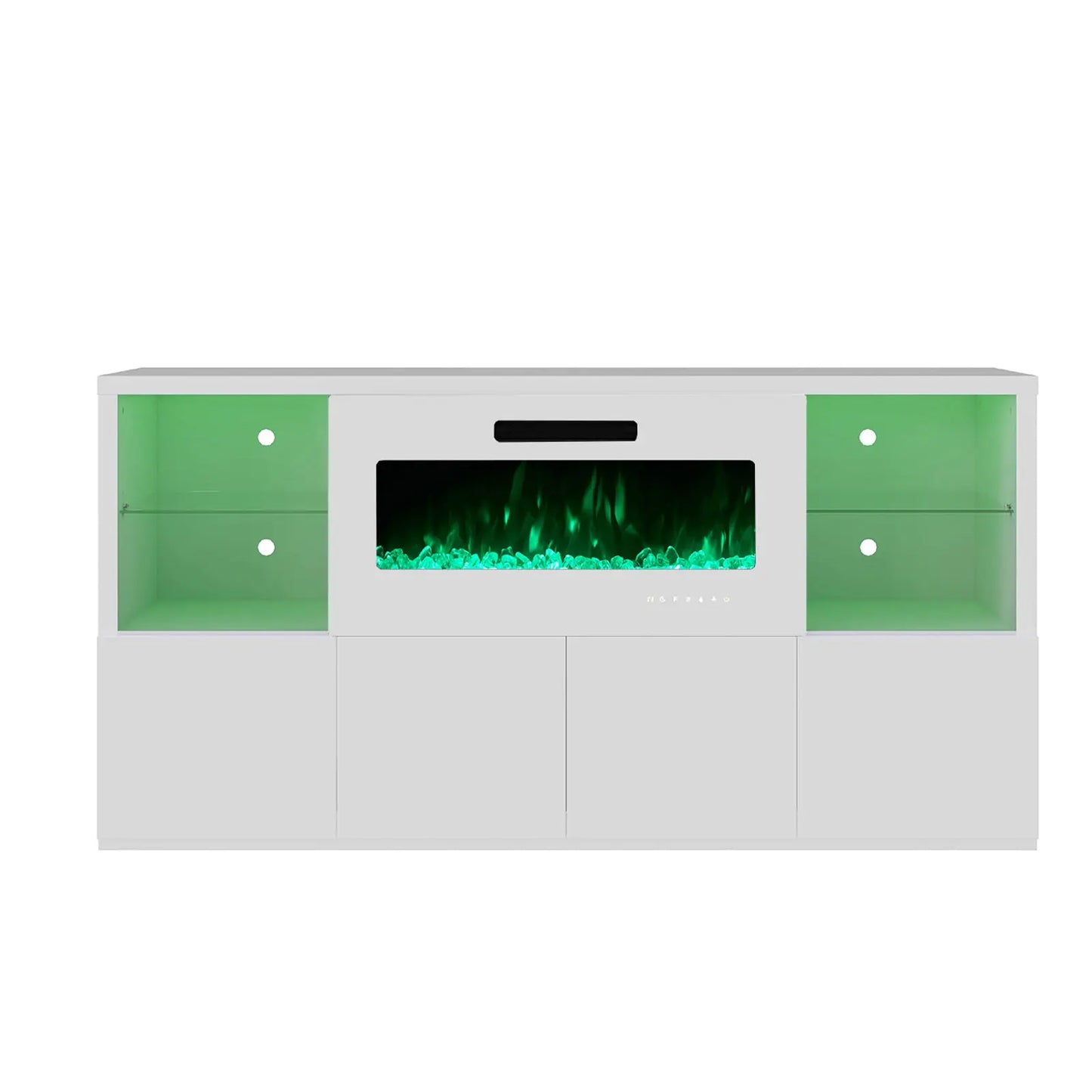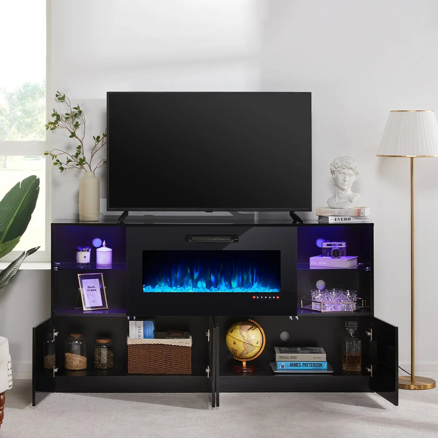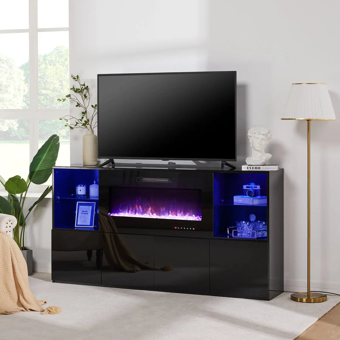Modernize your home with this durable living room furniture set, blending high gloss fronts with a matte body. The 68" TV console pairs with an electric fireplace showcasing 8 flame colors, coupled with both open and closed storage.