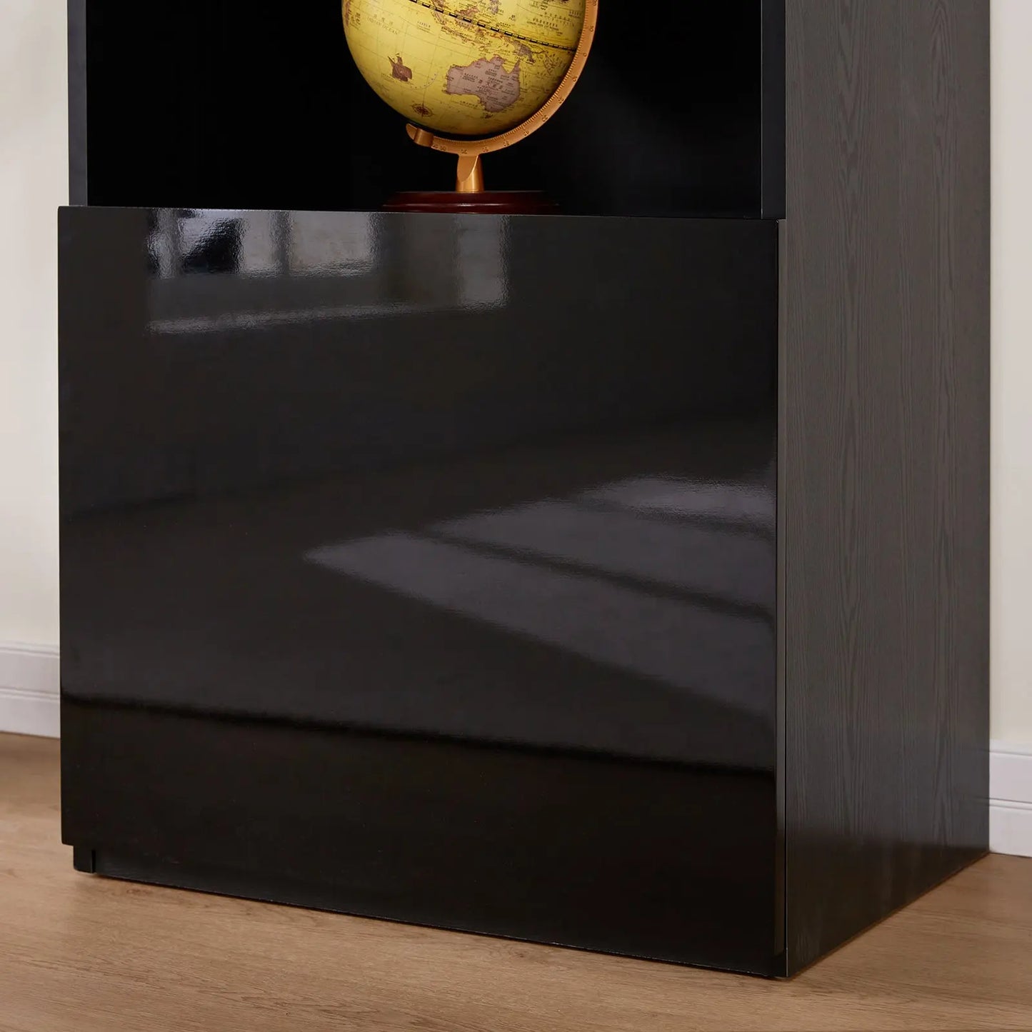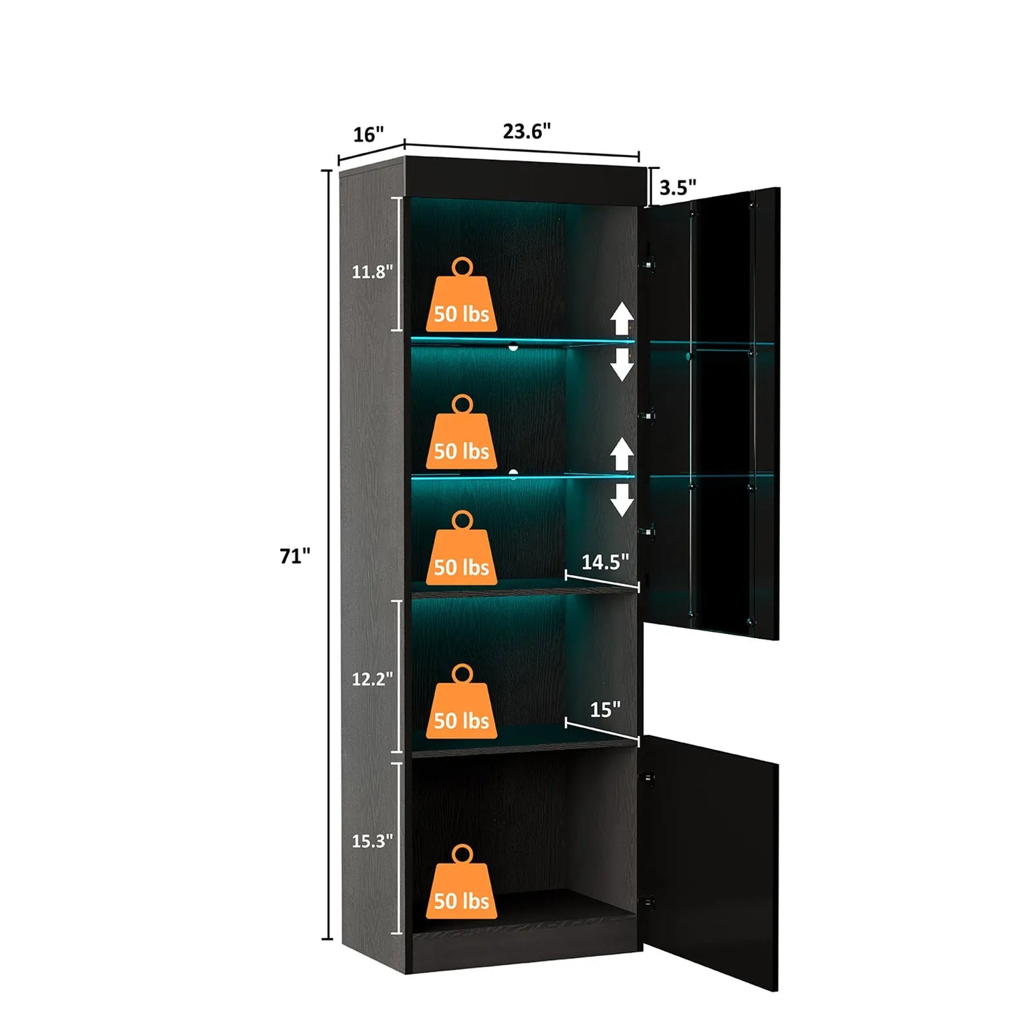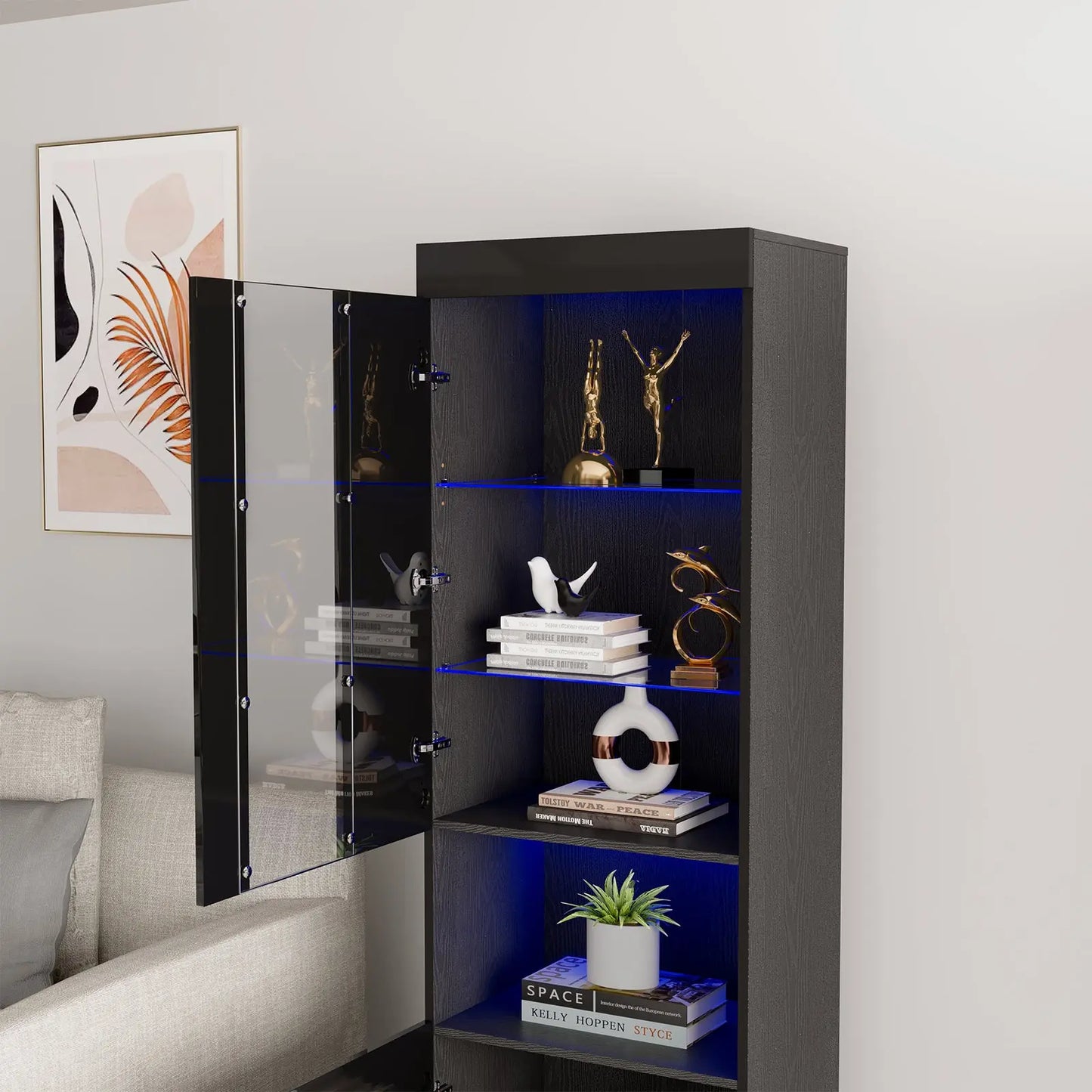 The 71-inch tall Bookcase Storage Cabinet is a multifunctional furnishing, suitable as a display stand or bookshelf in areas like the living room or bedroom. Its 3-tier adjustable glass shelves, accompanied by a door and additional lower storage, cater to diverse storage requirements.