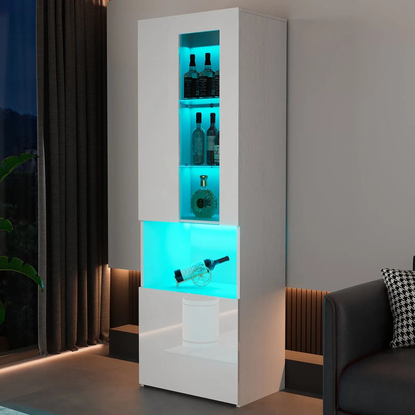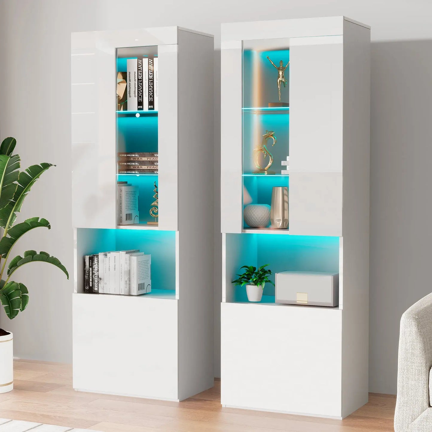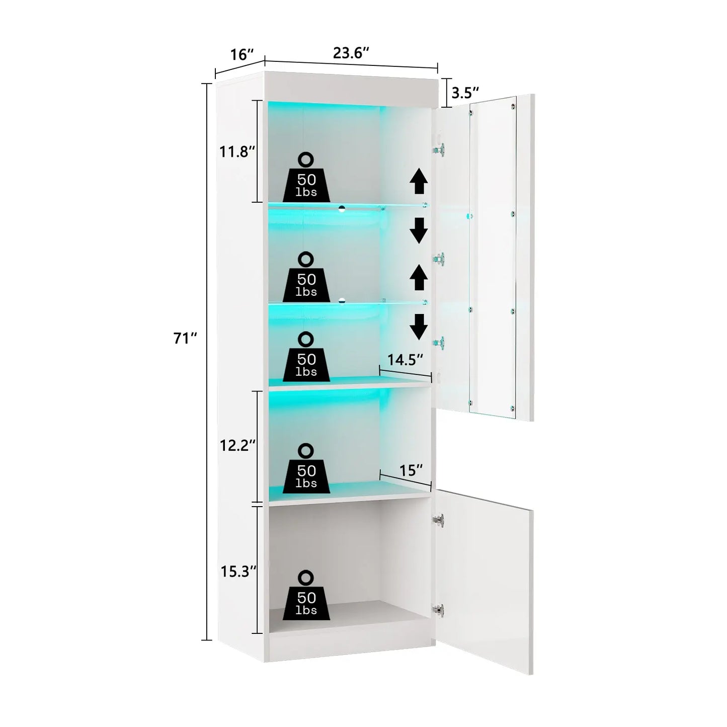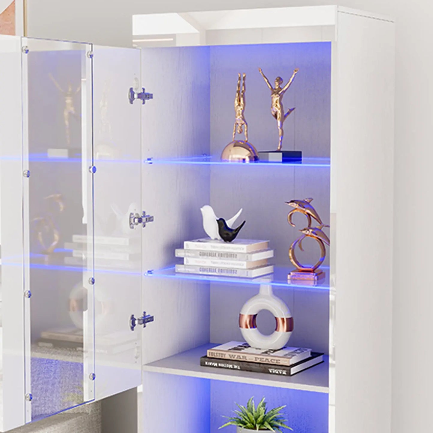 The 71-inch tall Bookcase Storage Cabinet is a multifunctional furnishing, suitable as a display stand or bookshelf in areas like the living room or bedroom. Its 3-tier adjustable glass shelves, accompanied by a door and additional lower storage, cater to diverse storage requirements.