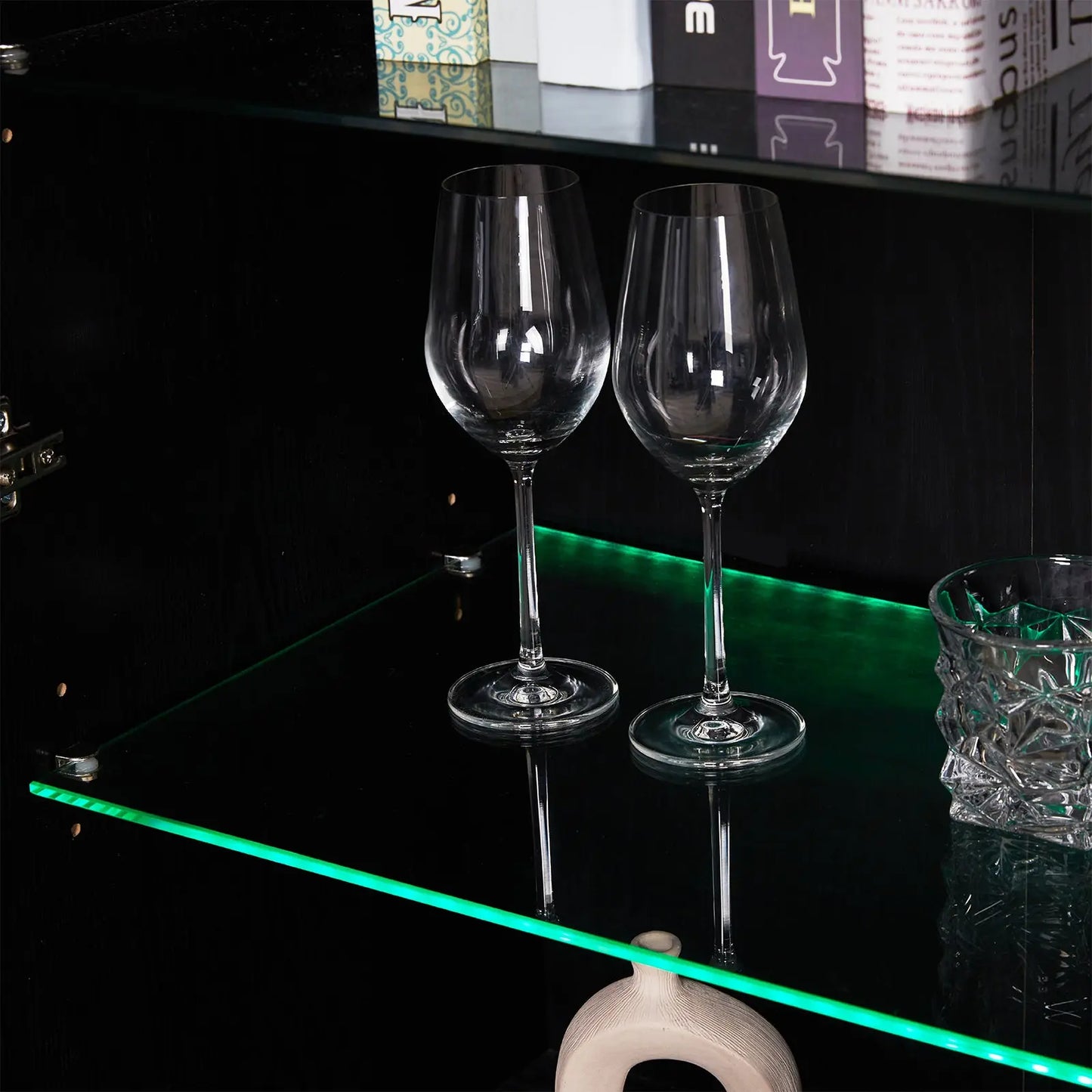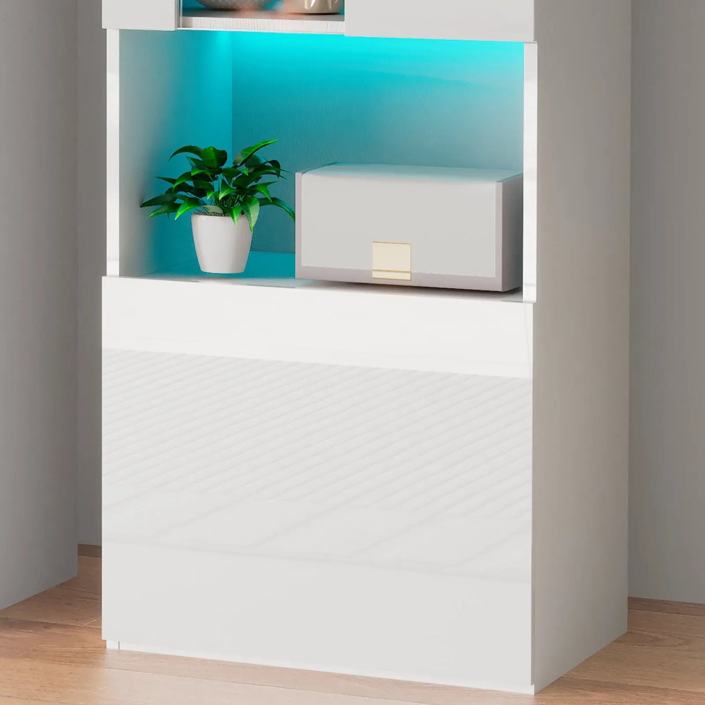 The Eternal 68" TV stand boasts a premium Gloss/UV finish, ensuring durability while exuding elegance, and features adjustable-height glass shelves in the entertainment center for versatile storage and display.