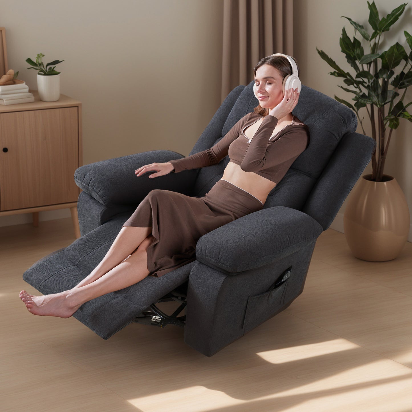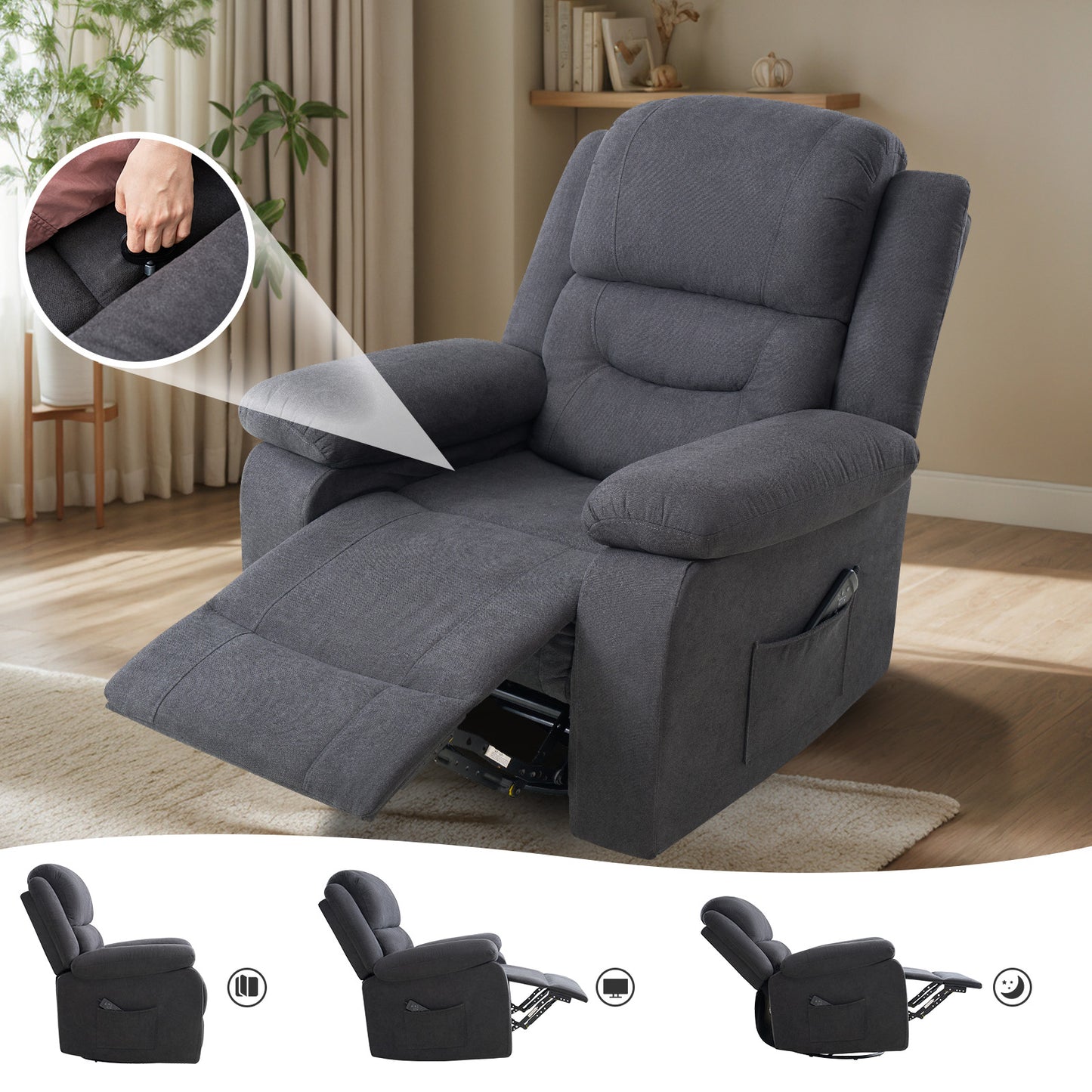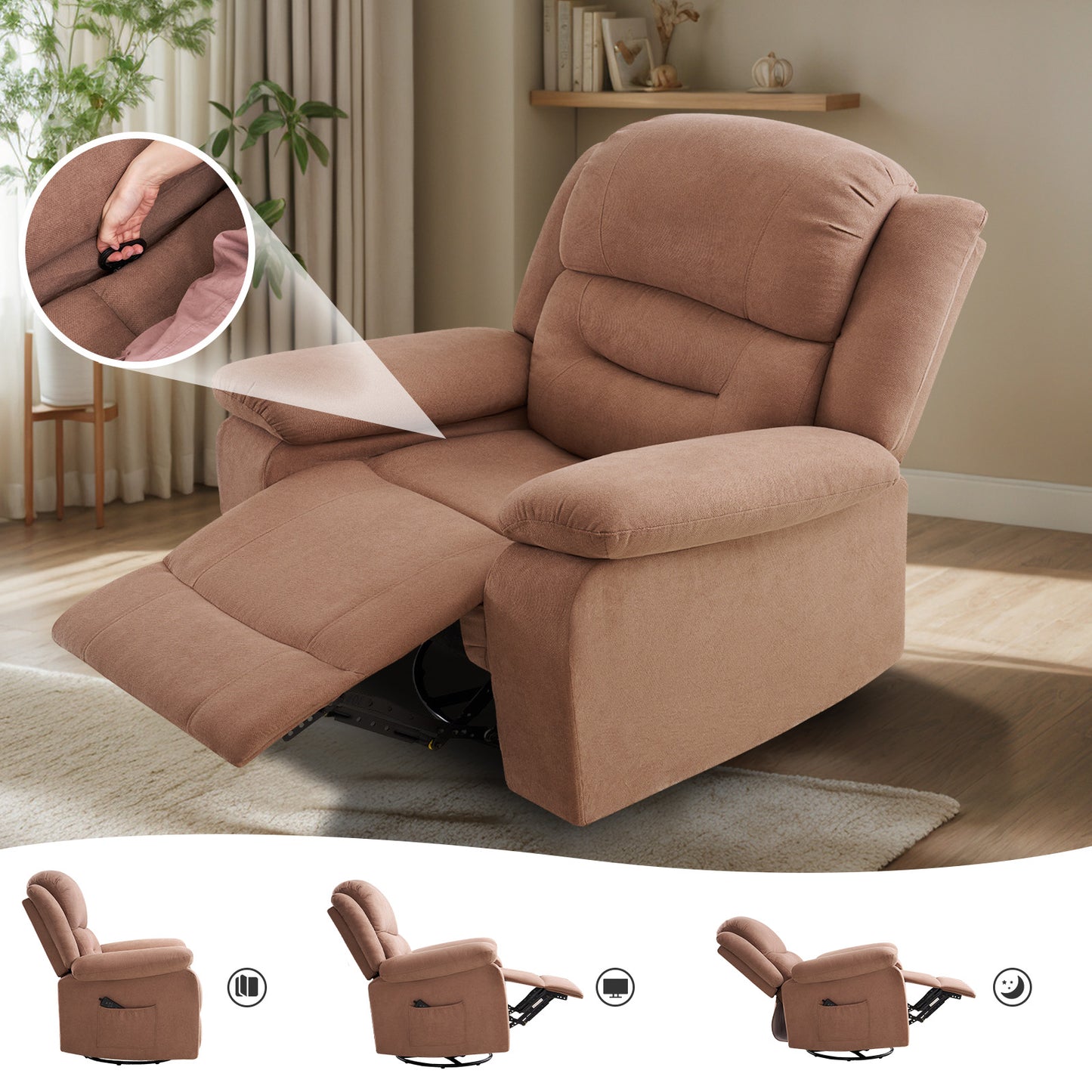 The Reed Swivel-Rocker Recliner Chair delivers ultimate relaxation with 360° swivel, 30° rocking, 160° reclining, and dual seat massage points. Upholstered in soft, breathable terry fabric and filled with high-density foam, it ensures comfort and support. Effortlessly recline with the pull ring, while a side pocket keeps essentials within reach. Built with a sturdy wood frame and iron base, it offers lasting durability. With its timeless dark design, this recliner blends seamlessly into any home or office decor, providing both style and function.