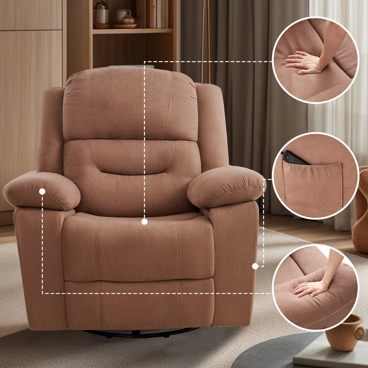 Reed Swivel-Rocker Recliner Chair offers 360° swivel, 30° rocking, 160° reclining, and dual seat massage points, giving you personalized relaxation for any occasion.
