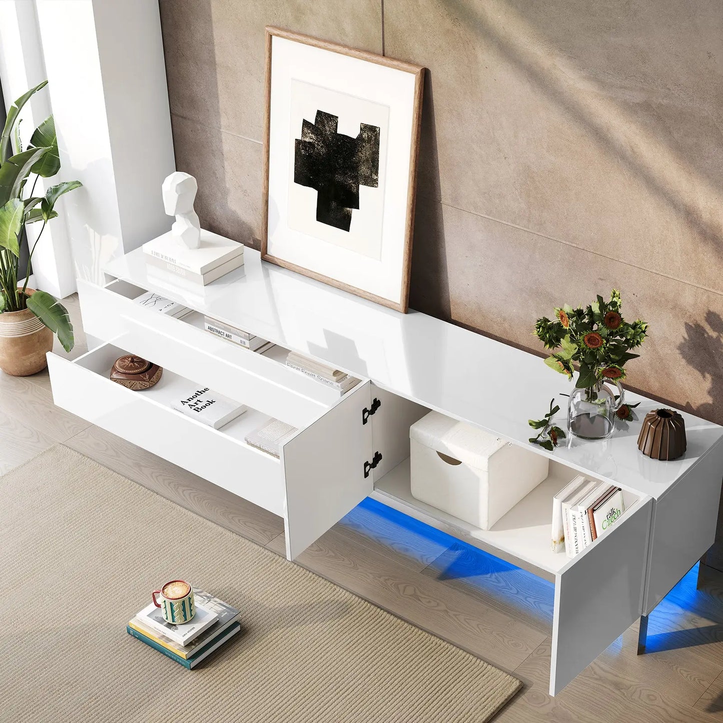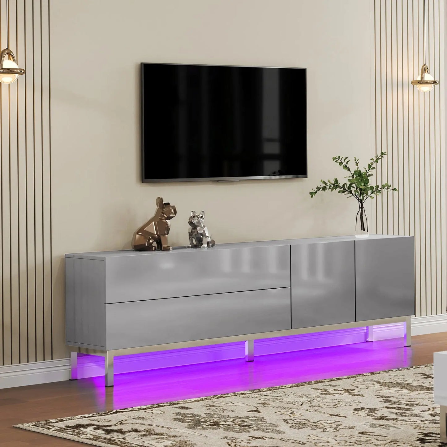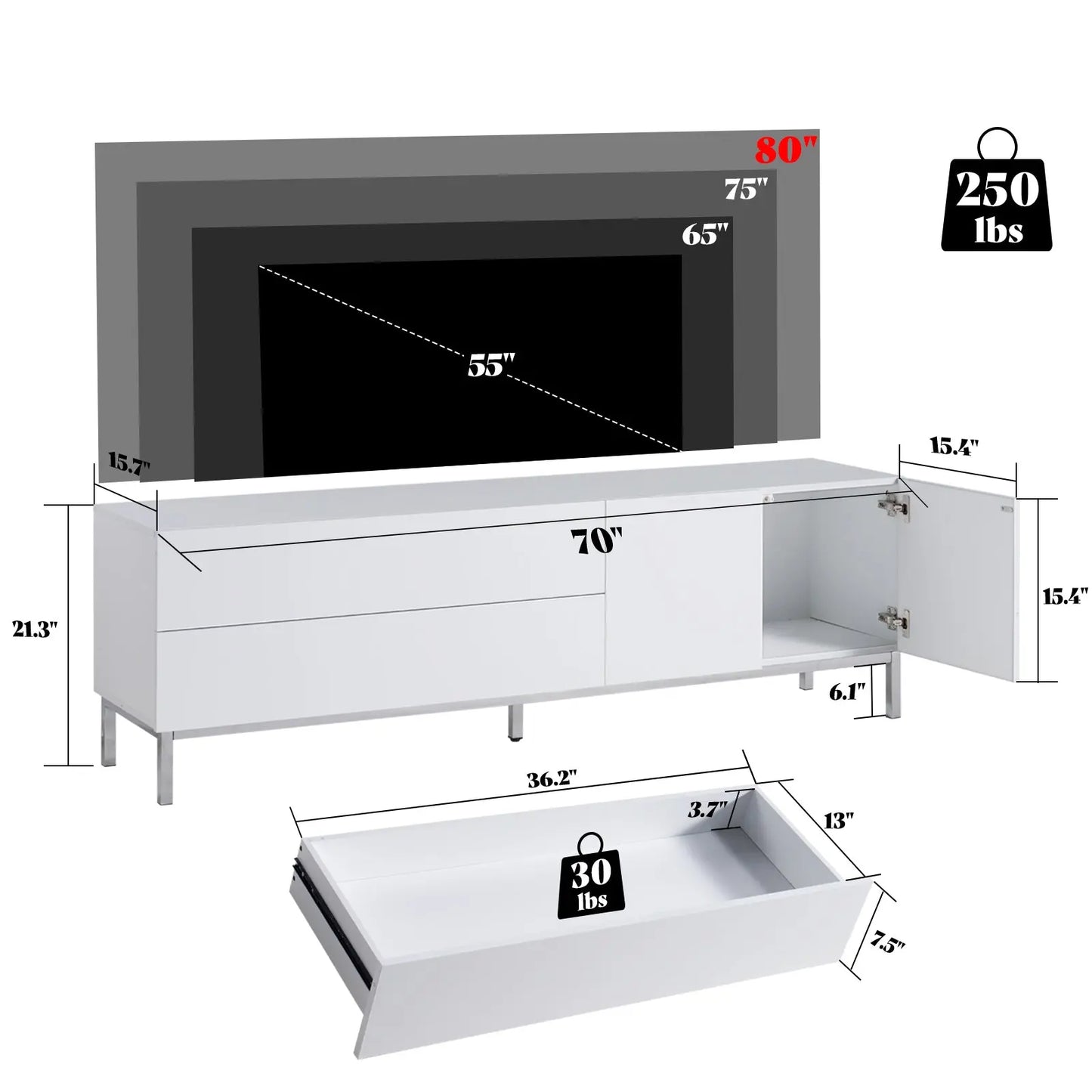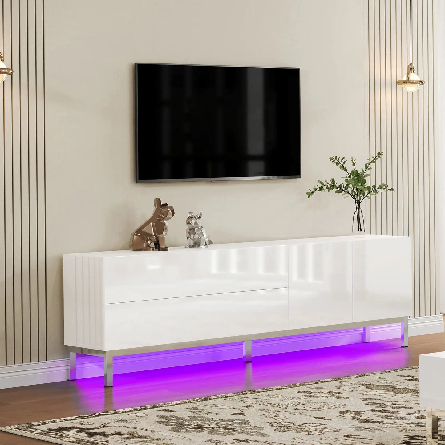 High gloss TV stand features a durable anti-scratch coating for long-lasting use. Enjoy customizable smart RGB LED lights that can be controlled via app or remote, perfect for creating the right atmosphere for parties or gaming. This TV stand accommodates up to 80-inch TVs and supports up to 250 lbs, featuring two spacious drawers and one cabinet for ample storage, making it ideal for your living room or bedroom.