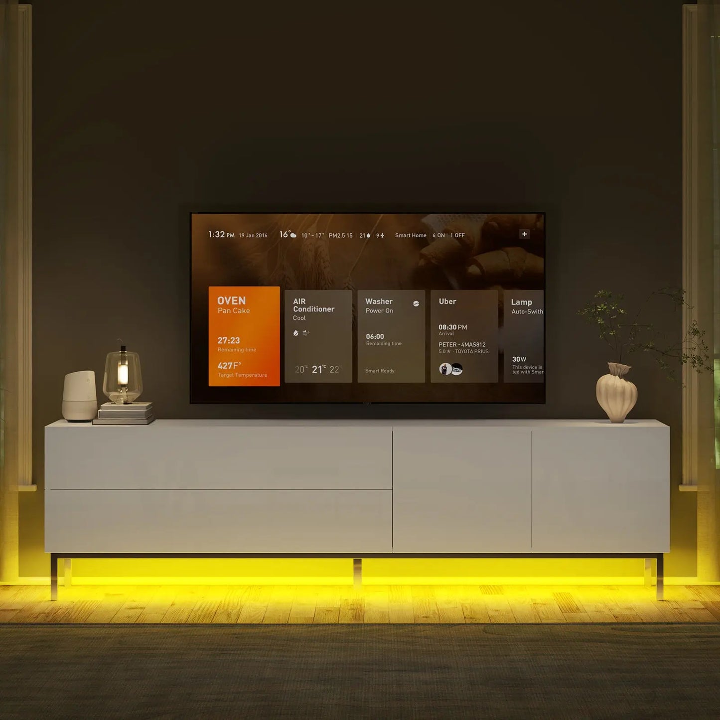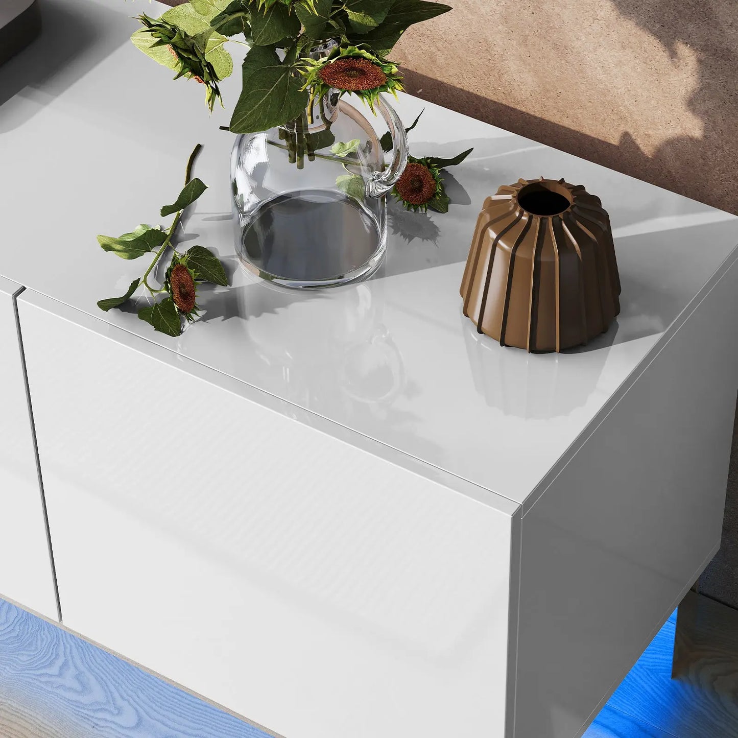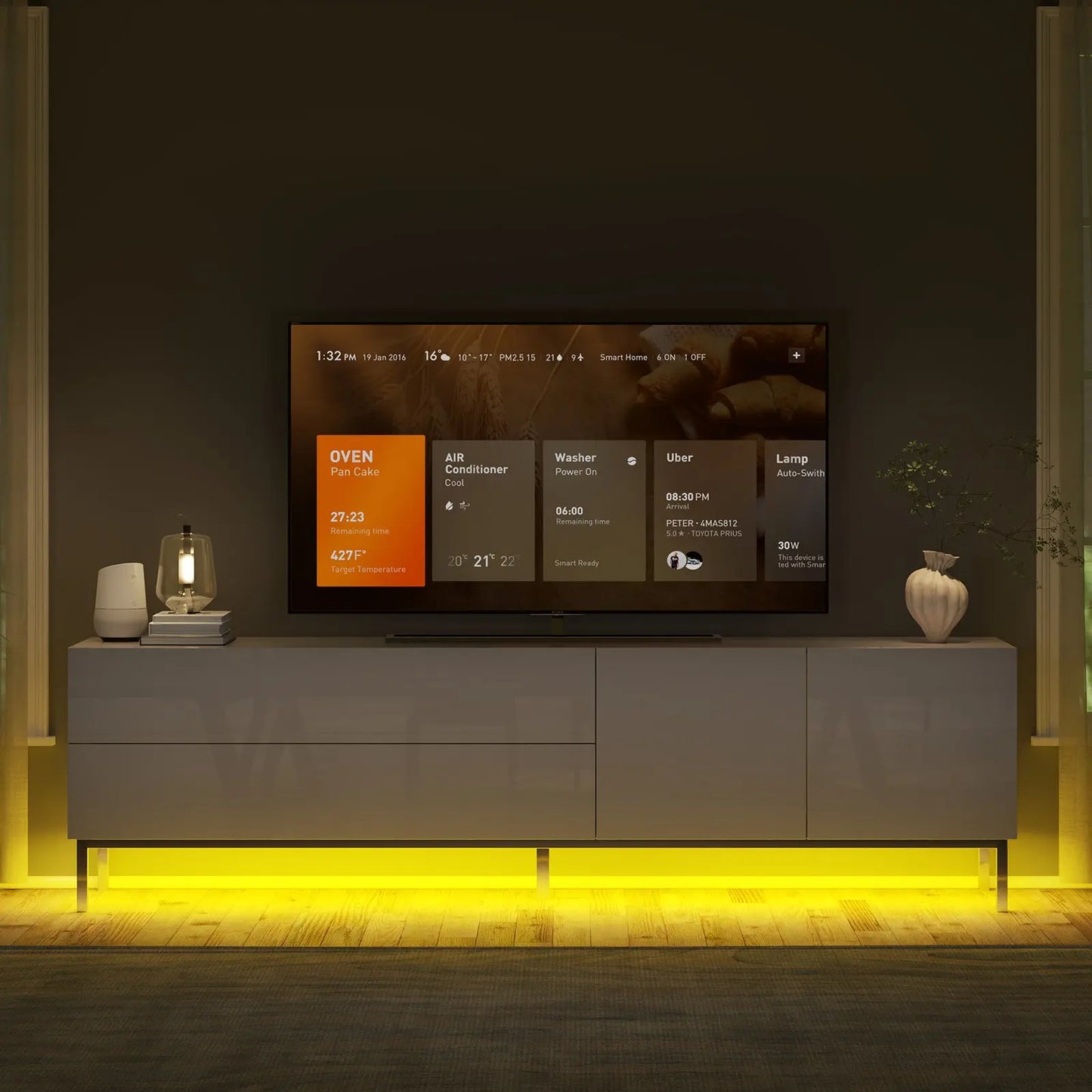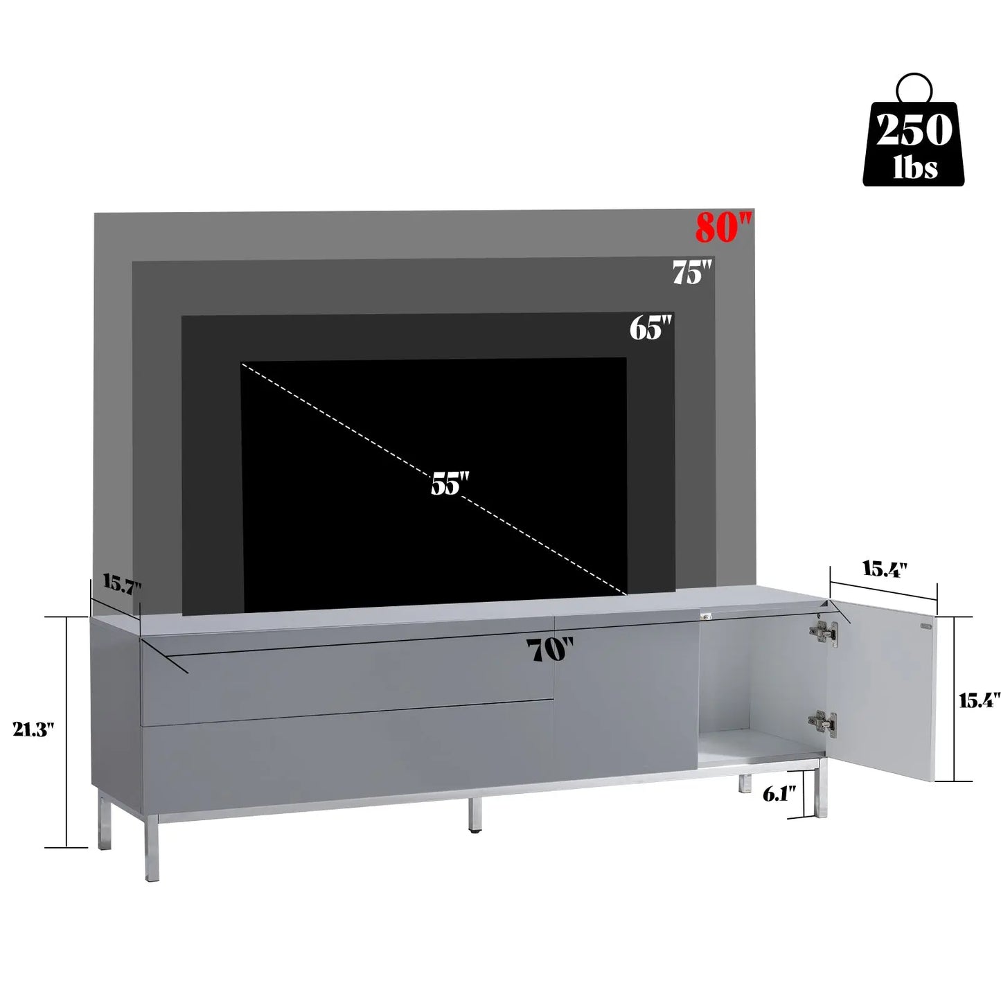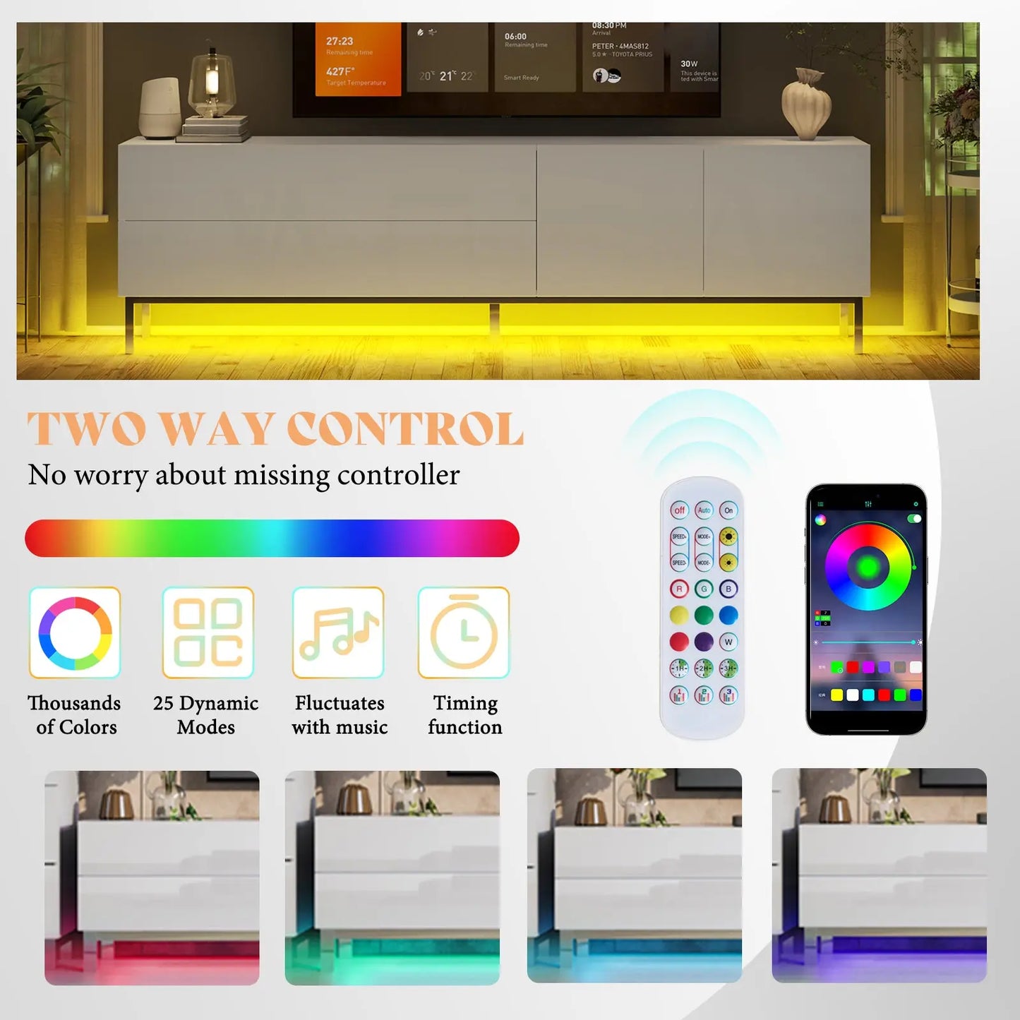 High gloss TV stand features a durable anti-scratch coating for long-lasting use. Enjoy customizable smart RGB LED lights that can be controlled via app or remote, perfect for creating the right atmosphere for parties or gaming. This TV stand accommodates up to 80-inch TVs and supports up to 250 lbs, featuring two spacious drawers and one cabinet for ample storage, making it ideal for your living room or bedroom.