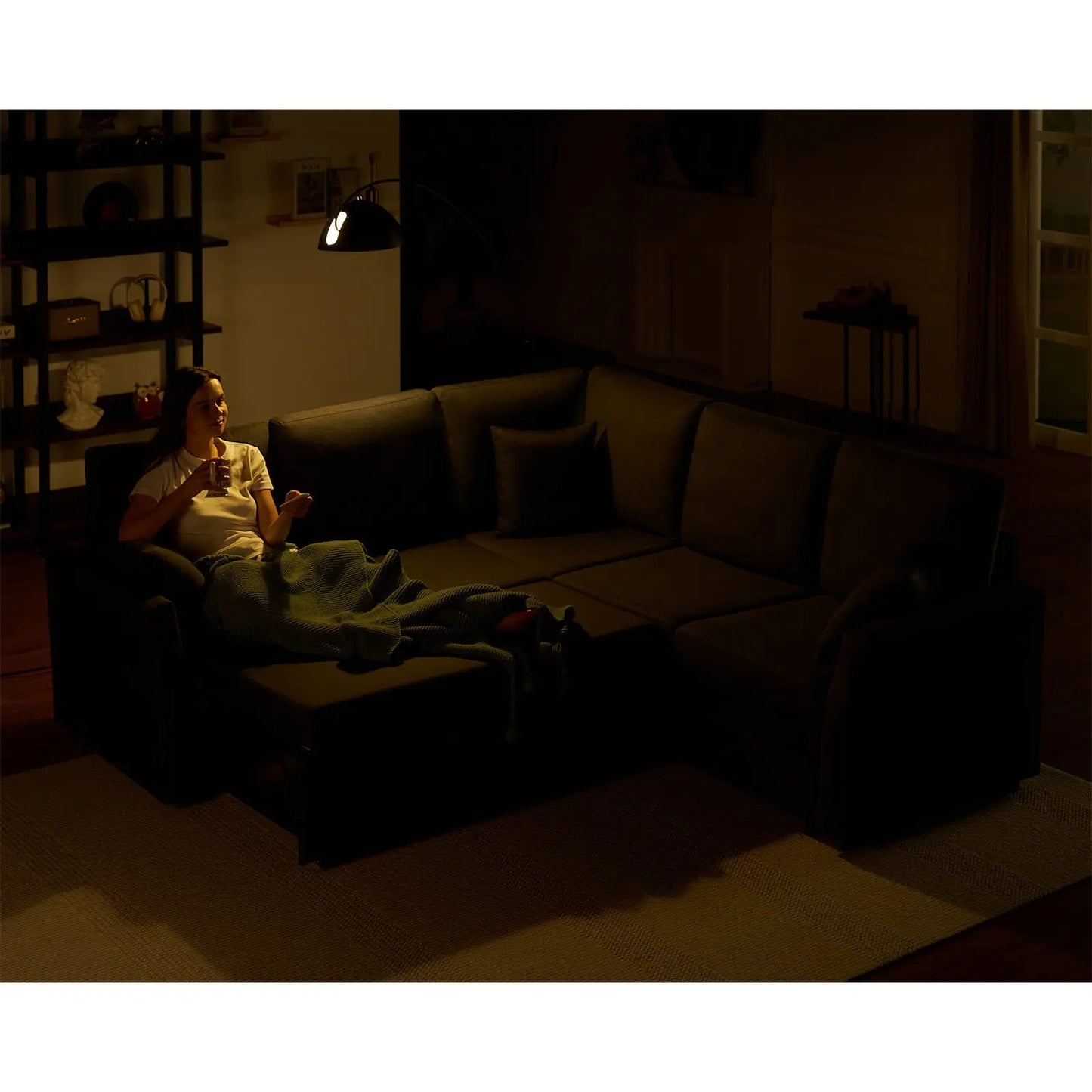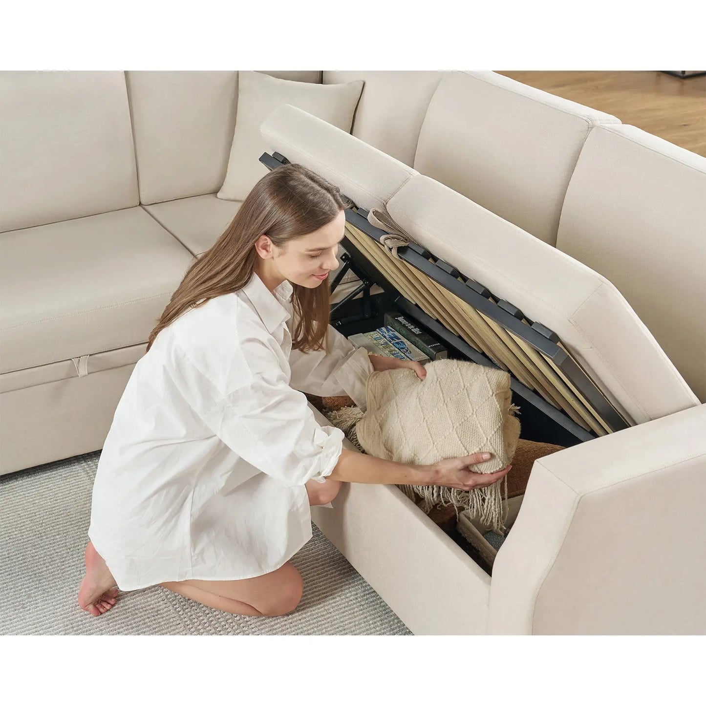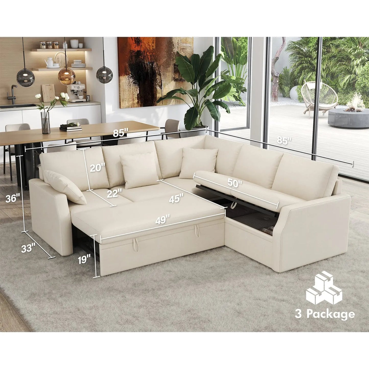 Introducing Velvra, a stylish and functional convertible sofa bed designed for family-sized relaxation. With a simple pull, it transforms into a cozy, spacious bed, perfect for naps or turning any room into a guest space. Measuring 85″ x 85″, this oversized sofa comfortably seats five and offers plenty of room to stretch out. Its high-density foam cushions, thick backrest, and extra throw pillows provide cloud-like comfort, while its durable linen fabric and sturdy metal frame ensure long-lasting support for up to 2100 lbs. Plus, the hidden storage seat keeps your essentials neatly organized, combining comfort with practicality.