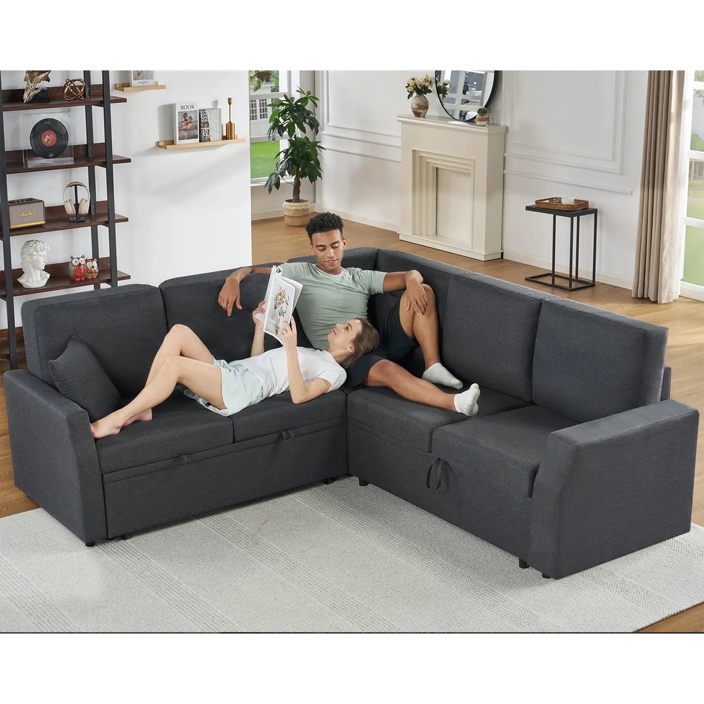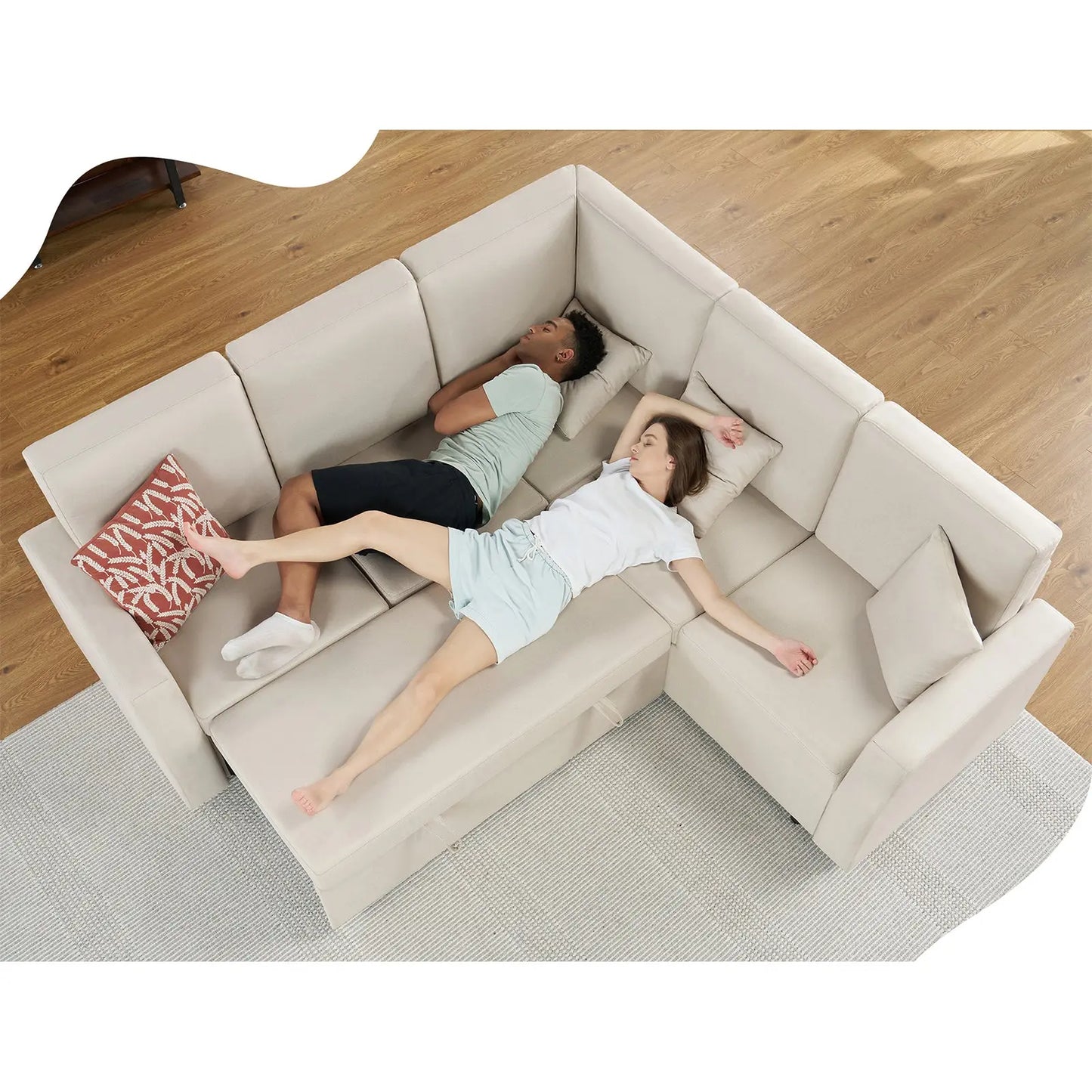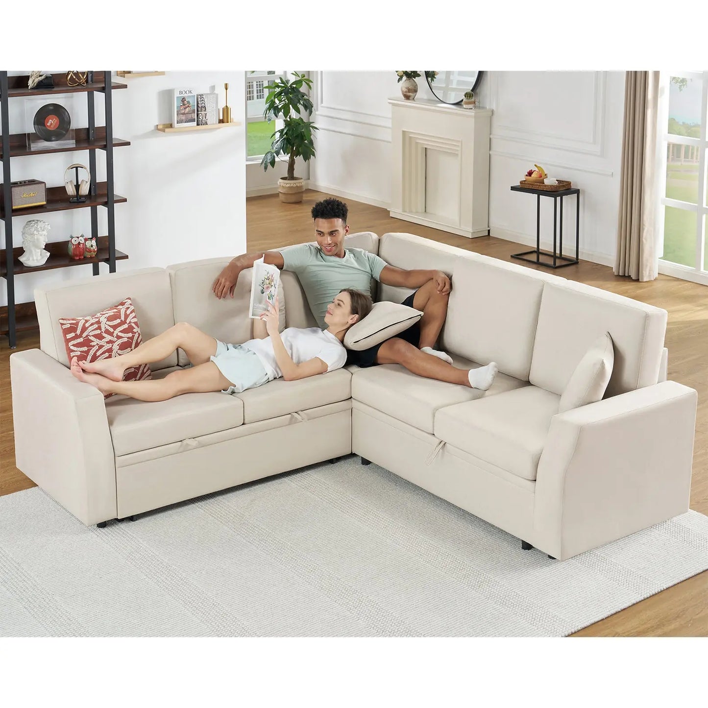 Introducing Velvra, a stylish and functional convertible sofa bed designed for family-sized relaxation. With a simple pull, it transforms into a cozy, spacious bed, perfect for naps or turning any room into a guest space. Measuring 85″ x 85″, this oversized sofa comfortably seats five and offers plenty of room to stretch out. Its high-density foam cushions, thick backrest, and extra throw pillows provide cloud-like comfort, while its durable linen fabric and sturdy metal frame ensure long-lasting support for up to 2100 lbs. Plus, the hidden storage seat keeps your essentials neatly organized, combining comfort with practicality.