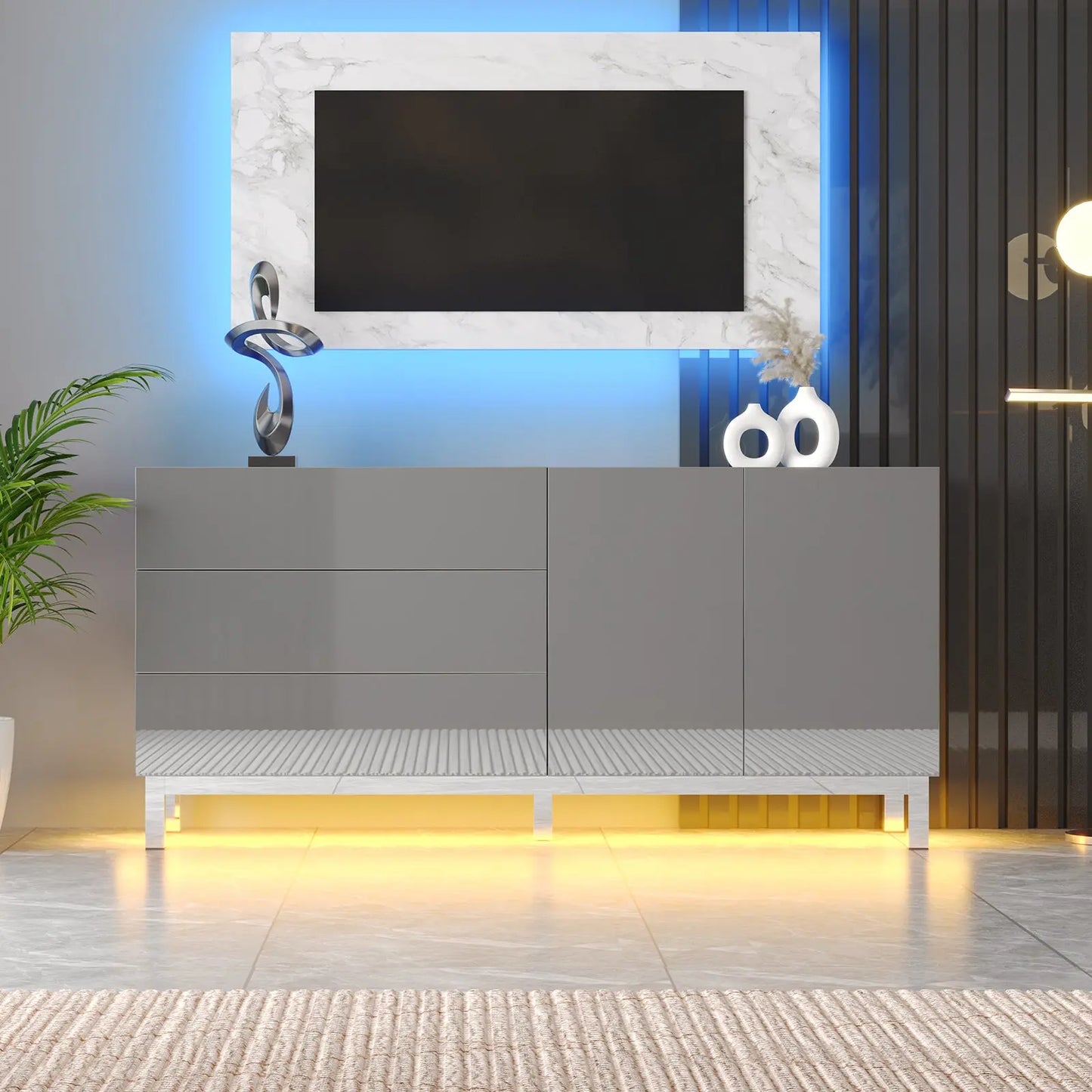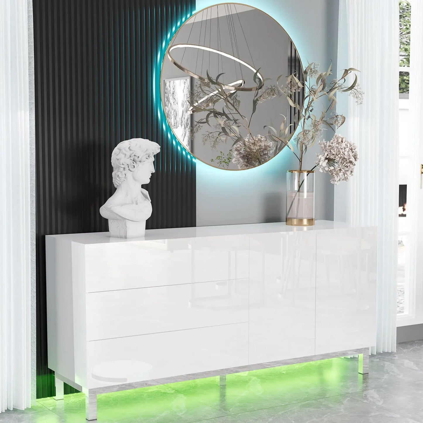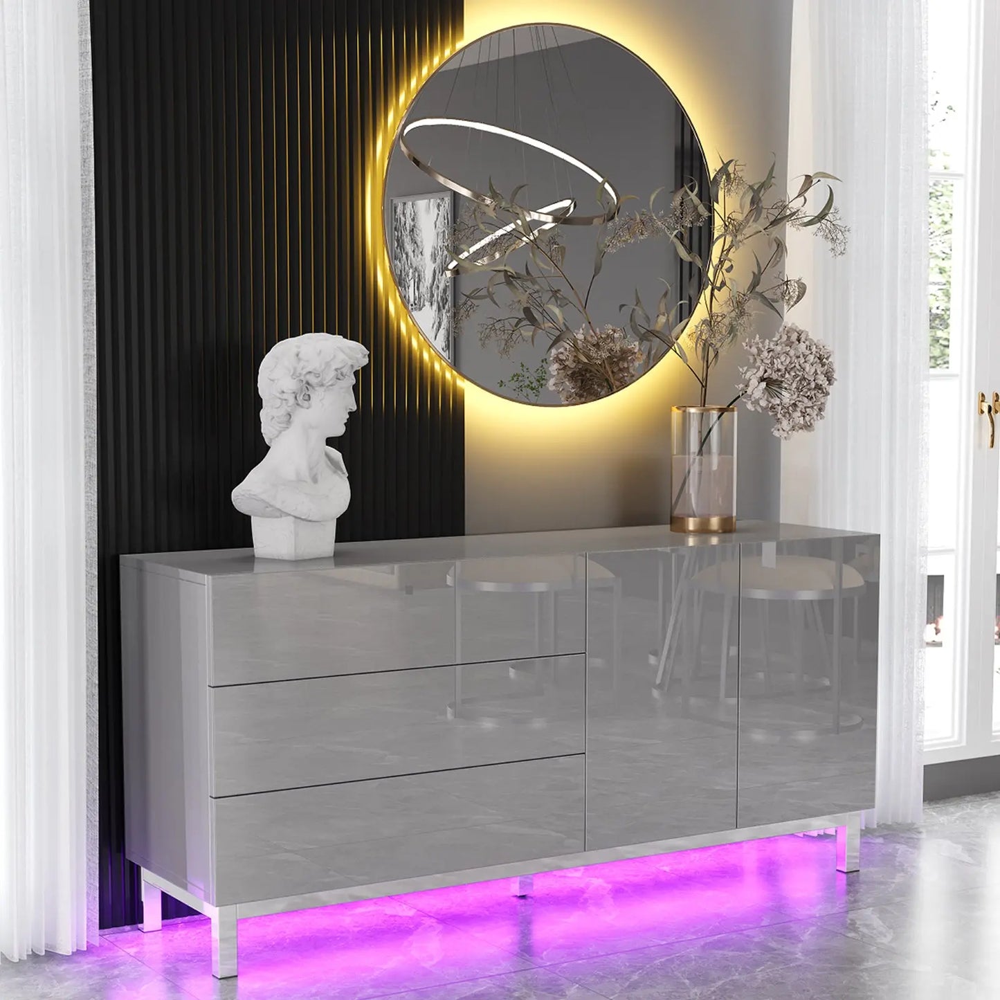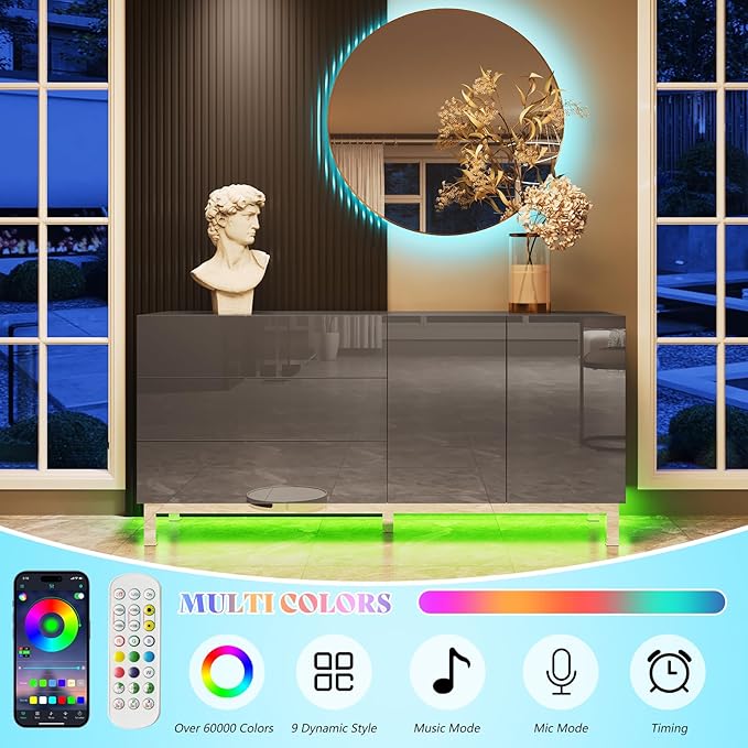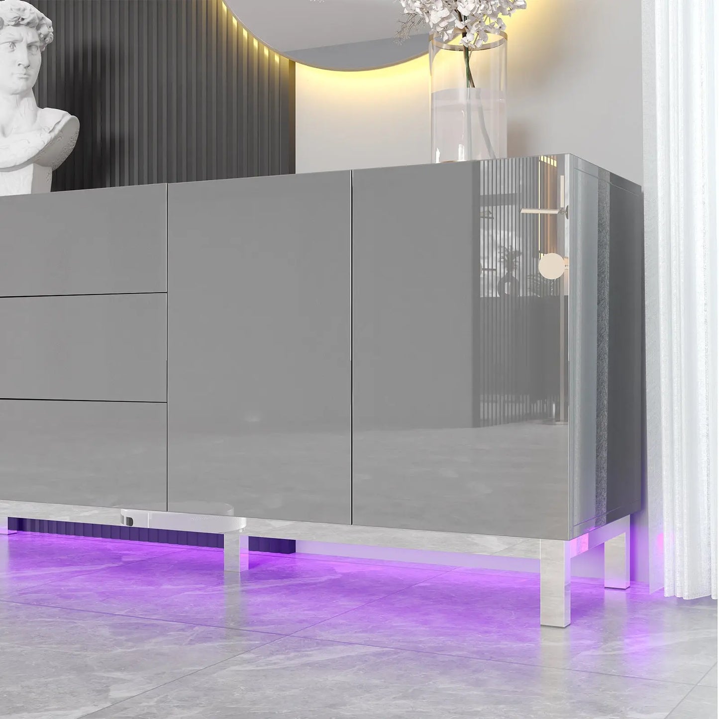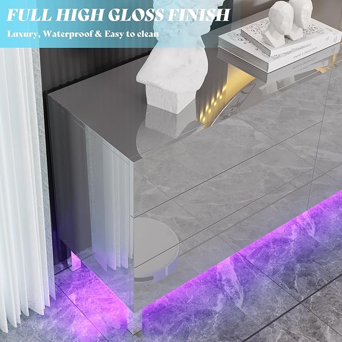 Elevate your space with the Verona 63" High Gloss Buffet. High gloss electroplated finish add a modern touch to any room. Stay organized with magnetic doors & drawers, and create ambiance with built-in LED lights. Perfect for living rooms, dining rooms, or entryways.