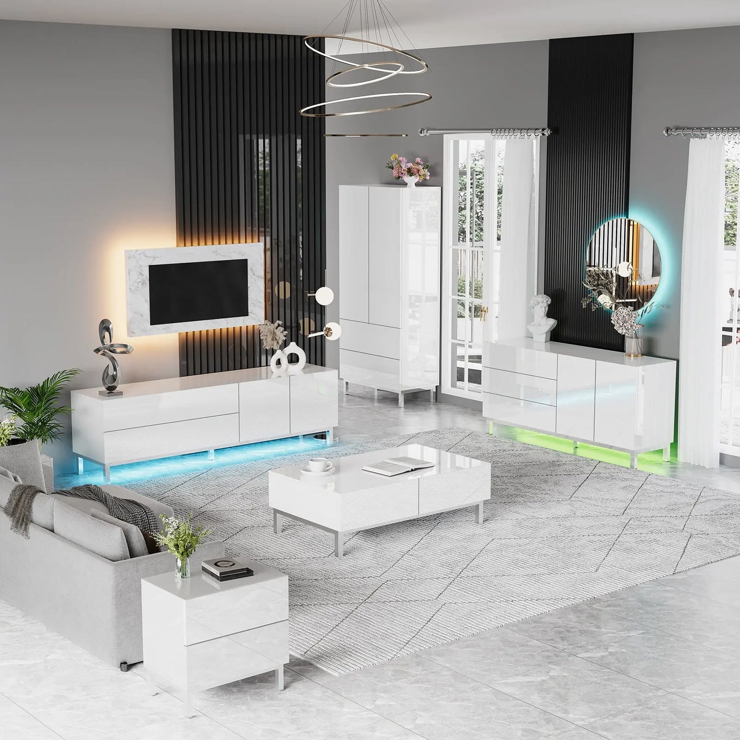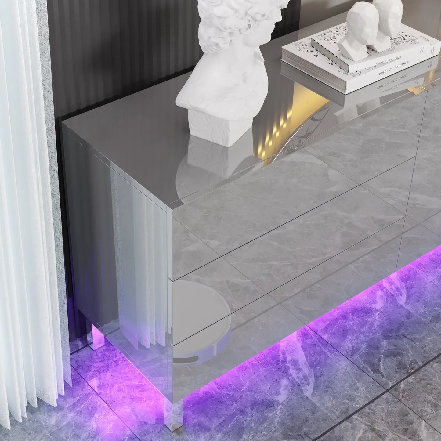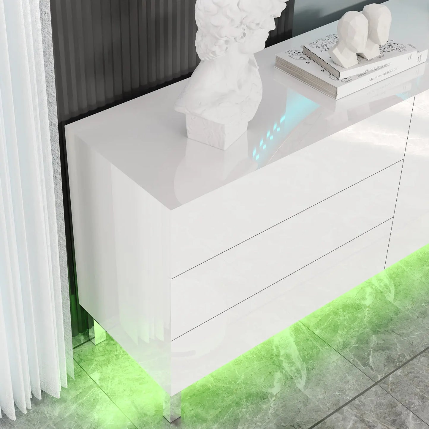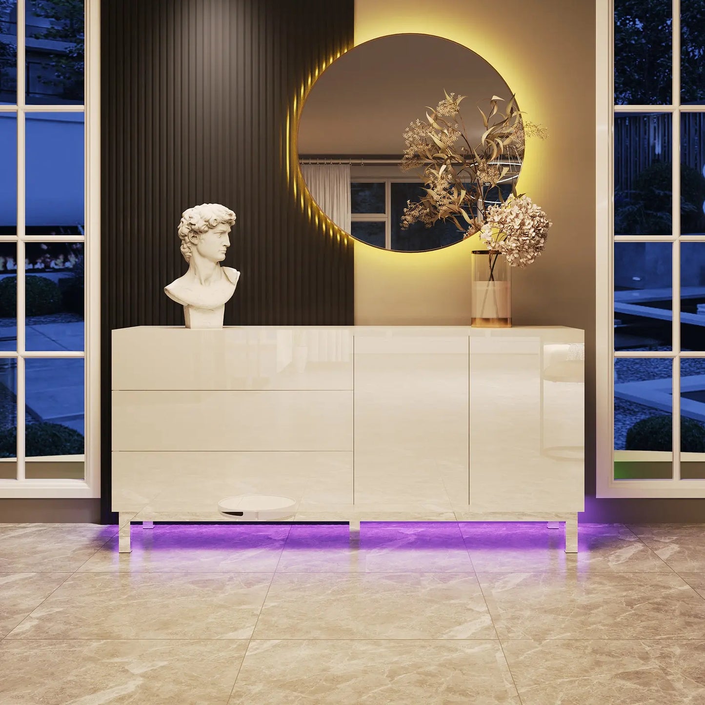 Elevate your space with the Verona 63" High Gloss Buffet. High gloss electroplated finish add a modern touch to any room. Stay organized with magnetic doors & drawers, and create ambiance with built-in LED lights. Perfect for living rooms, dining rooms, or entryways.
