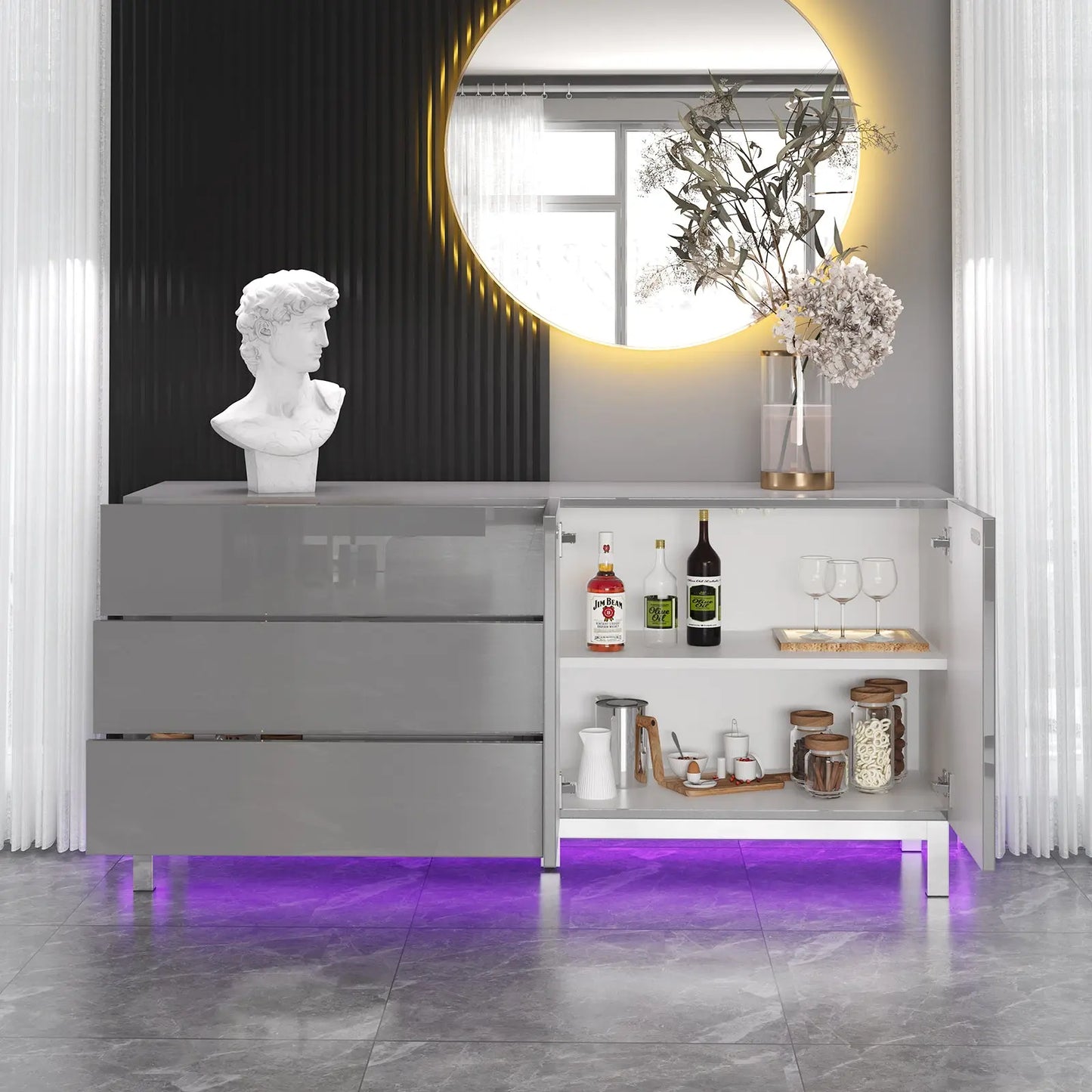 Stunning buffet cabinet covered by gorgeous full highlight finish, synonymous with quality & luxury, brings a comprehensive modern aesthetic to your room