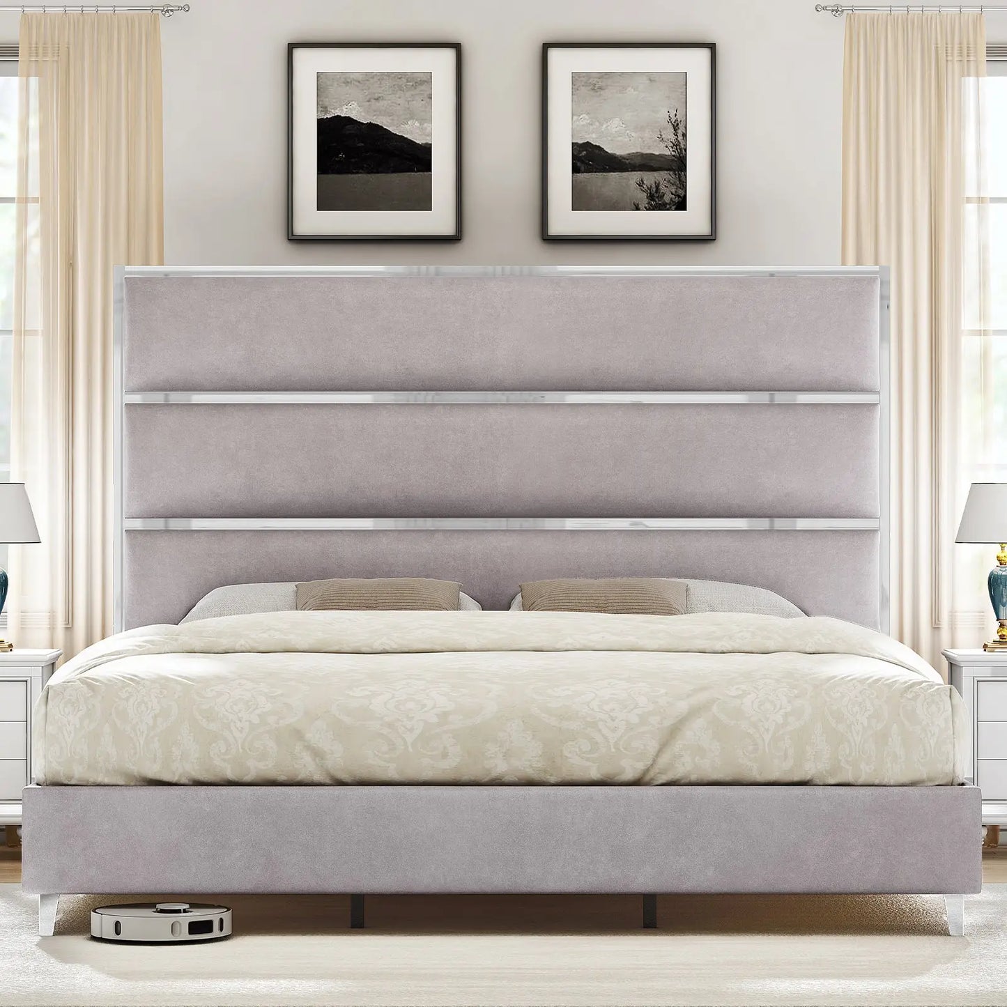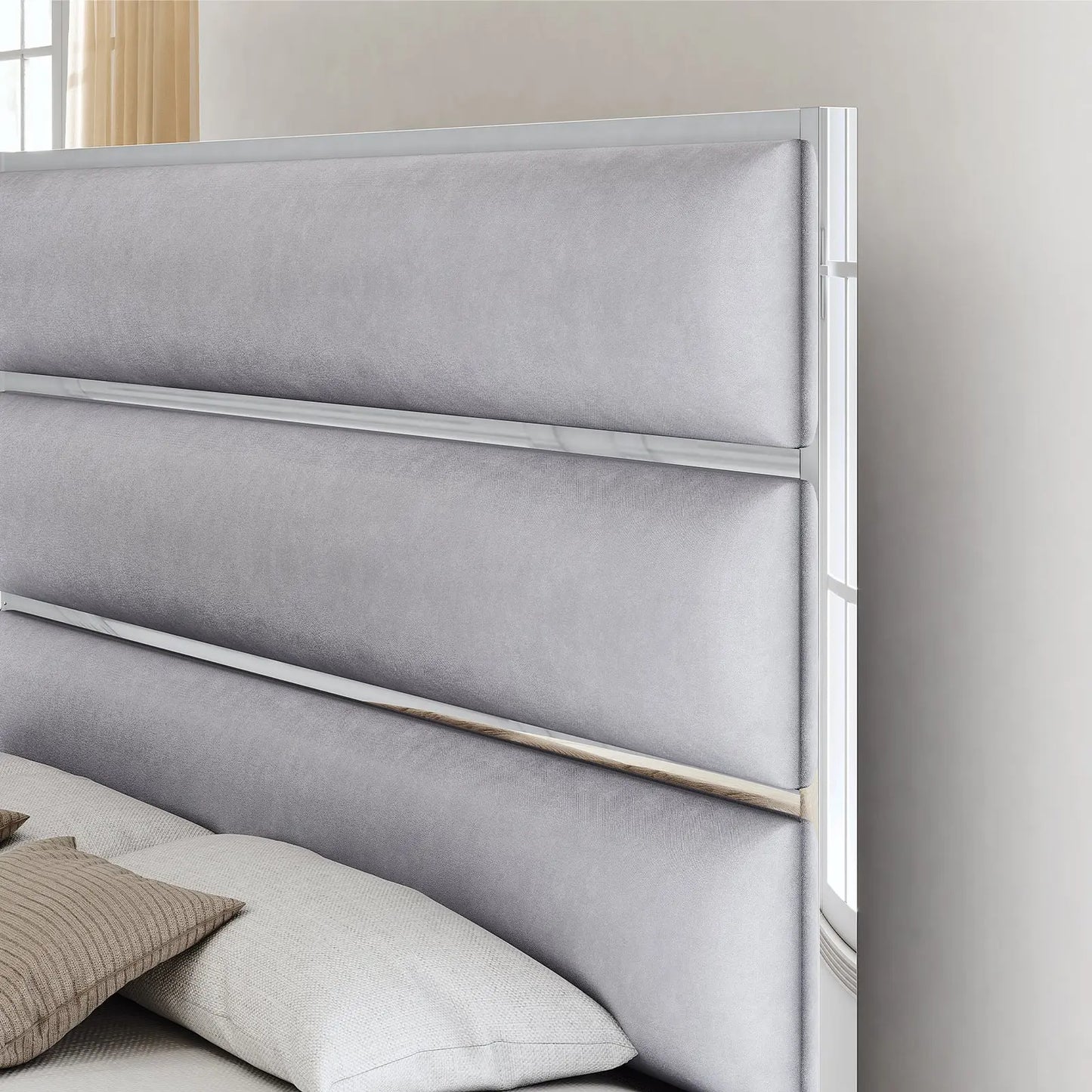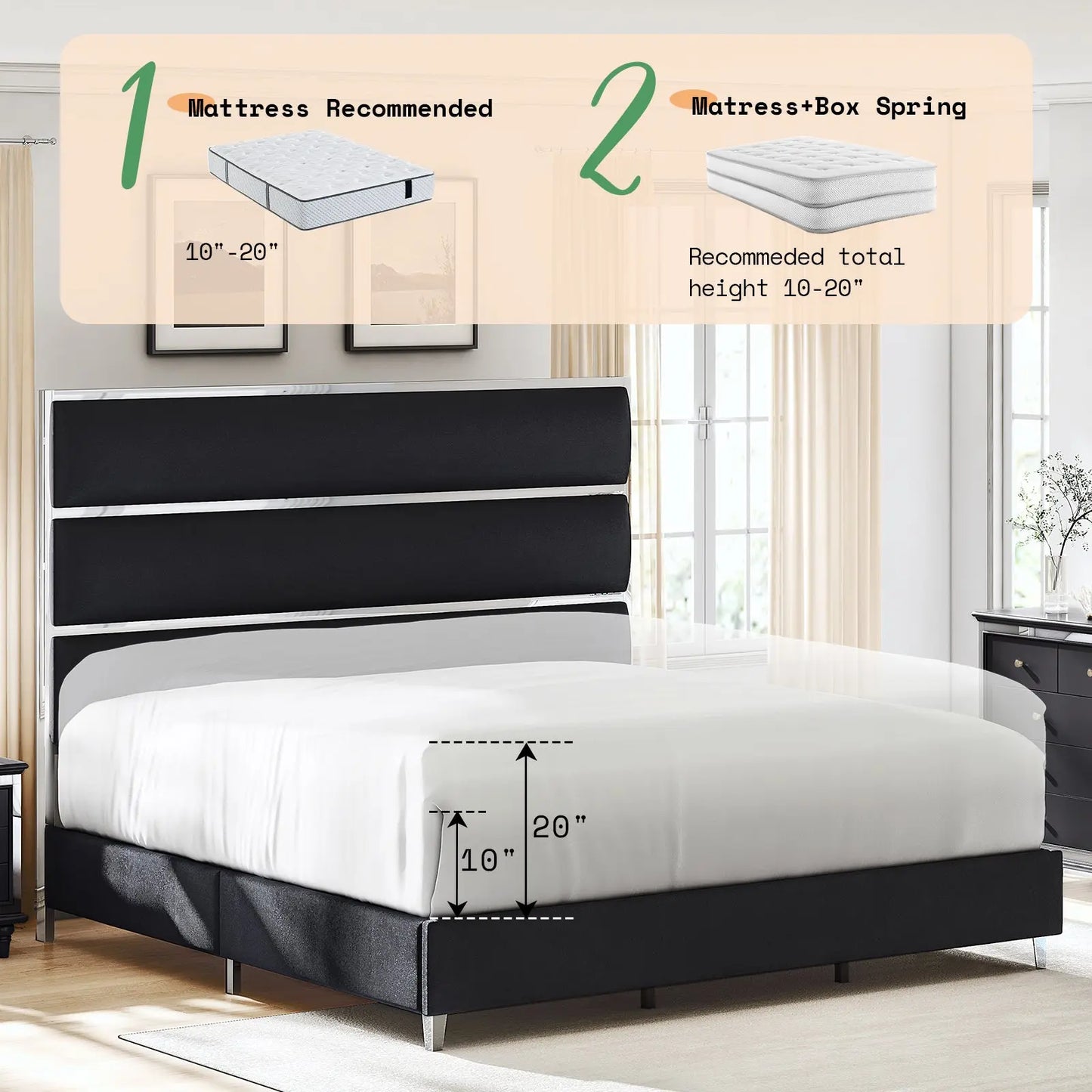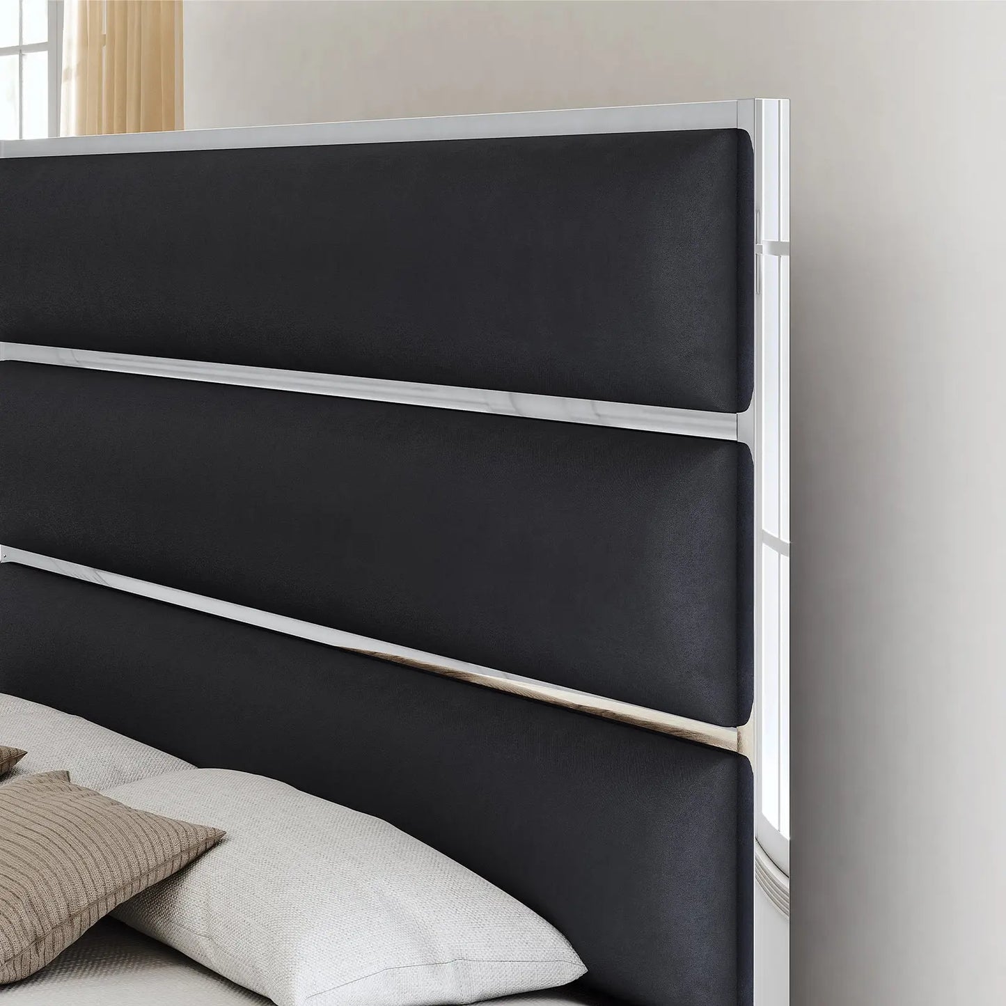 Unique reflective chrome frame supports velvet headboard, modern and elegant, stealing spotlight in your bedroom decor.