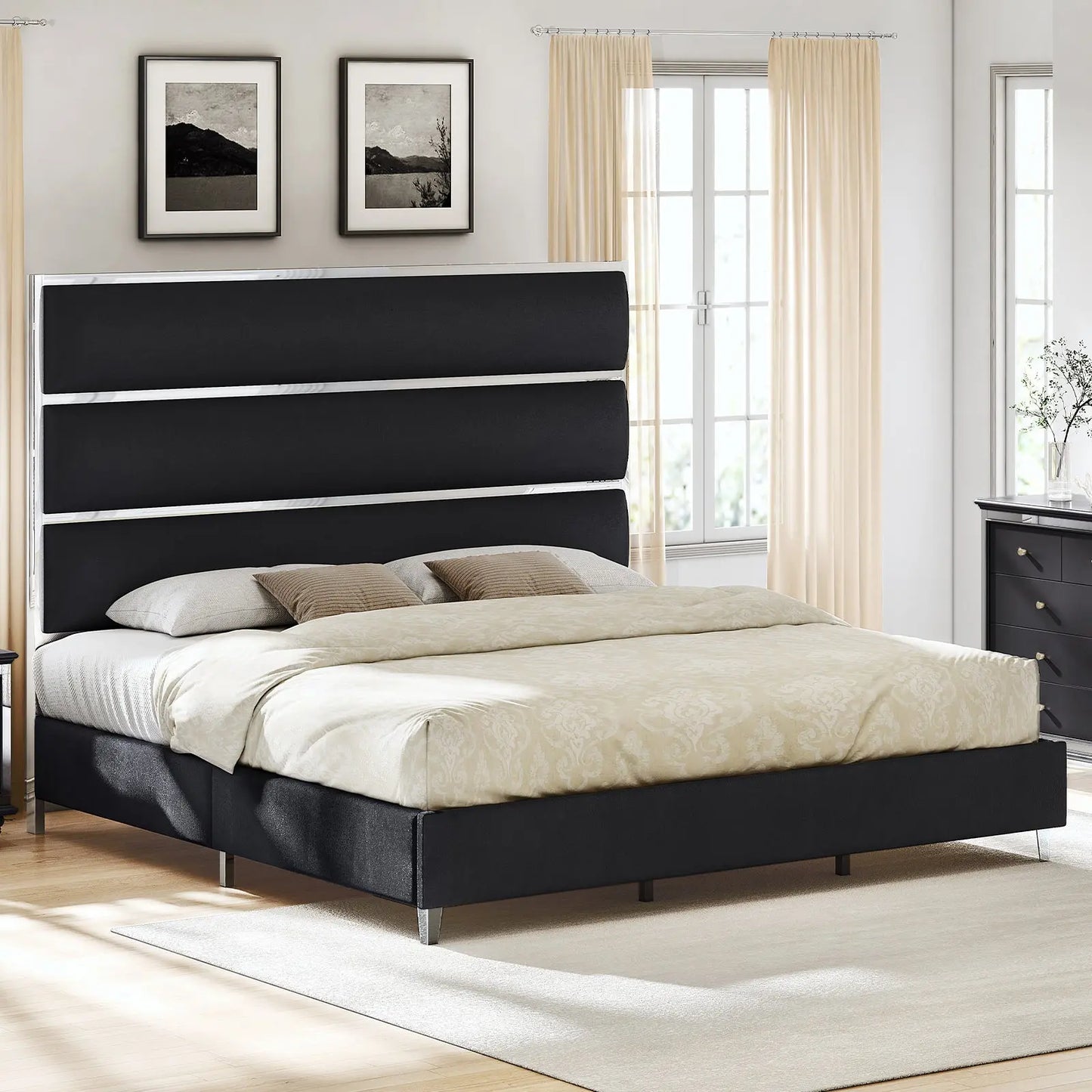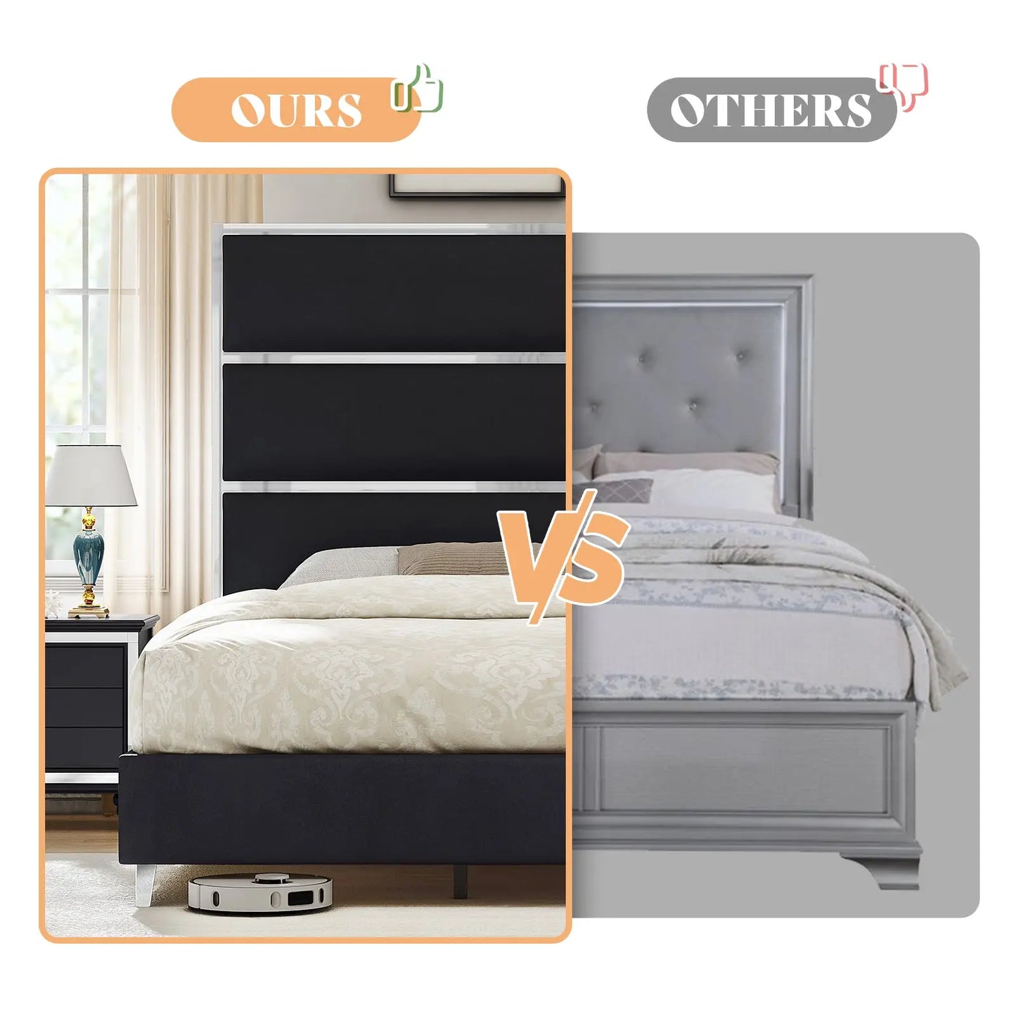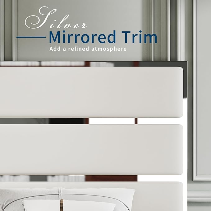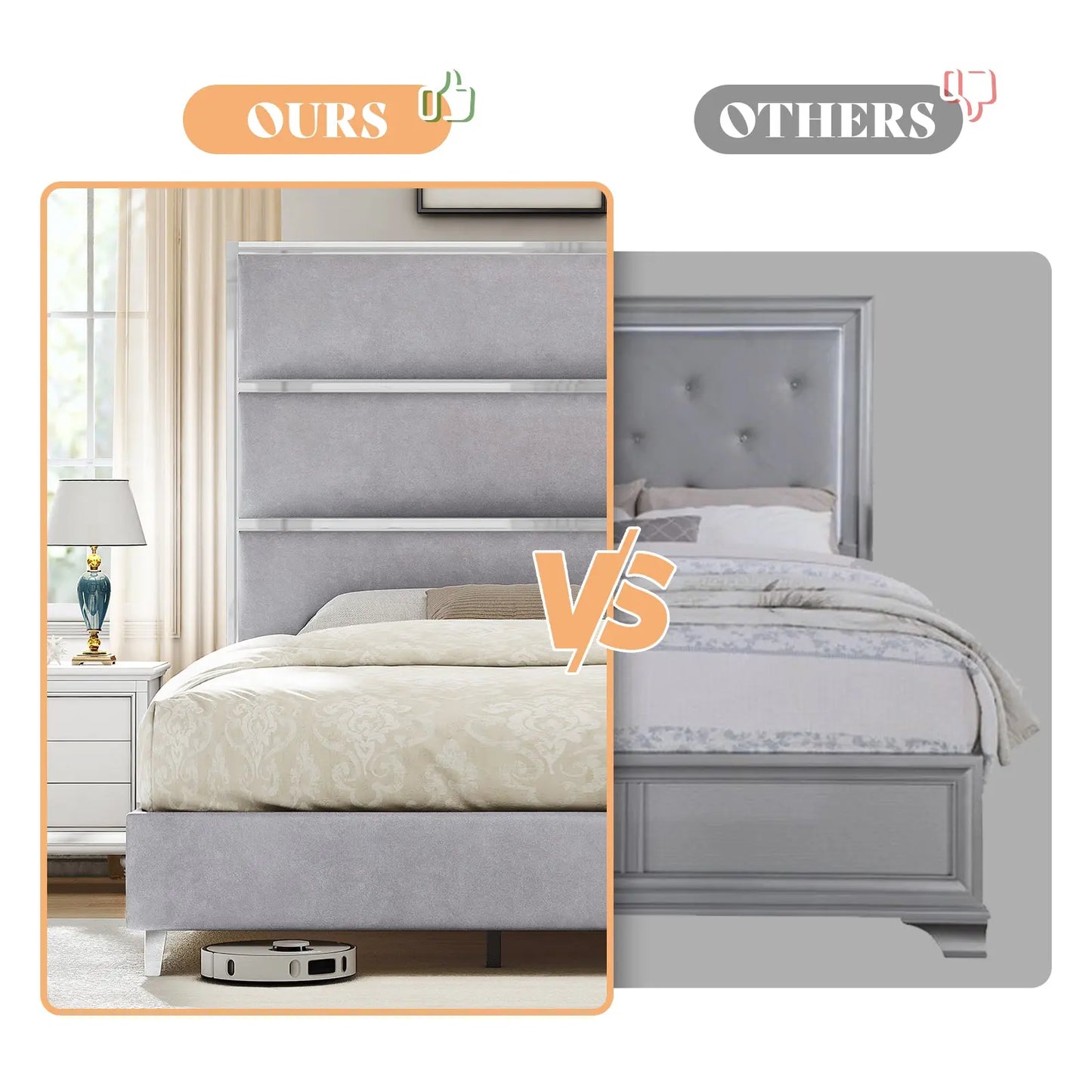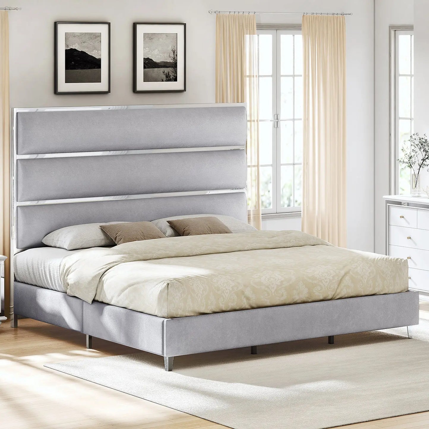 Unique reflective chrome frame supports velvet headboard, modern and elegant, stealing spotlight in your bedroom decor.