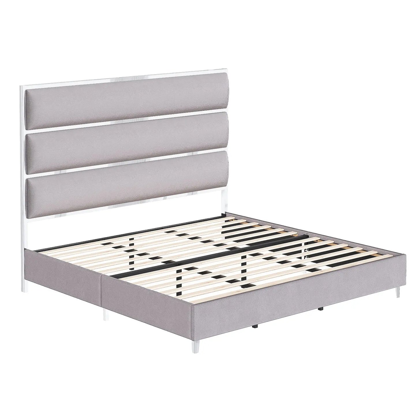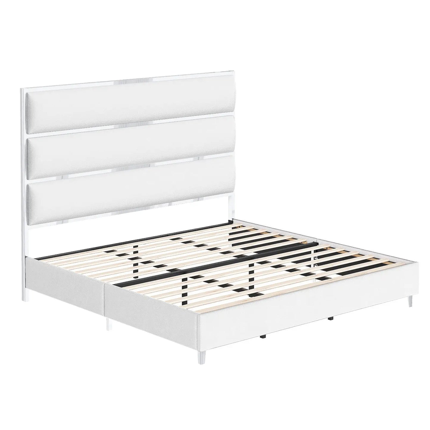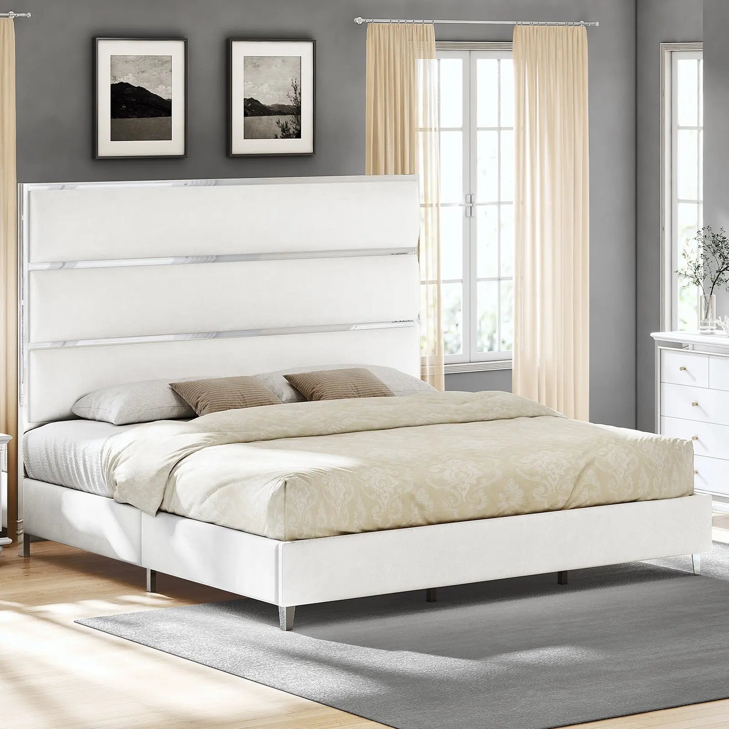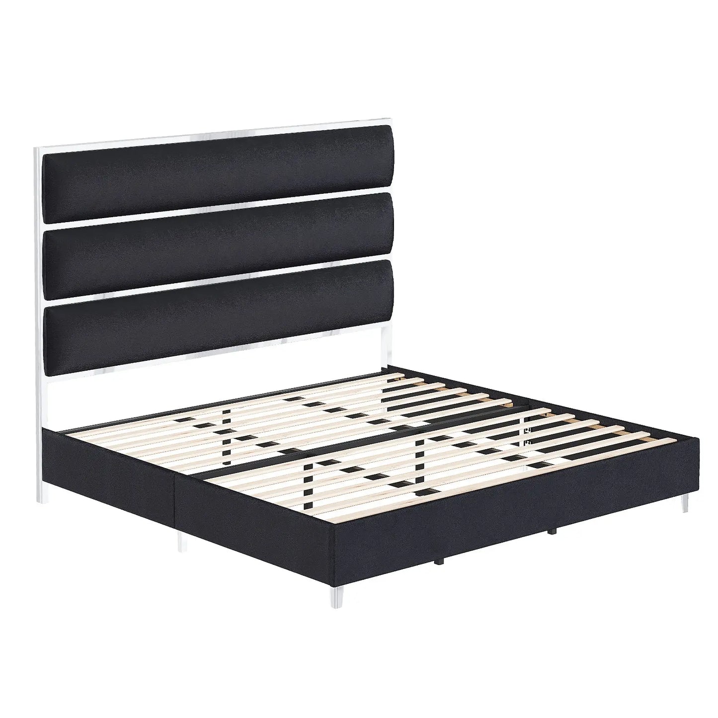 Unique reflective chrome frame supports velvet headboard, modern and elegant, stealing spotlight in your bedroom decor.
